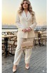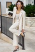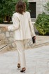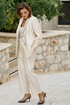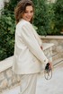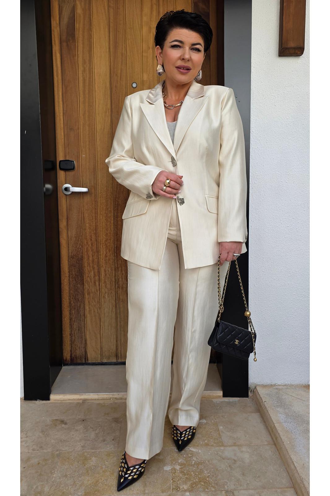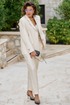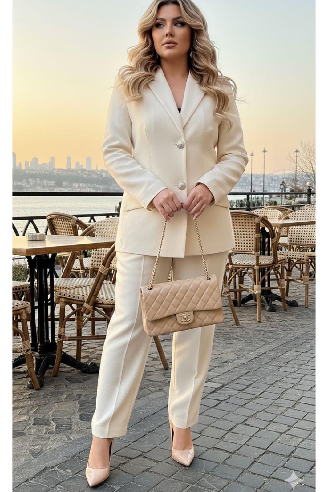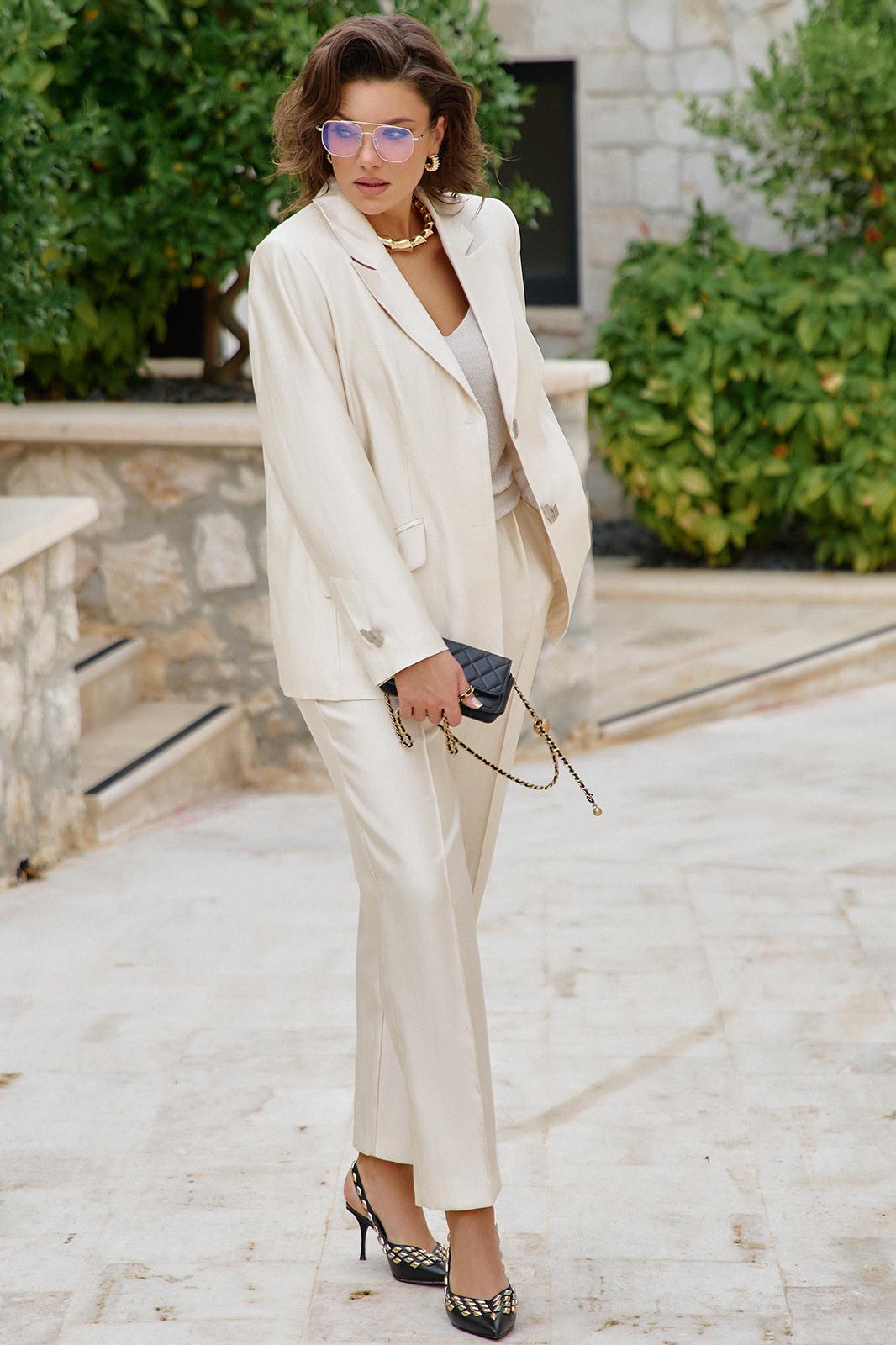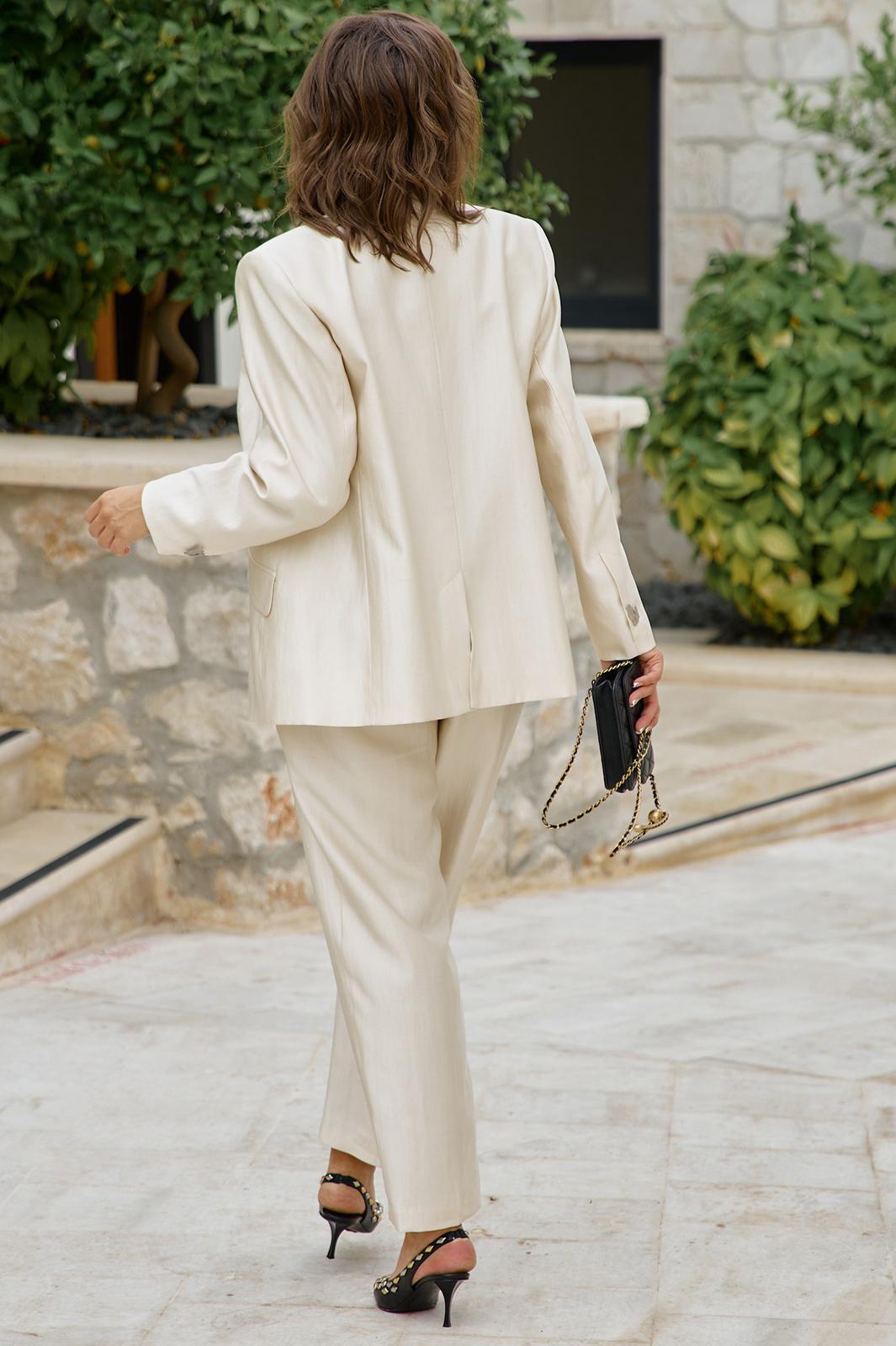Ткань с мерцающим отливом, не кричащим, а лишь намёком напоминающим о вечернем свете. Это костюм для женщины, которая ценит безупречность линий, но не боится лёгкого сияния. Он струится по фигуре, как жидкий шёлк, переливаясь при каждом движении — элегантный, сдержанный, но не лишённый изысканной роскоши. Жакет свободного силуэта с центральной застёжкой на петлю-пуговицу по краю борта, отложными лацканами и воротником пиджачного типа и отрезными бочками. По переду жакета талиевые вытачки и прорезные карманы с клапаном. Спинка в жакете со средним швом заканчивающимся отлетной шлицей. Рукав втачной, длинный, двухшовный с декоративной шлицей фиксирующейся на декоративную пуговицу. Жакет на подкладке. Брюки прямого силуэта с застроченными стрелками по переду, с застежкой на тесьму молнию в гульфике и пуговицу в поясе. По переду брюк наклонные карманы. Пояс притачной с декоративными шлёвками и вставкой эластичной тесьмы резинки в «бочках», что обеспечивает комфортную посадку на фигуру. Обращаем Ваше Внимание, что фурнитура может незначительно отличаться от фото. Длина жакета по спинке 72 см. Длина рукава жакета 62 см. Длина брюк по боковому шву 98 см.