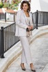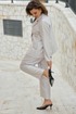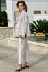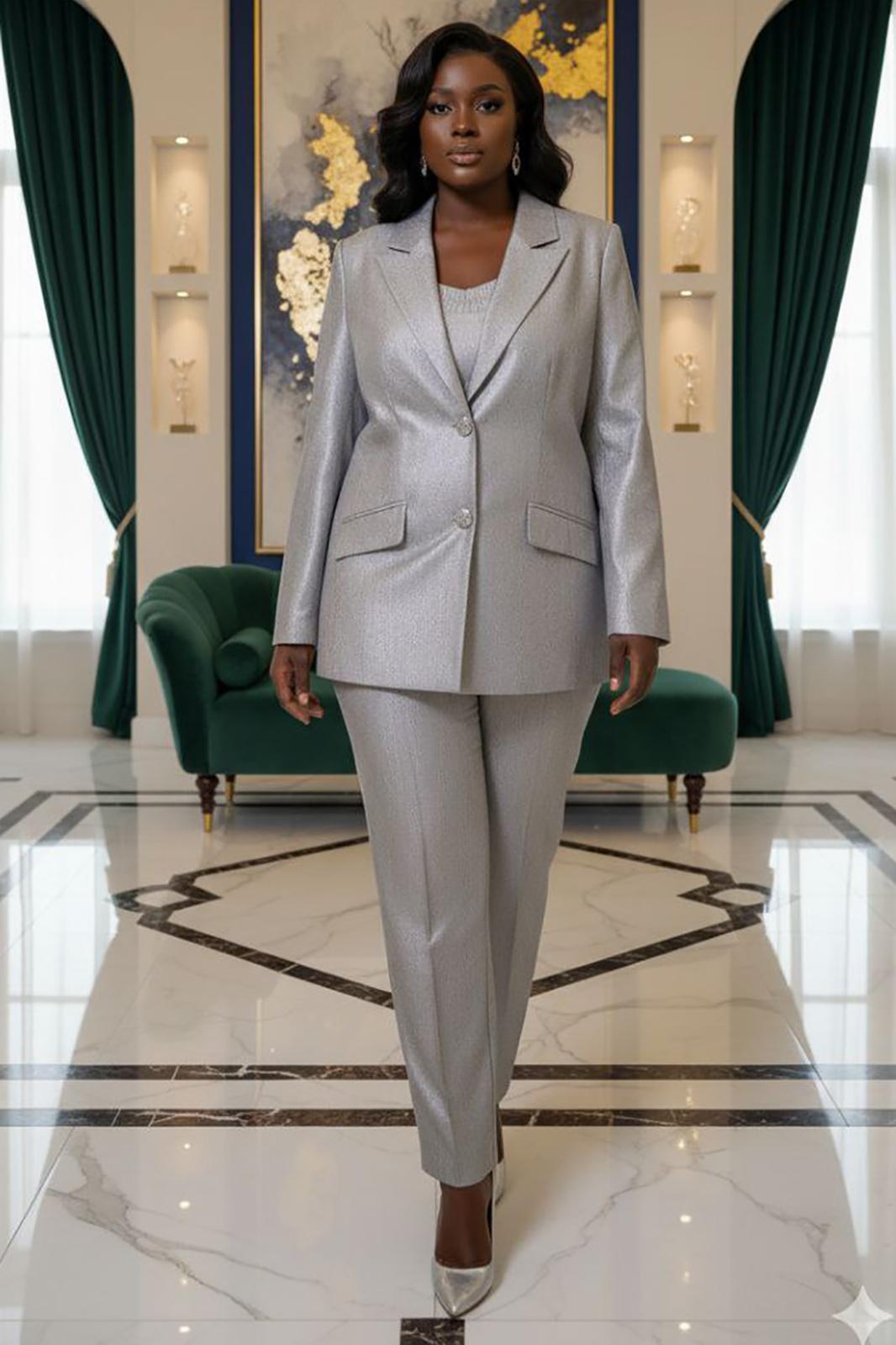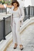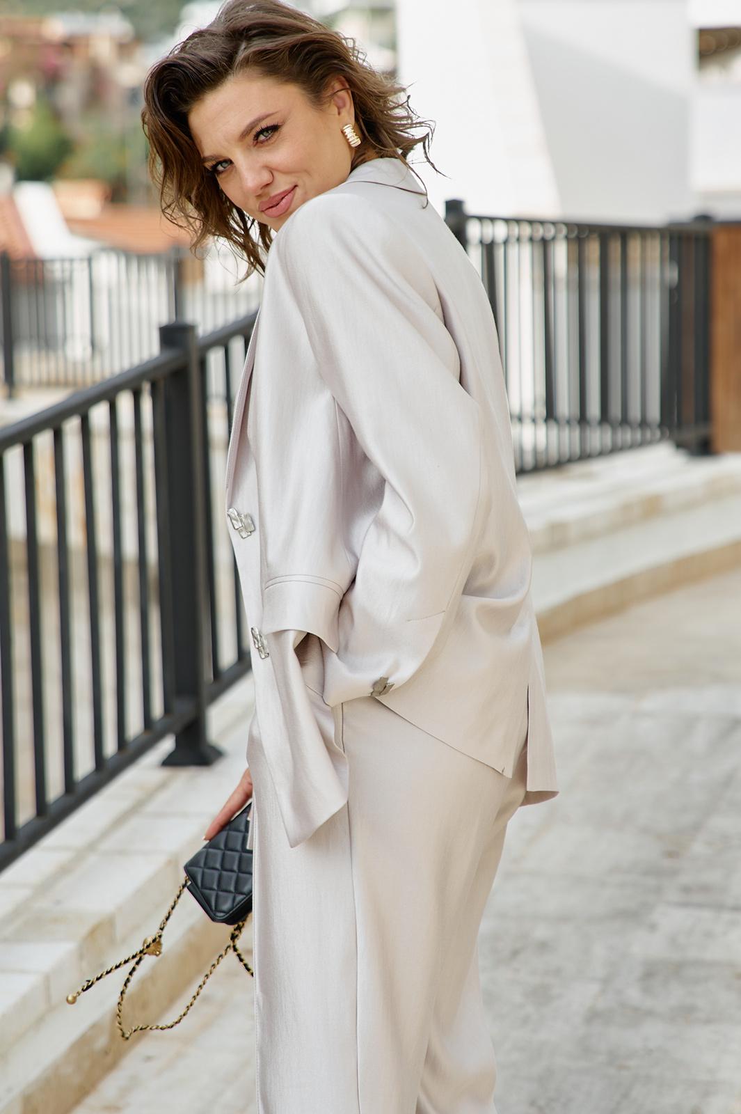 Ткань с мерцающим отливом, не кричащим, а лишь намёком напоминающим о вечернем свете. Это костюм для женщины, которая ценит безупречность линий, но не боится лёгкого сияния. Он струится по фигуре, как жидкий шёлк, переливаясь при каждом движении — элегантный, сдержанный, но не лишённый изысканной роскоши. Жакет свободного силуэта с центральной застёжкой на петлю-пуговицу по краю борта, отложными лацканами и воротником пиджачного типа и отрезными бочками. По переду жакета талиевые вытачки и прорезные карманы с клапаном. Спинка в жакете со средним швом заканчивающимся отлетной шлицей. Рукав втачной, длинный, двухшовный с декоративной шлицей фиксирующейся на декоративную пуговицу. Жакет на подкладке. Брюки прямого силуэта с застроченными стрелками по переду, с застежкой на тесьму молнию в гульфике и пуговицу в поясе. По переду брюк наклонные карманы. Пояс притачной с декоративными шлёвками и вставкой эластичной тесьмы резинки в «бочках», что обеспечивает комфортную посадку на фигуру. Обращаем Ваше Внимание, что фурнитура может незначительно отличаться от фото. Длина жакета по спинке 72 см. Длина рукава жакета 62 см. Длина брюк по боковому шву 98 см.