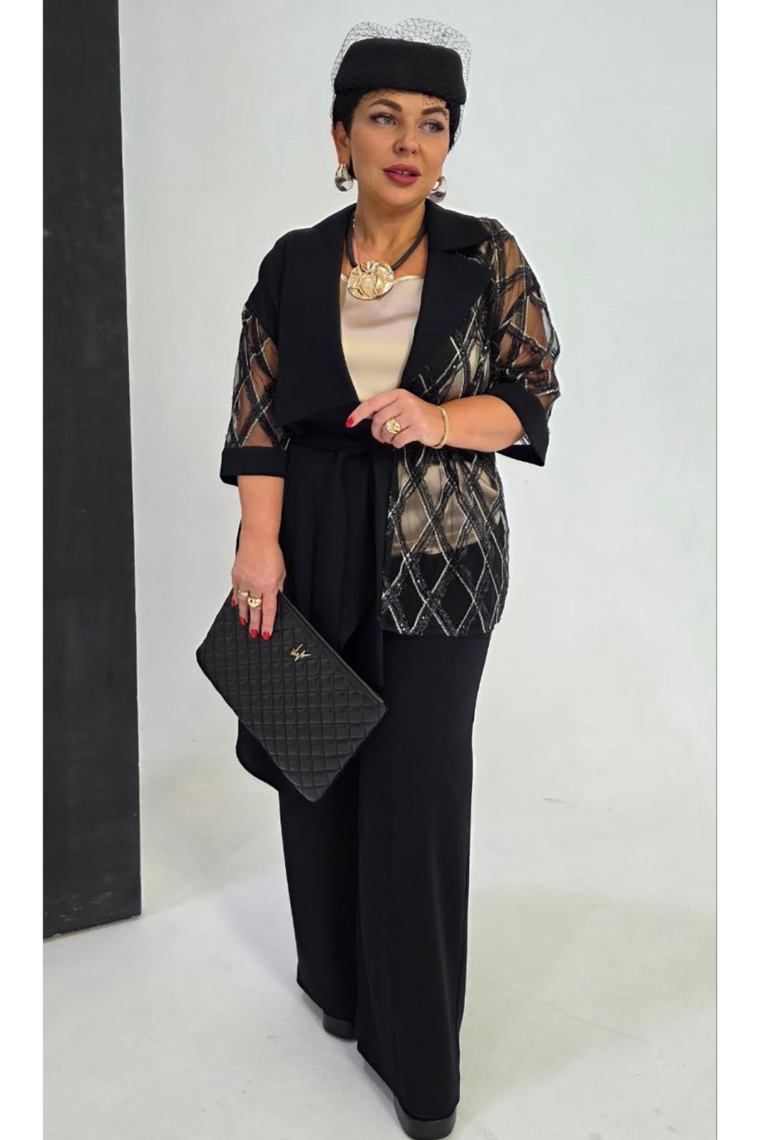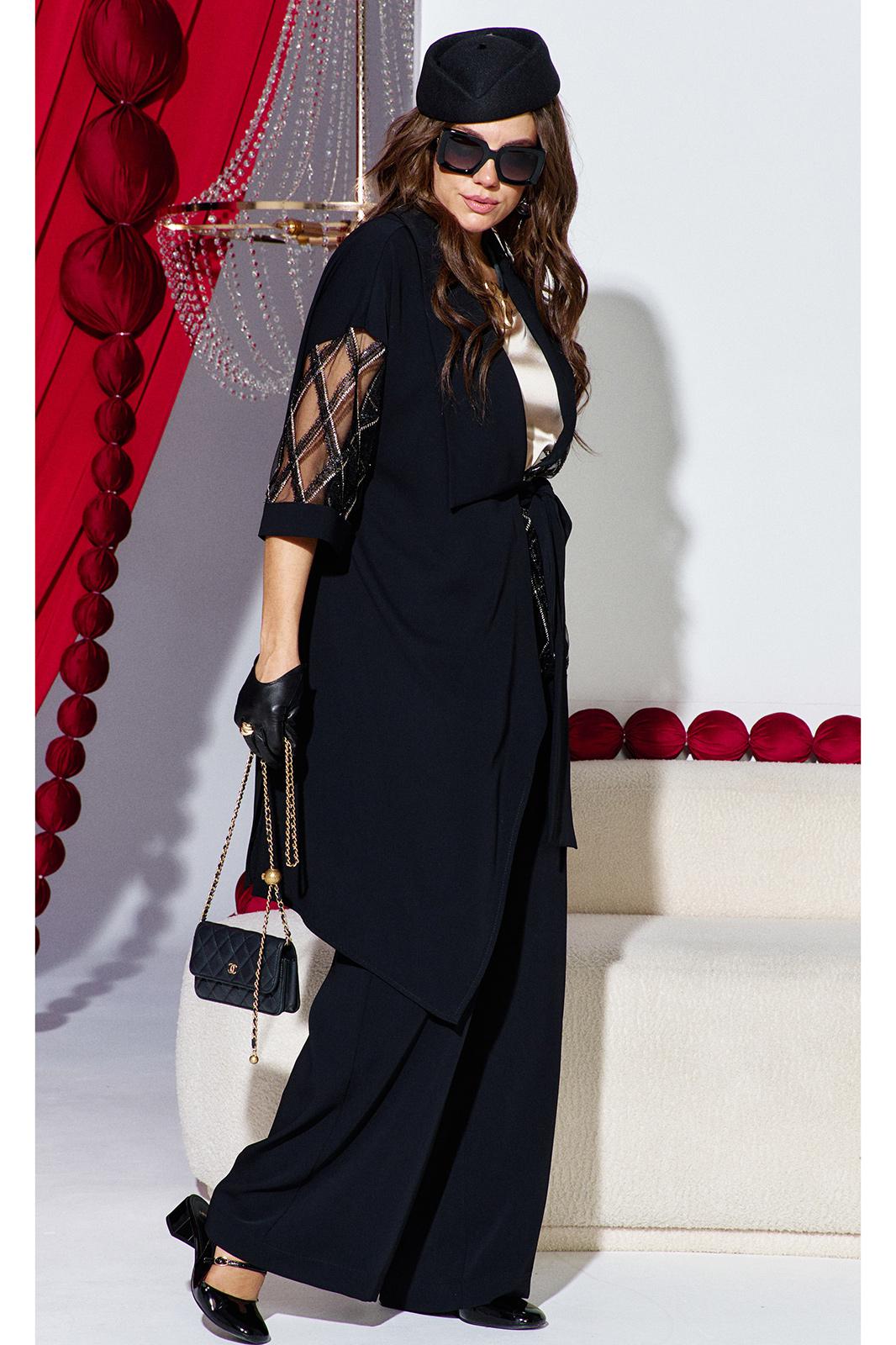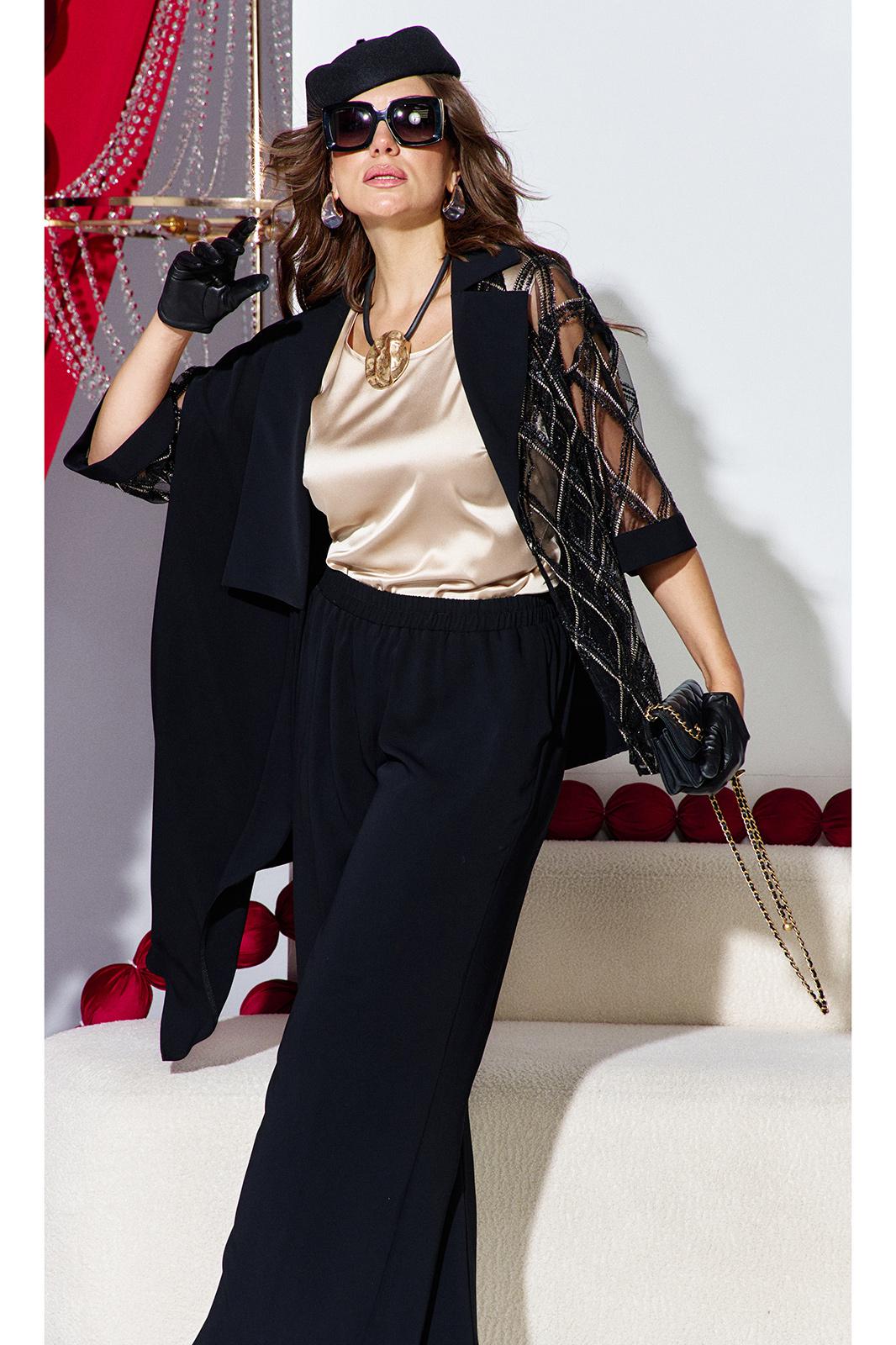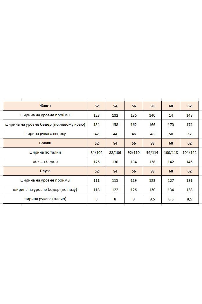 Комплект женский брючный, состоящий из жакета, блузы и брюк. Если Вы ищете идеальное сочетание стиля и комфорта, вот идеальный выбор. Мы специально подобрали качественную и тактильно приятную ткань, которая хорошо держит свою форму, создавая ощущение легкости и свободы движения. Оригинальный асимметричный крой, помноженный на пластические свойства ткани подчеркнет все, что нужно подчеркнуть, и скроет все, что нужно скрыть. Жакет свободного силуэта, ассиметричного кроя создан на контрастах глубокого черного цвета и полупрозрачной отделочной ткани. Жакет на запах, с ассиметричным воротником пиджачного типа и ассиметричным низом. Линия плеча спущенная, рукав втачной, длиной ¾ из полупрозрачной отделочной ткани с притачной манжетой по низу. Спинка в жакете со средним швом. В комплекте идёт пояс. Блуза прямого силуэта с округлой формой горловины и нагрудными вытачками по полочке. Спинка без особенностей. Низ в блузе фигурной формы. Брюки прямого силуэта, длинные. Пояс в брюках притачной на эластичной тесьме-резинке. По переду брюк прорезные карманы. Длина жакета по спинке 73,5 см (р 50-54), 74,5 см (р 56-60), длина рукава 27,5 см. Длина брюк по боковому шву 108 см. Длина блузы по спинке 63 см, длина рукава (плечо) 8 см (р 50-54), 8,5 см (р 56-60).
