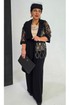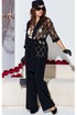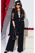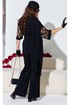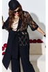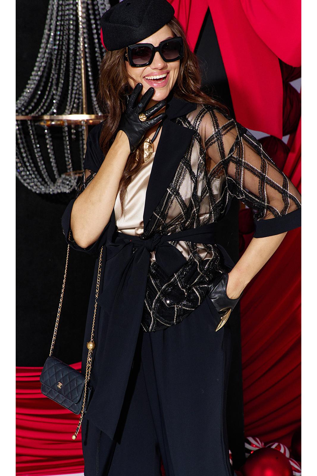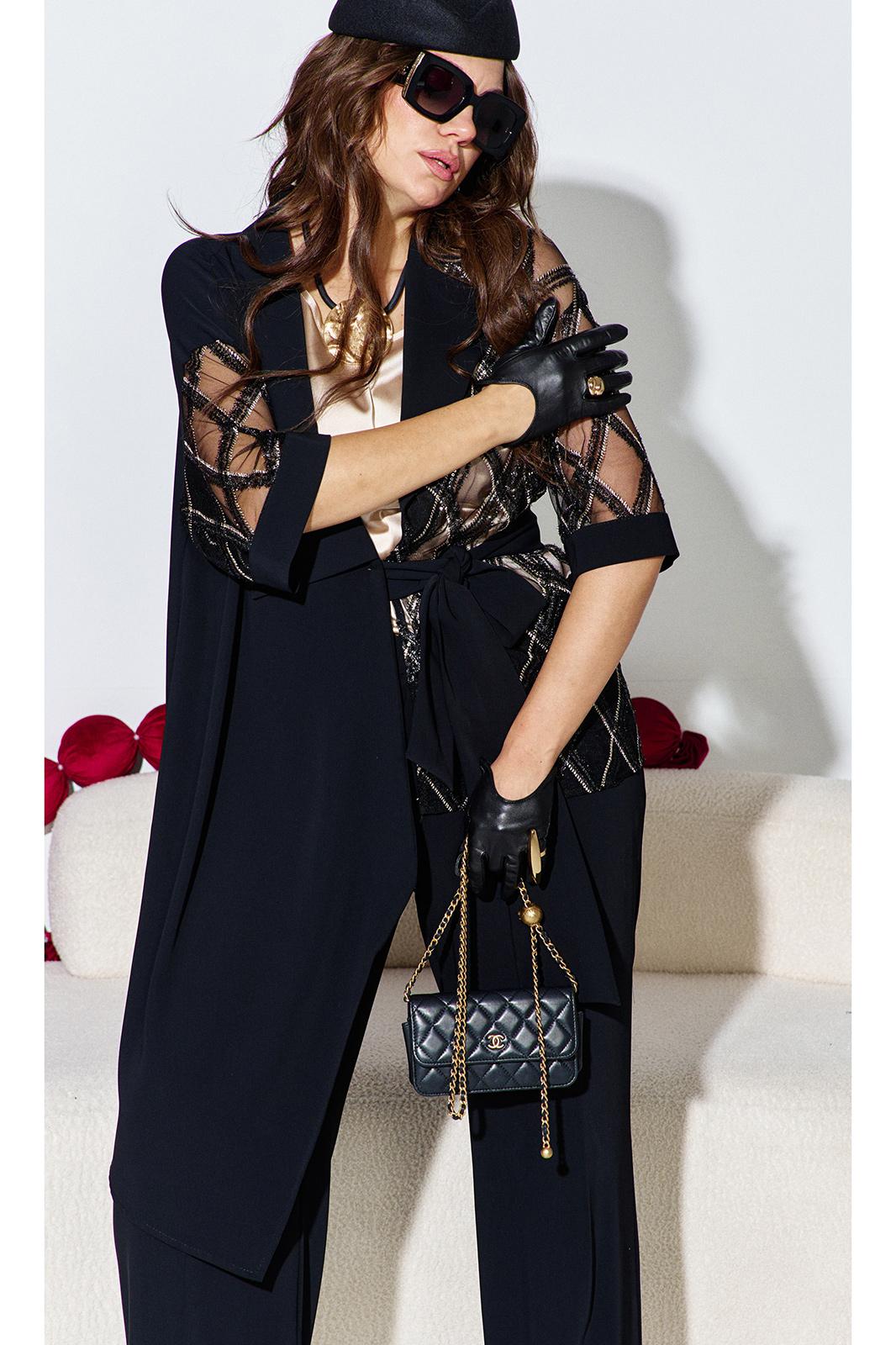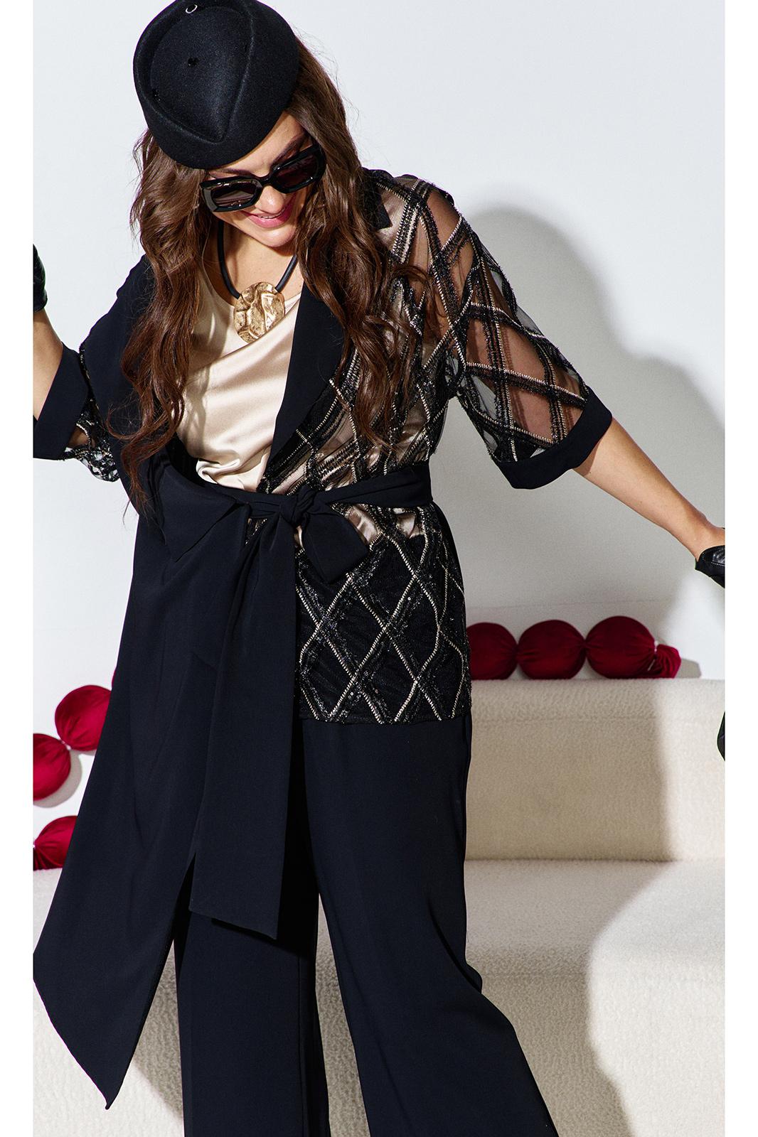 Комплект женский брючный, состоящий из жакета, блузы и брюк. Если Вы ищете идеальное сочетание стиля и комфорта, вот идеальный выбор. Мы специально подобрали качественную и тактильно приятную ткань, которая хорошо держит свою форму, создавая ощущение легкости и свободы движения. Оригинальный асимметричный крой, помноженный на пластические свойства ткани подчеркнет все, что нужно подчеркнуть, и скроет все, что нужно скрыть. Жакет свободного силуэта, ассиметричного кроя создан на контрастах глубокого черного цвета и полупрозрачной отделочной ткани. Жакет на запах, с ассиметричным воротником пиджачного типа и ассиметричным низом. Линия плеча спущенная, рукав втачной, длиной ¾ из полупрозрачной отделочной ткани с притачной манжетой по низу. Спинка в жакете со средним швом. В комплекте идёт пояс. Блуза прямого силуэта с округлой формой горловины и нагрудными вытачками по полочке. Спинка без особенностей. Низ в блузе фигурной формы. Брюки прямого силуэта, длинные. Пояс в брюках притачной на эластичной тесьме-резинке. По переду брюк прорезные карманы. Длина жакета по спинке 73,5 см (р 50-54), 74,5 см (р 56-60), длина рукава 27,5 см. Длина брюк по боковому шву 108 см. Длина блузы по спинке 63 см, длина рукава (плечо) 8 см (р 50-54), 8,5 см (р 56-60).
