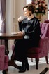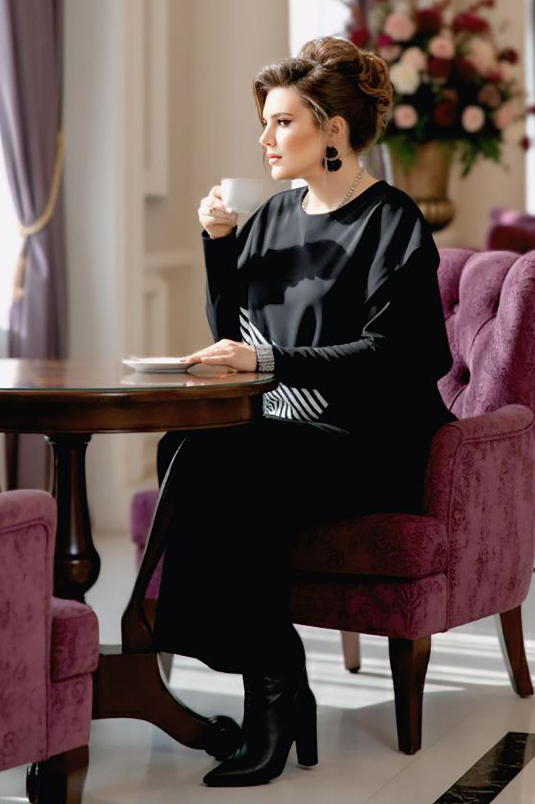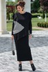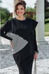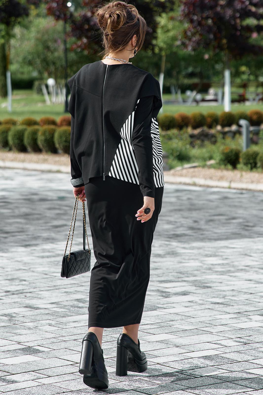 Комплект женский, состоящий из джемпера и платья. Асимметричный джемпер, объемный, его оверсайз-силуэт делает образ дерзким и одновременно изысканным. Горловина округлой формы, линия плеча спущена, линия проймы углублённая. По переду джемпера декоративная отлетная складка, фигурный подрез со вставкой из отделочной ткани в полоску преходящая на спинку. Низ завершает отлетная деталь — неструктурированный волан, который живет своей жизнью, колышется при каждом шаге, добавляя динамики и легкости массивному верху. Он не пришит намертво, он «отлетает», создавая ощущение незавершенности и художественного хаоса. Спинка в джемпере с застёжкой на декоративную тесьму молнию в среднем шве, декоративным подрезом. Низ спинки джемпера фигурной формы. Платье прилегающего силуэта, длины миди. Горловина округлой формы. Рукав в платье втачной. Спинка без особенностей. Длина миди и длинные рукава платья создают изящный и лаконичный силуэт.Длина платья 121 см (р.50-54), 121,5 см (р.56-60), длина рукава платья 64 см. Длина джемпера 55 см, длина по плечу 24,5 см (р.50-56), 26,5 см (р.56-60).