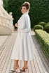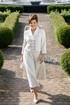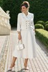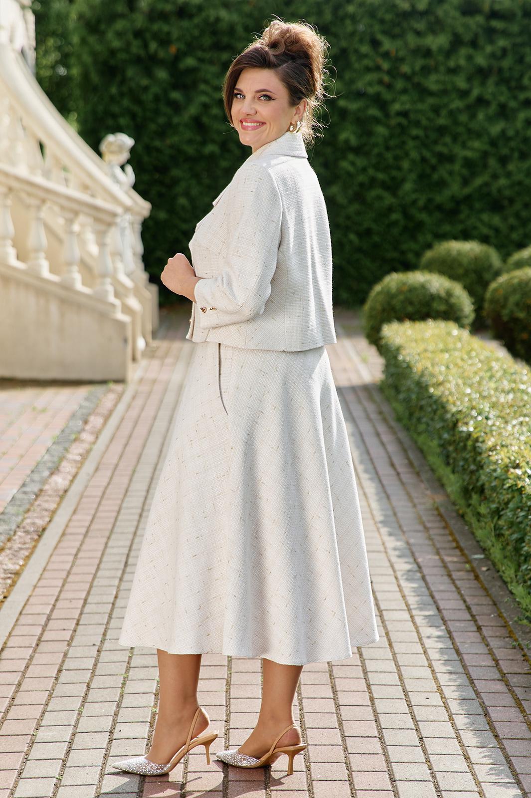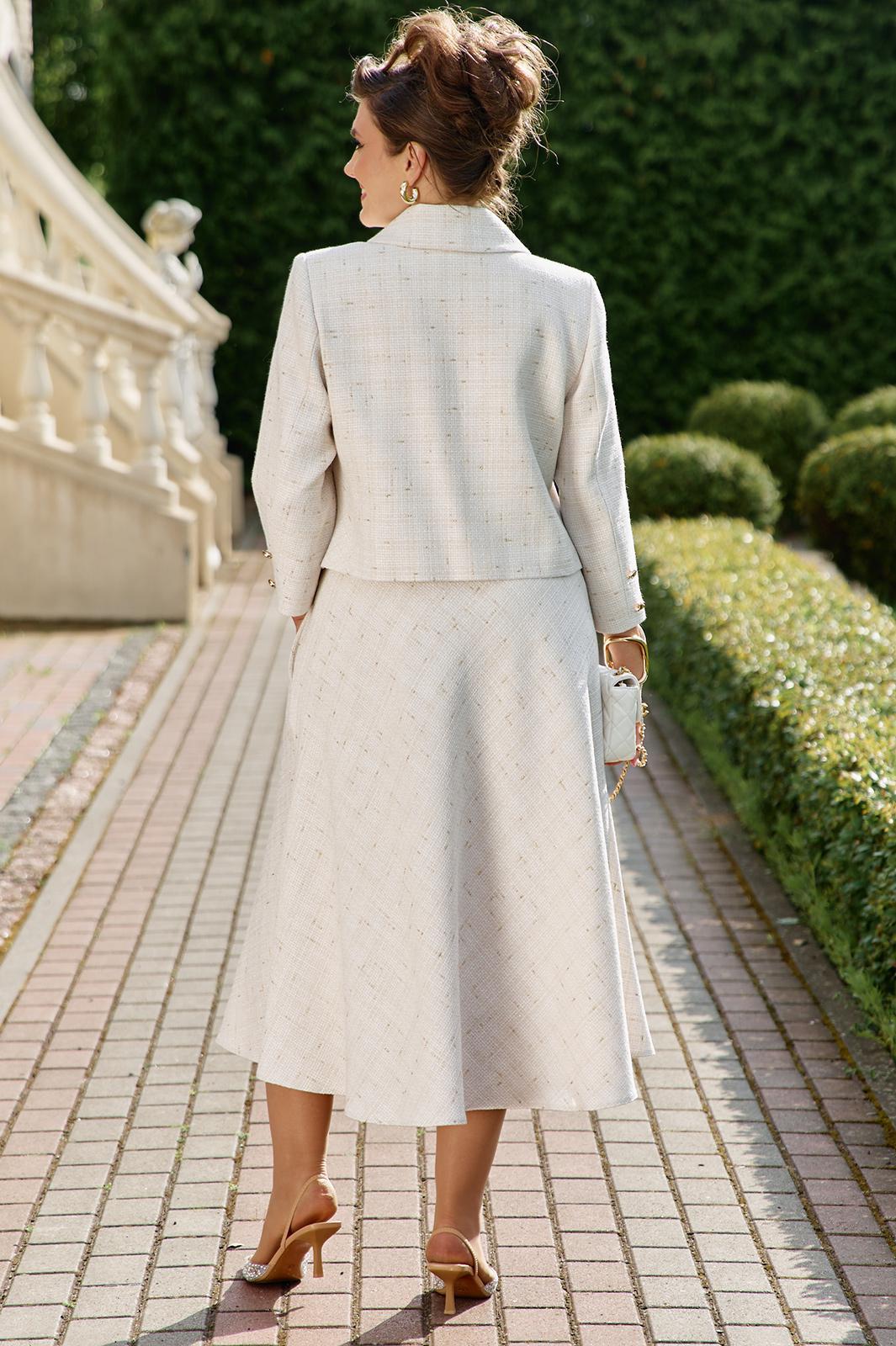 Безумно красивый и элегантный костюм в стиле «шанель». Костюм состоит из жакета и юбки. Жакет прилегающего силуэта, укороченный с двубортной застежкой на петли и пуговицы, воротник отложной с лацканами пиджачного типа с закругленными краями. В жакете отрезные бочки с разрезами по низу. Спинка без особенностей. Рукав втачной, одношовный, длинной 7/8. Жакет на подкладке. Юбка расклешенная с притачным поясом с резинкой по спинке, по переду наклонные карманы. В боковом шве юбки застёжка на потайную молнию и пуговицу в поясе. Юбка на подкладке. Обращаем Ваше внимание, что фурнитура может незначительно отличаться от фото.