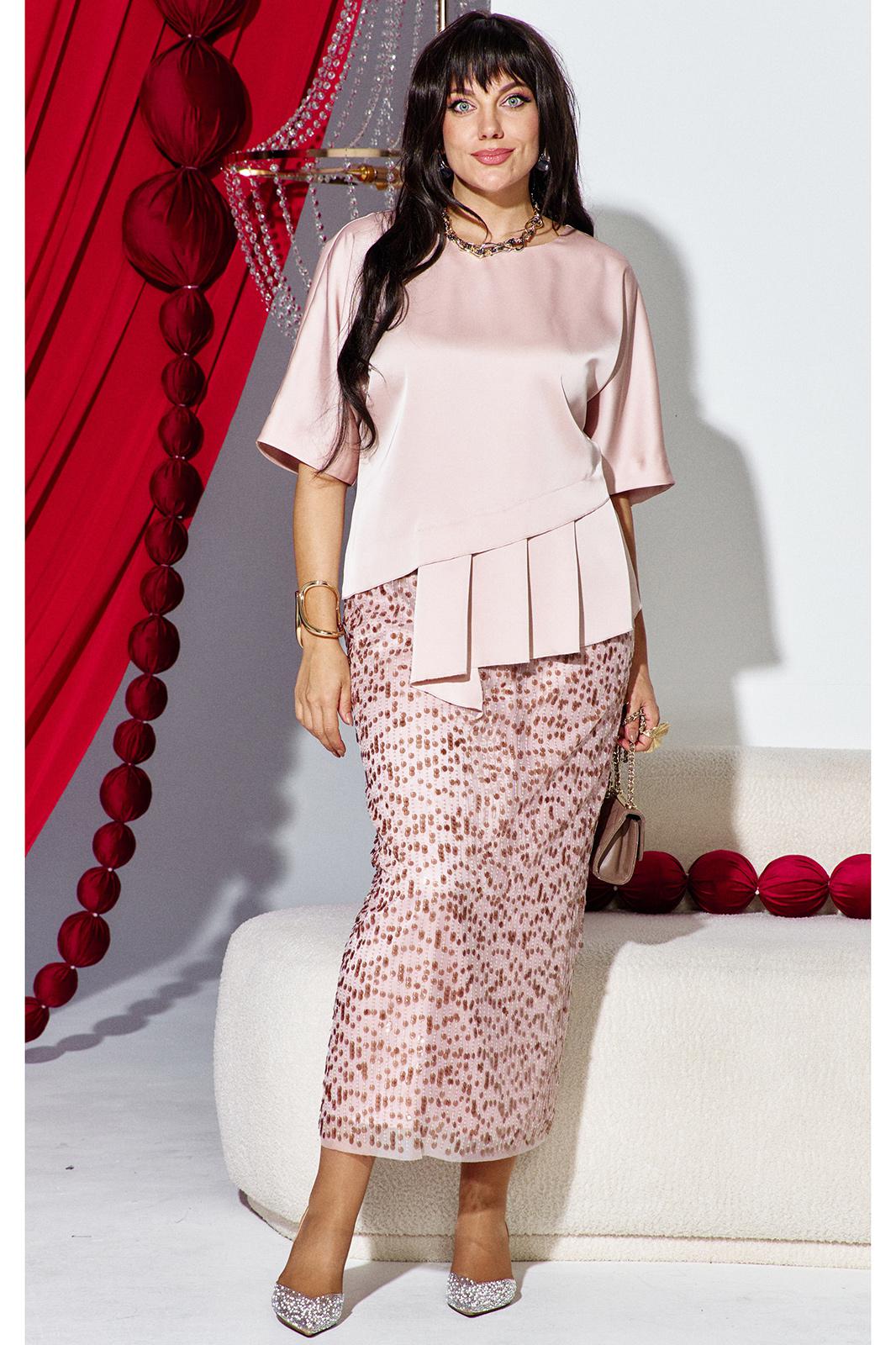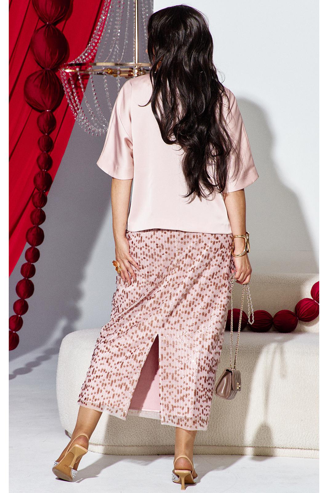 Комплект женский юбочный, состоящий из блузы и юбки. Комплект идеально подходит для вечерних торжеств, где важна каждая деталь, чтобы подчеркнуть изысканную женственность и уверенность в себе — светлый, элегантный и чуть волнующий наряд, который оставляет за собой шепот восхищения. Сочетание матового атласа и зеркального блеска пайеток создает идеальный дуэт. Блуза свободного силуэта, горловина округлой формы. По переду джемпера декоративная отлетная складка, с воланом с заложенными декоративными складками, он живет своей жизнью, колышется при каждом шаге, добавляя динамики и легкости верху. Он не пришит намертво, он «отлетает», создавая ощущение незавершенности и художественного хаоса. Рукав в блузе цельнокроеный, длиной ¾. Спинка в блузе со средним швом. Низ в блузе ассиметричный. Юбка прямого силуэта, длины миди с притачным поясом с эластичной тесьмой-резинкой в круговую, что обеспечивает максимально удобную посадку на любой тип фигуры. В среднем шве юбки разрез от низа. Длина спинки блузы 60 см (р 52-56), 61 см ( р 58-62), длина по переду право/лево 58/67 см (р 52-56), 59/69 см (р 58-62). Длина рукава 41 см. Длина юбки 90 см.