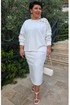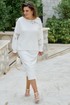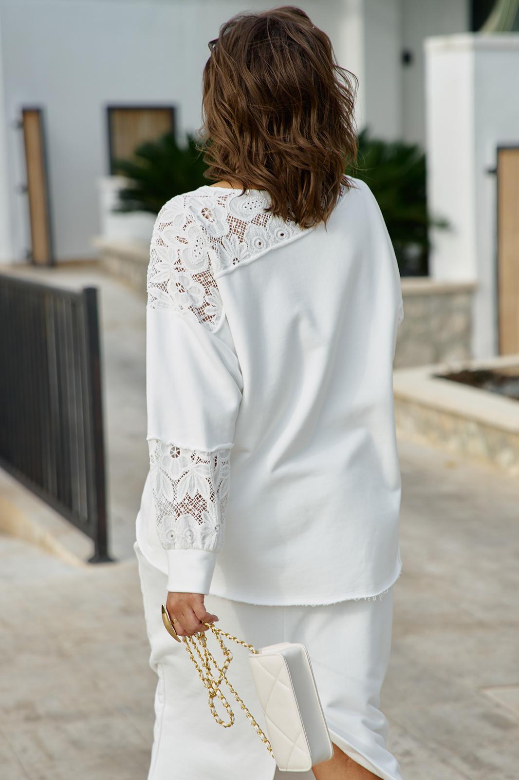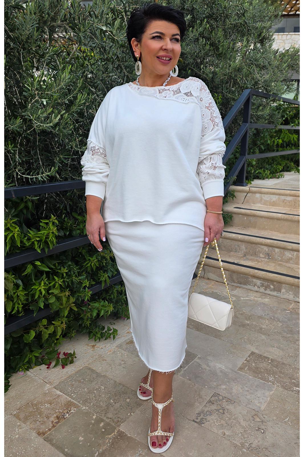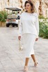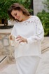 Элегантный костюм в молочном оттенке не оставит Вас незамеченной и станет отличным дополнением в Вашем гардеробе. Отделочные вставки из вышитого ришелье в тон добавляют образу романтичные нотки. Трикотажный костюм состоящий из джемпера и юбки. Джемпер свободного силуэта с округлой формой горловины, вставкой кокетки по переду и спинке из ришелье на просвет; линия плеча спущенная. Спинка без особенностей. Рукав втачной с декоративными вставками из ришелье на просвет, и притачной манжетой по низу. Низ в джемпере ассиметричный. Главной особенностью в изделии является эффект необработанных срезов, который добавляет образу дерзости.