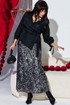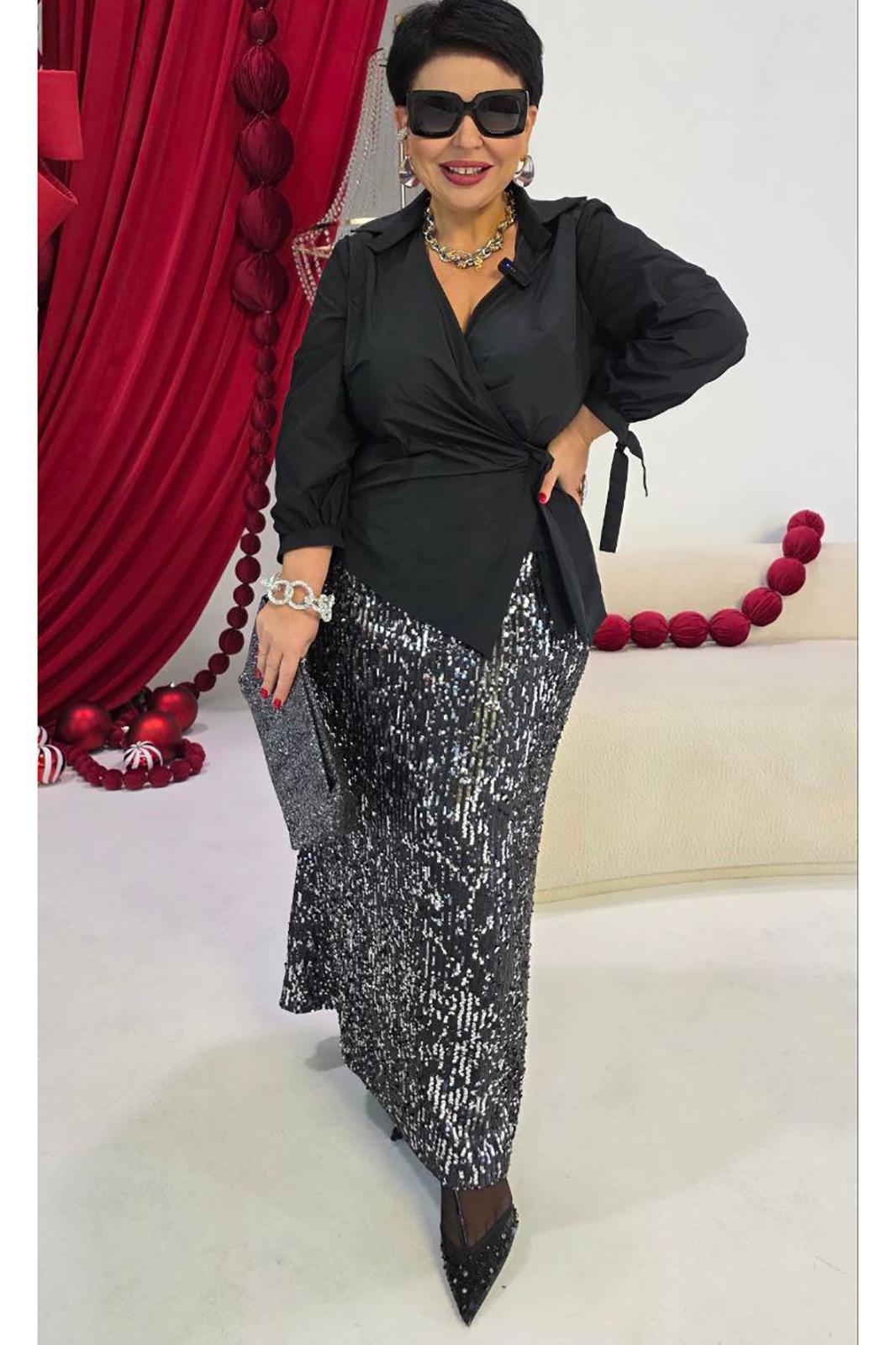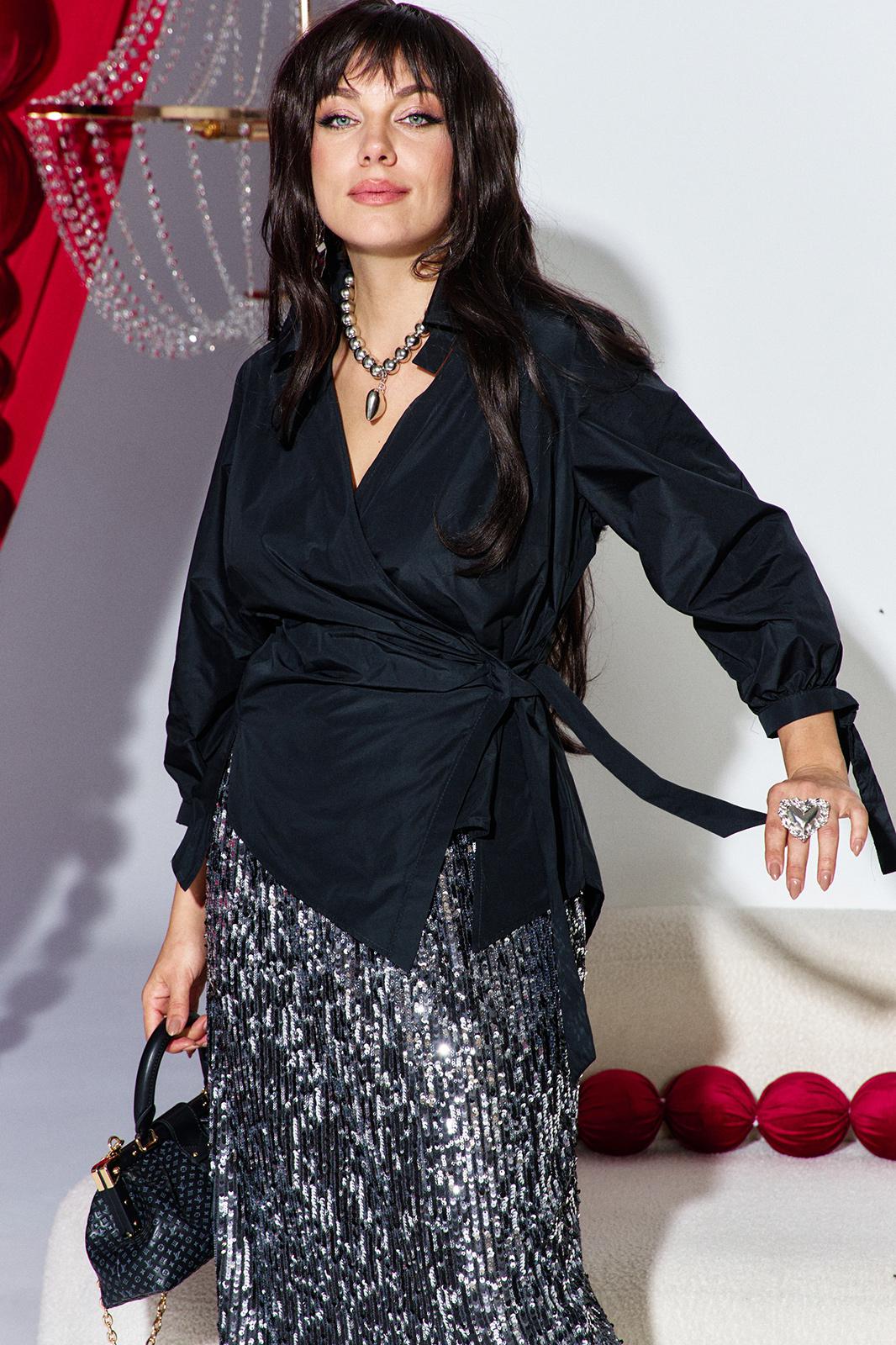 Потрясающий юбочный комплект, состоящий из блузки и юбки, который подарит вам ощущение праздника и непринуждённости. Ассиметричный крой блузы отлично гармонирует с ярким в пайетки низом, создавая тем самым идеальный комплект. Блуза прямого силуэта с запахом на поясе завязке с декоративным элементом в виде вышивки на какетке спинки. Горловина V-образная, воротник рубашечный с дизайнерским решением. С фигурными рельефами по переду и ассиметричным низом. Спинка блузки с рельефом и с запахом внизу. Рукав втачной одношовный по низу со сборкой и манжетом с завязкой. Юбка прямого силуэта. Пояс цельновыкроенный с эластичной тесьмой, что обеспечивает максимально комфортную посадку на любой тип фигуры. Юбка на трикотажной подкладке, по низу со внутренней стороны обтачка из подкладочной ткани для максимального удобства. Длина блузы по спинке 71 см. Длина рукава 50 см. Длина юбки 96 см.