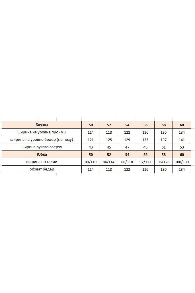 - Тип ткани: Блуза: 55% хлопок, 40% полиамид, 5% спандекс. Юбка: 100% полиэстер, подкладка 100% полиэстер.