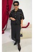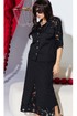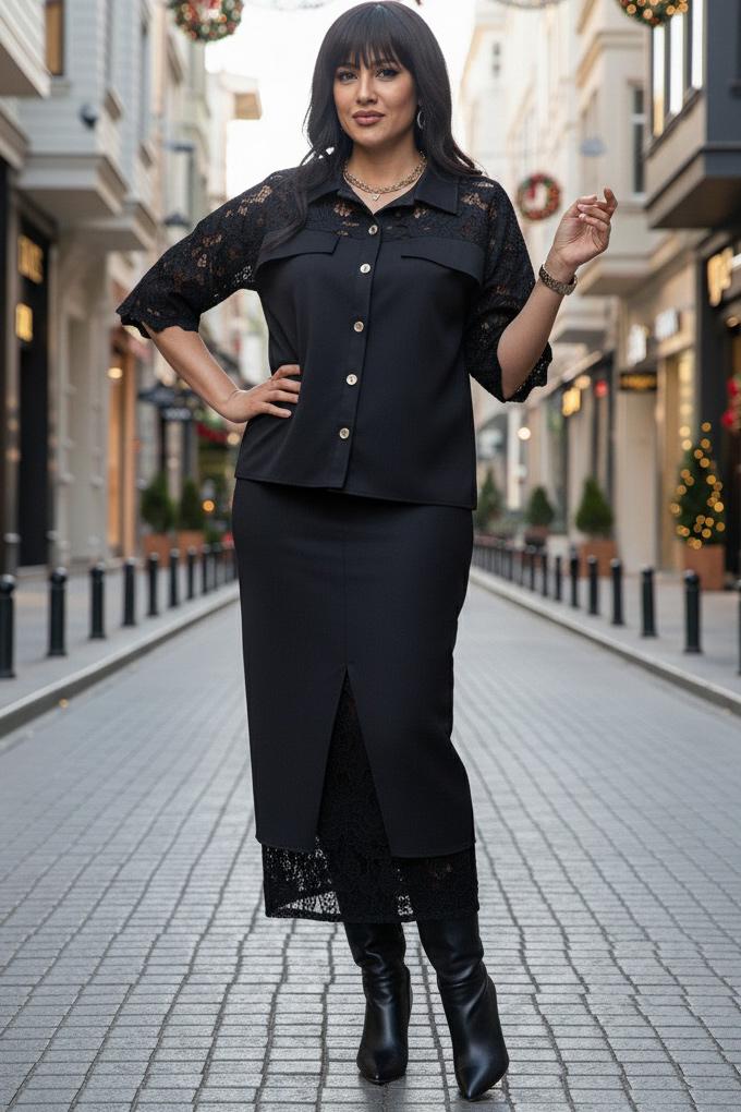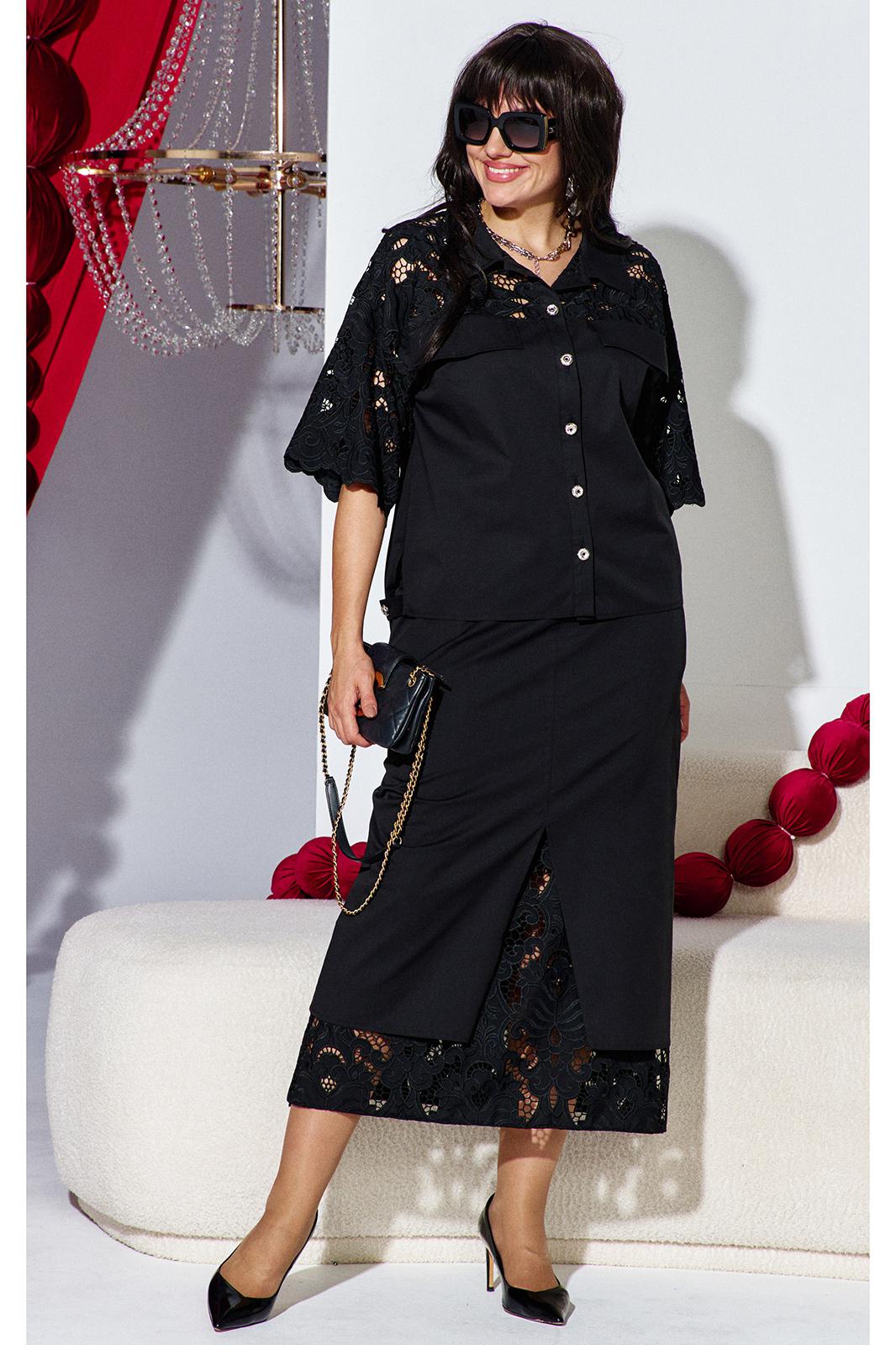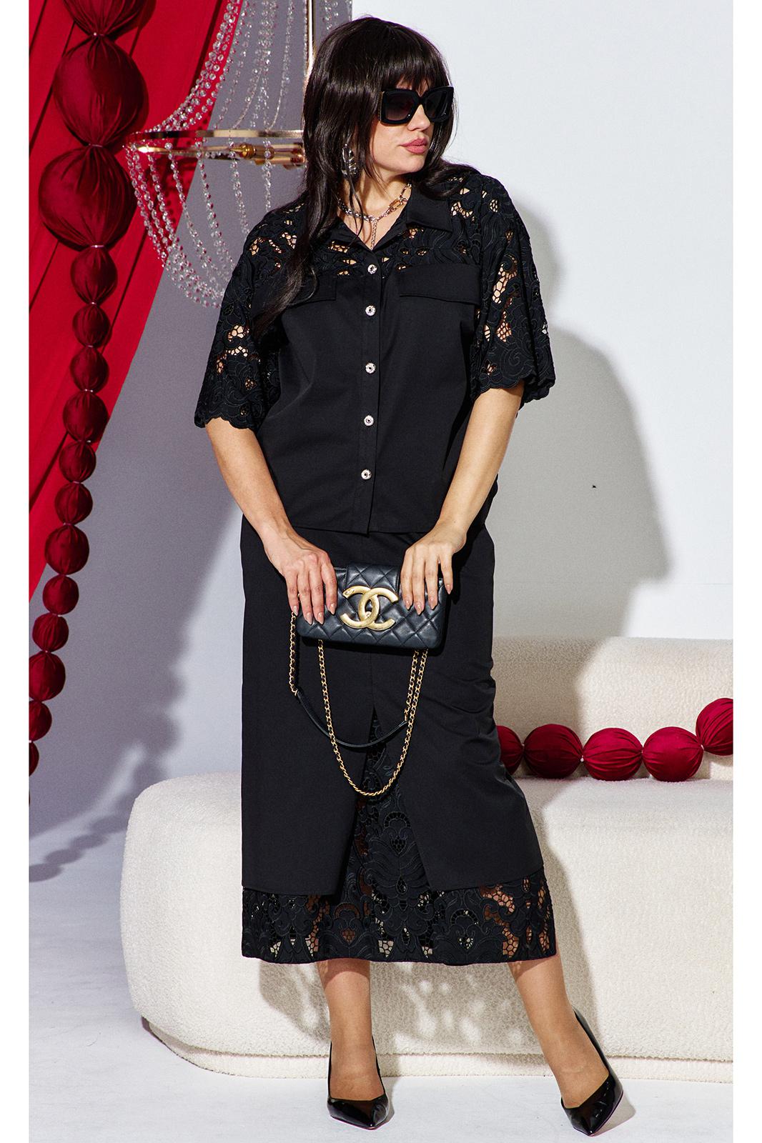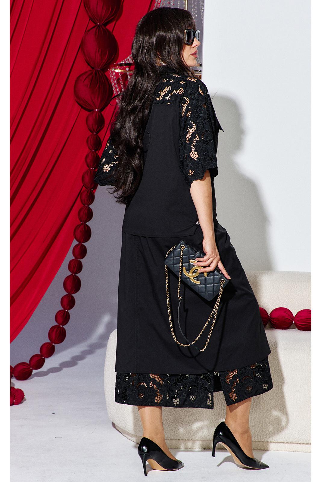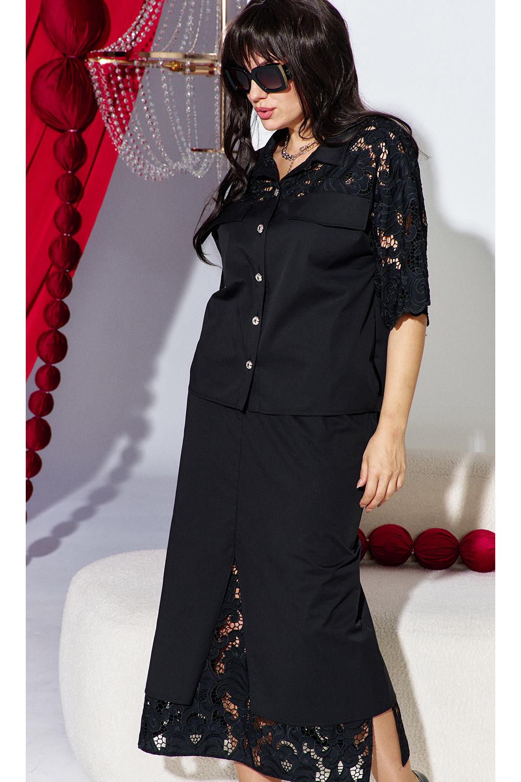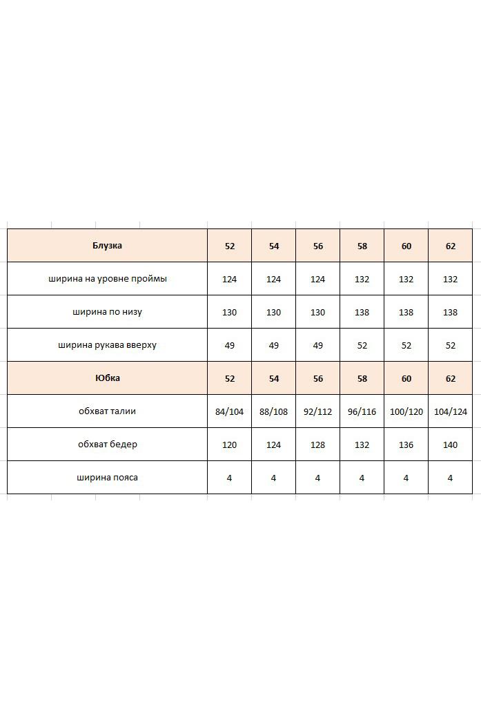 Костюм юбочный женский, состоящий из блузки и юбки. Комбинация однотонного хлопка и вышитого гипюра в тон создаёт ощущение монолитности и изысканности. Верх и низ костюма образуют единое целое: простая, сдержанная геометрия блузы подается как холст для элегантности юбки, превращая костюм в идеальный выбор для событий, где важна сдержанность и сила стиля.Блузка свободного силуэта, укороченная, с центральной застёжкой на петли-пуговицы по планке, низ в блузке ассиметричный. Воротник в блузе рубашечного типа. По переду блузки отрезные кокетки из отделочной ткани в тон- гипюра на просвет, декоративными клапанами. Спинка в блузке с отрезной кокеткой из отделочной ткани в тон-гипюра на просвет. В боковых швах блузки разрезы с декоративным элементом в виде паты, фиксирующейся отделочной пуговицей. Рукав в блузке втачной, длиной ¾, из отделочной ткани-гипюра с фестонами по низу.Юбка прямого силуэта, длины миди, с застёжкой на тесьму-молнию в гульфике и пуговицу в поясе, по переду юбки средний шов переходящий в разрез, и прорезные карманы. Заднее полотнище юбки со средним швом. Пояс притачной, со вставкой эластичной тесьмы-резинки в бочках. Юбка на подкладке, к подрезу подкладки притачивается деталь из отделочной ткани-гипюра в тон.Длина блузки по спинке 67 см (р 52-56), 68 см (р 58-62). Длина рукава 24 см. Длина юбки 85 см.