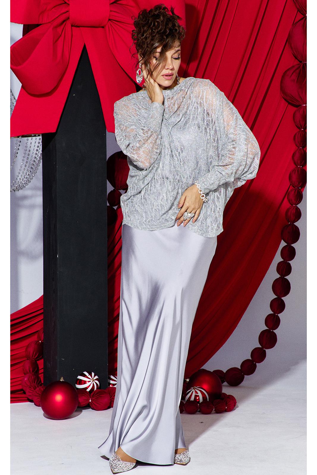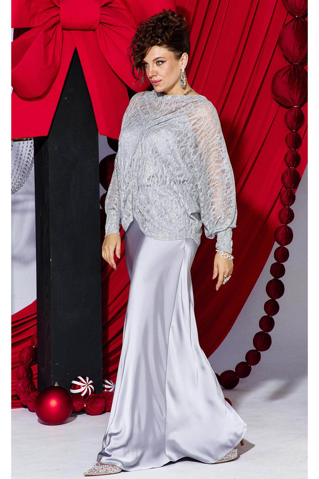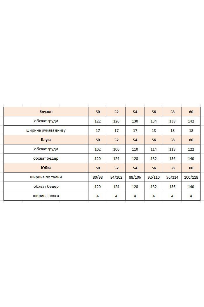Комплект женский юбочный, состоящий из блузона, блузы и юбки. Комбинация текстур создаёт баланс между комфортом и эффектной внешностью. Тонкий трикотаж блузона держит верх мягко и деликатно, не перегружая образ, в то время как атласная юбка привносит лаконичную драму и движение. Их союз напоминает современную картину: спокойная энергия блузона встречается с холодной иронией юбки, образуя наряд, который подходит как для повседневной городской среды, так и для торжественных павильонов, когда нужен стиль без лишних слов. Блузон из тончайшего трикотажа держится на теле как вторая кожа: прозрачность ткани едва скрывает очертания силуэта, а тонкий плетёный рисунок ловко ловит свет, создавая игру полупрозрачных переходов. Его цвет— словно утренний туман, в котором каждая деталь дышит воздухом утончённости. Манжеты и блузона остаются эластичными и облегающими, подчёркивая плавные линии плеч и груди, без лишних объёмов, будто ткань шепчет о хрупкости и комфорте. По переду блузона средний шов с заложенными декоративными складками от горловины и от низа, направленные на встречу друг-другу. Рукав в блузоне цельнокроеный с притачной высокой манжетой. Блуза свободного силуэта, с нагрудными выточками по переду, и разрезами в боковых швах; на регулируемых бретелях. По спинки блузы вставка эластичной тесьмы-резинки, обеспечивающей максимально удобное прилегание. Юбка атласная в стальном металлическом оттенке добавляет образу холодной свежести и энергетического акцента. Юбка длины «миди» с притачным поясом, вставкой эластичной тесьмы-резинке в задней части пояса и застёжкой на потайную тесьму-молнию в боковом шве и пуговицу в поясе. Длина спинки блузы 53 см (р 50-54), 54 см (р 56-60), длина рукава 71. Длина топа 46 см. Длина юбки 93 см.