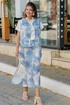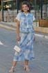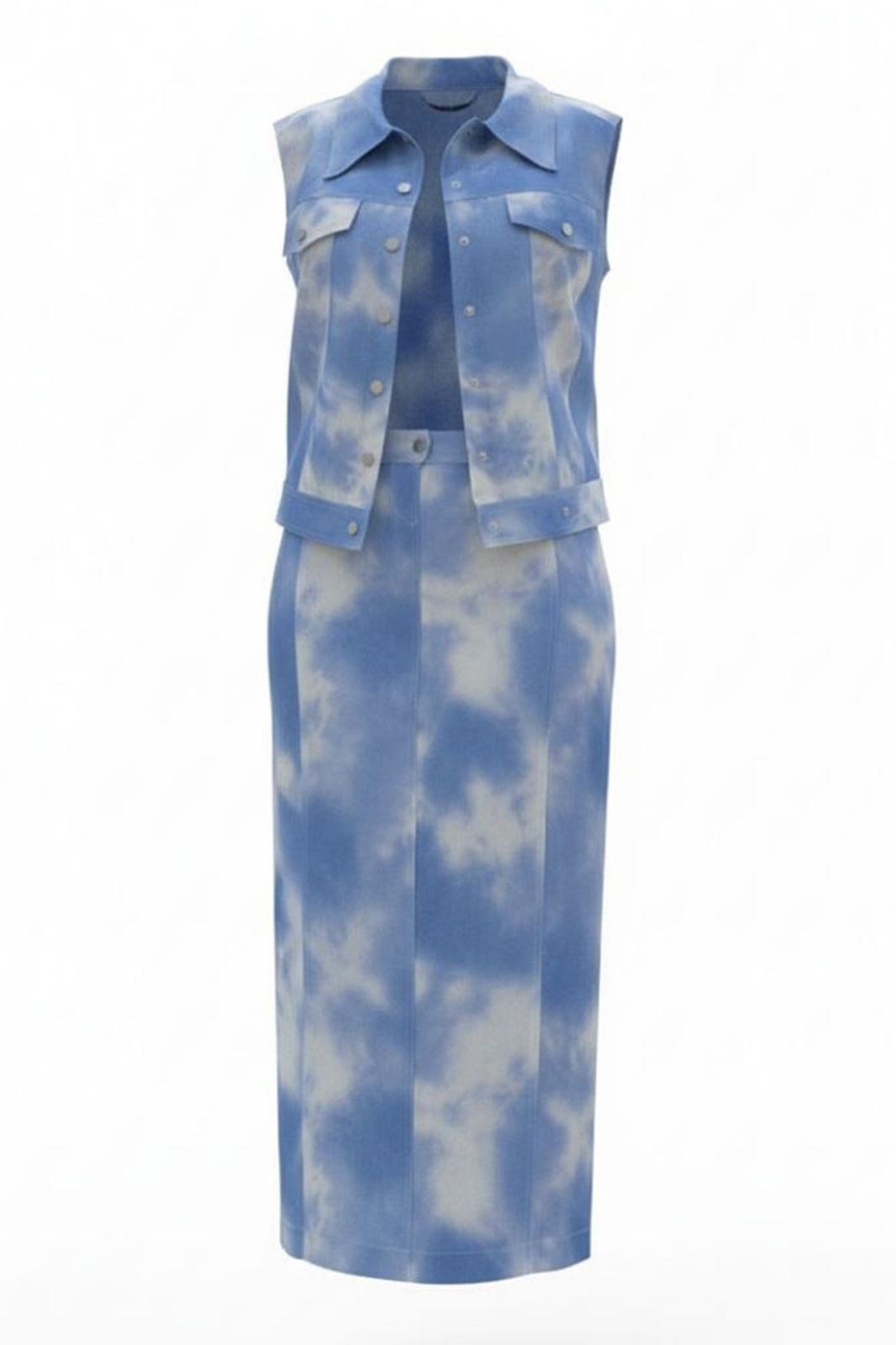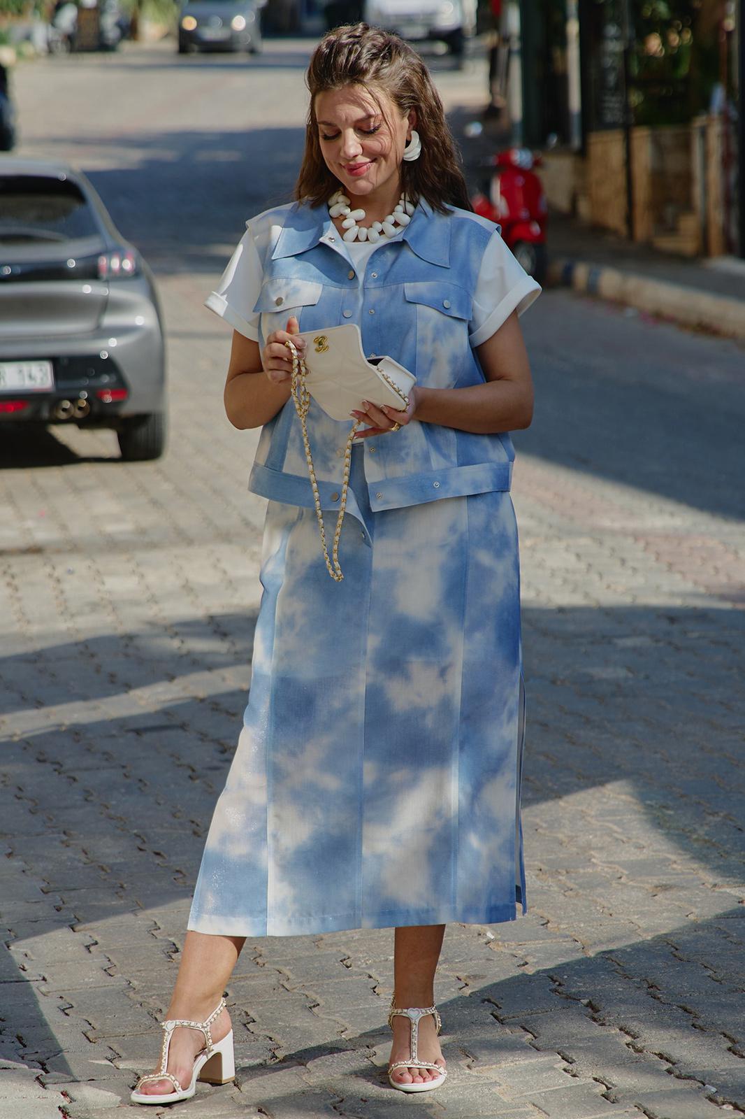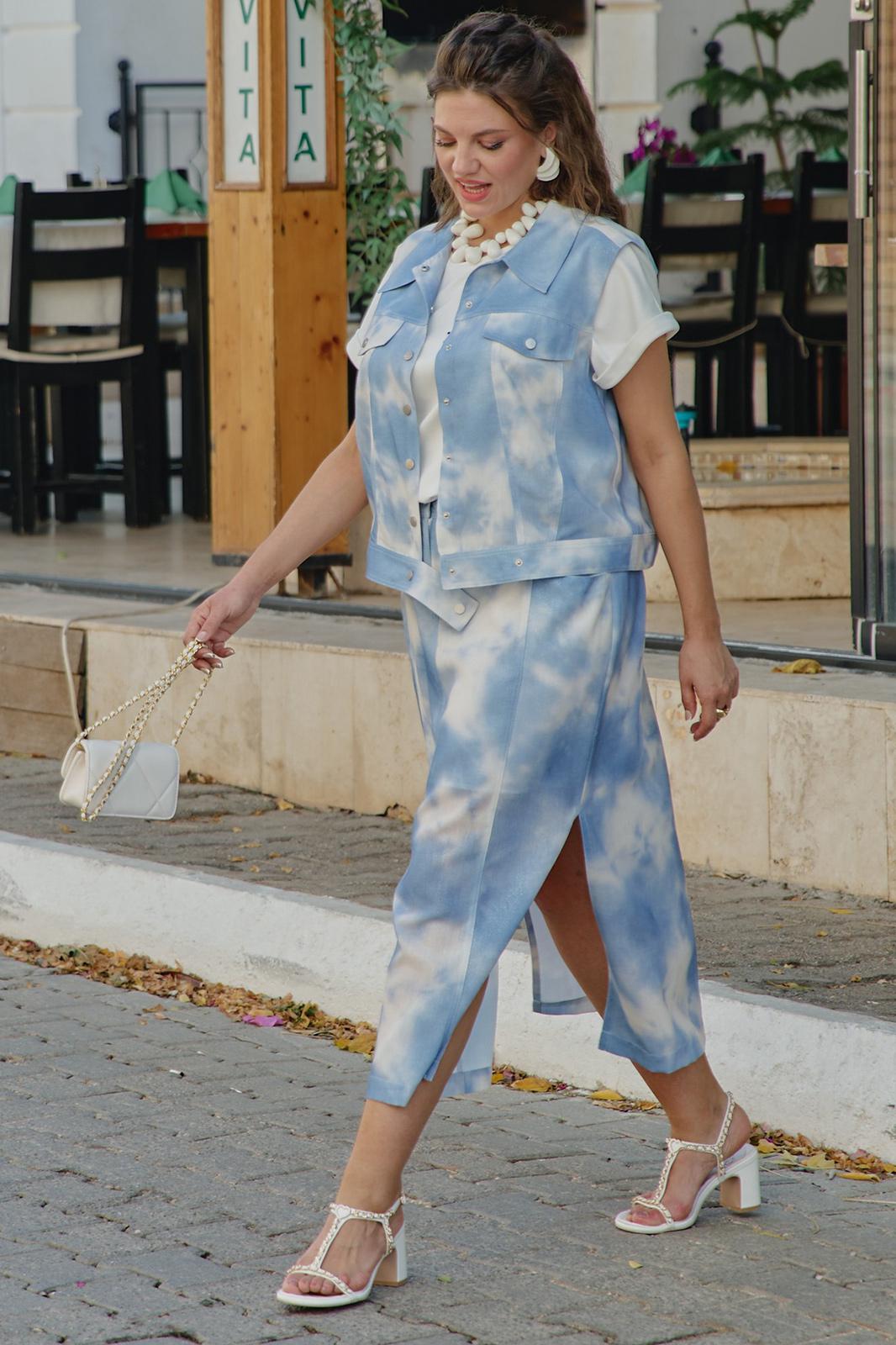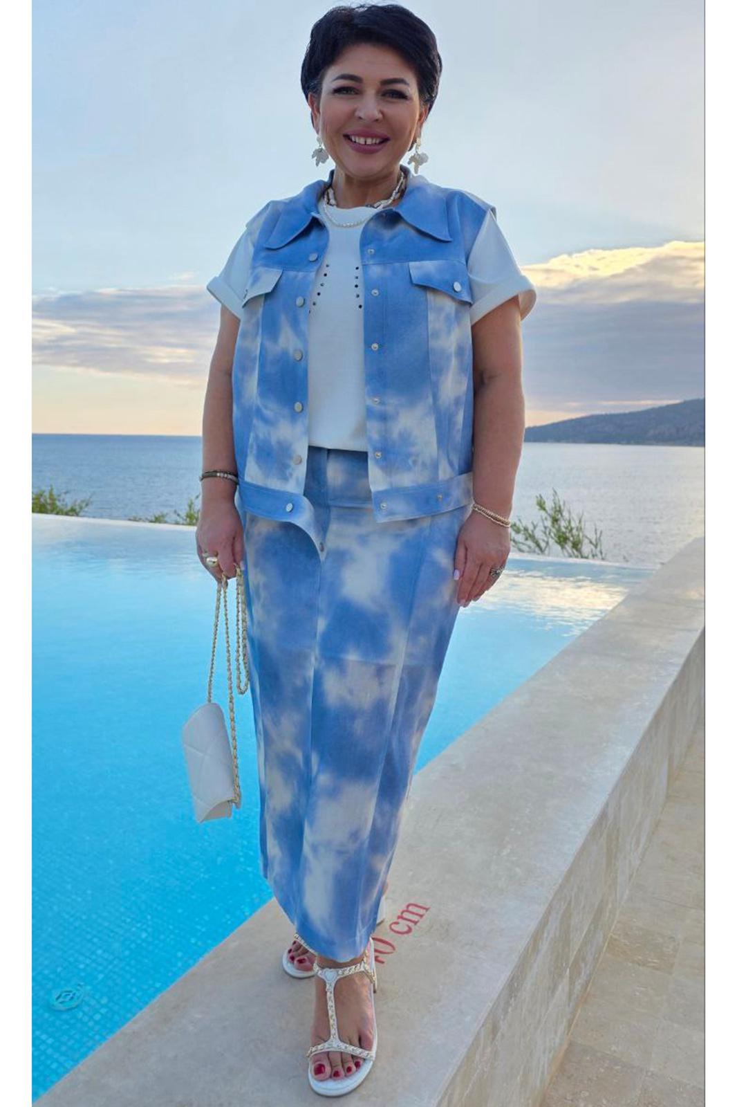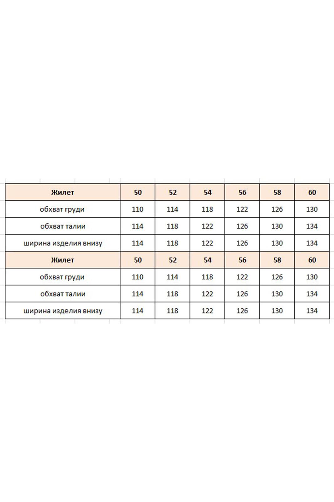 Просто роскошный костюм, который обязан быть в гардеробе у каждой модницы! Невероятный принт, текстура ткани с лёгким блестящим напылением создадут образ, в котором вы будете блистать. Костюм женский, состоящий из жилета и юбки. Жилет прямого силуэта с центральной застёжкой по планке на декоративные кнопки, воротником рубашечного типа и притачным поясом по низу. По переду жилета отрезная кокетка, декоративный клапан и фигурные рельефы. Спинка в жилете с отрезной кокеткой. В качестве дополнительной декоративной отделки жилета- отделочные двойные строчки контрастного цвета. Юбка прямого силуэта длины миди. Пояс притачной со вставкой резинки в бочках, по переду рельефы, застежка в среднем шве на тесьму молнию в гульфике и пуговицу в поясе. По переду юбки фигурные прорезные карманы. По заднему полотнищу юбки средний шов и декоративная листочка кармана. В боковых швах юбки разрезы. В качестве дополнительной декоративной отделки юбки –декоративные отделочные двойные строчки контрастного цвета. Длина жилета вдоль середины спинки от шва втачивания воротника 53 см (р.50-54), 55 см (р.56-60). Длина плеча 14 см (р.50-54), 14,5 см (р.56-60). Длина юбки по среднему срезу заднего полотнища с поясом 90 см. Ширина пояса 5 см.