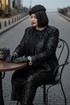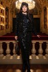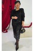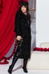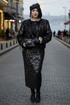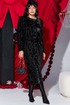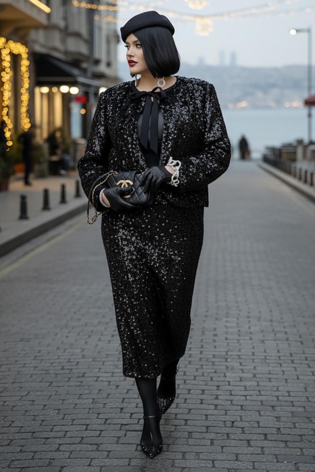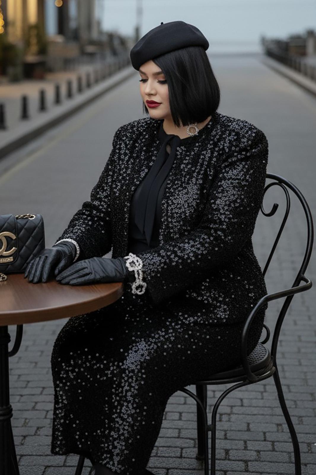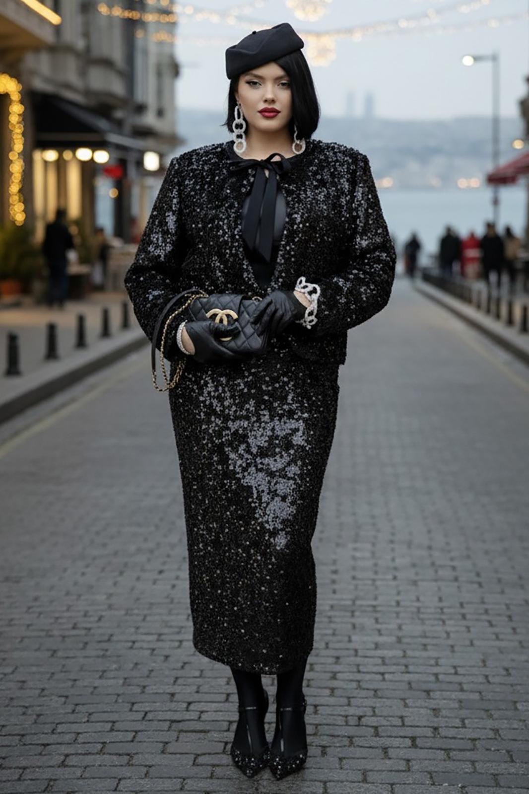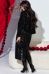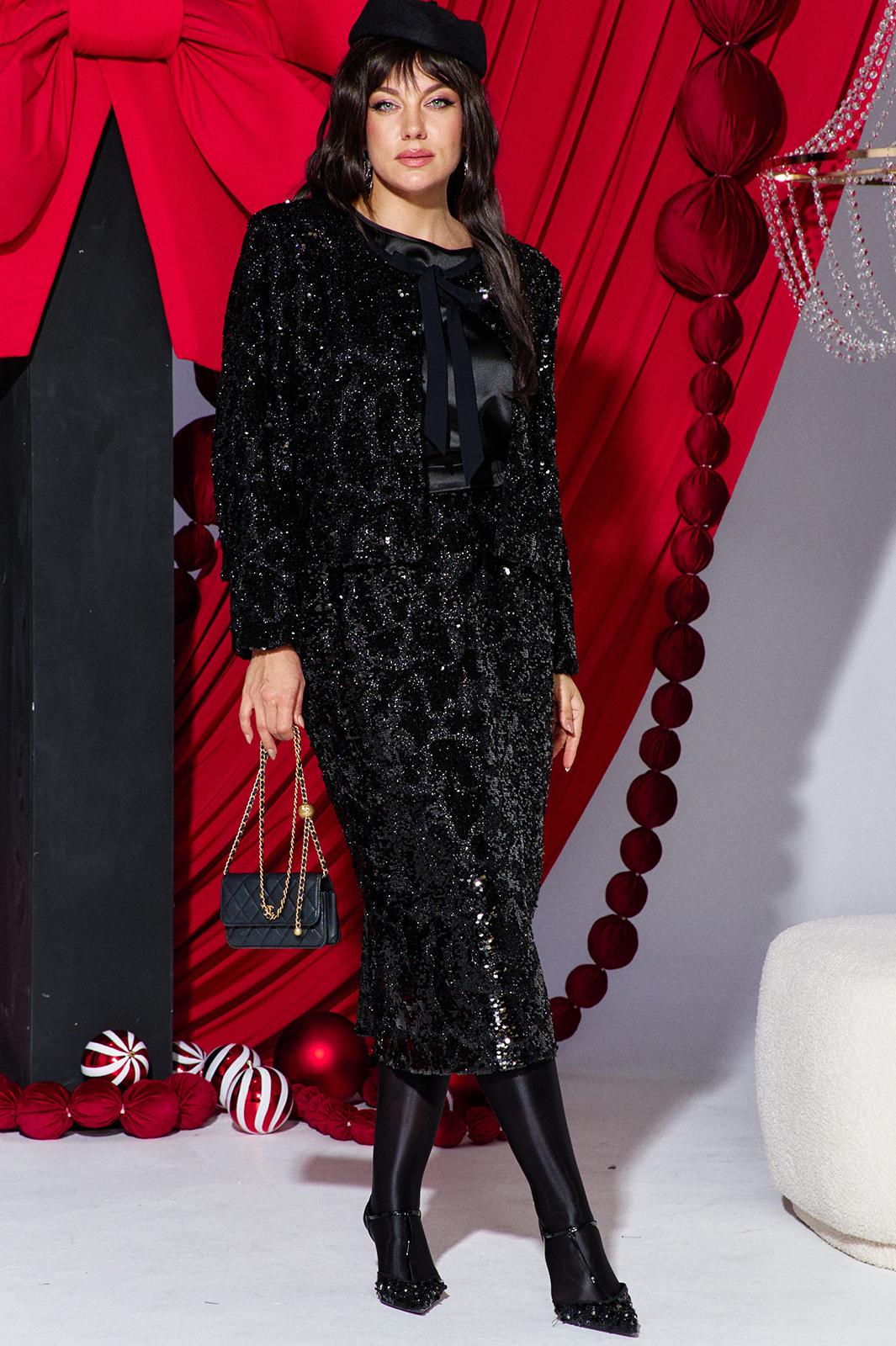 Общий образ — минимализм цвета и максимальная выразительность текстур. Материалы будто говорят на языке контраста: атласный блеск в блузе гармонично сочетается с зеркальной, перламутровой игрой пайетки. Этот комплект создает ощущение современной роскоши для вечерних выходов, деловых мероприятий и торжественных приемов, где ценят изящество без лишних деталей, спокойную уверенность и плавное движение света. Комплект женский, трёх-предметный, состоящий из жакета, блузы и юбки. Жакетукороченный, свободного силуэта, без застёжки, с акцентом на ровную линию плеч. Головина округлой формы с прилегающей стойкой из отделочной ткани, переходящей в декоративные ленты, завязывающиеся на бант. Спинка без особенностей. Рукав втачной, длинный. Жакет на подкладке. Блуза в классическом чёрном оттенке, который гармонично сочетается с насыщенным чёрным цветом комплекта. Блуза прямого силуэта с округлой формой горловины и нагрудными вытачками по полочке. Спинка без особенностей. Низ в блузе фигурной формы. Юбка длиной миди держит внимание за счет ткани, украшеной в густую, слегка крупную фактурную пайетку. Юбка прямого силуэта с притачным поясом со вставкой эластичной тесьмы-резинки в бочках. В среднем шве заднего полотнища юбки застёжка на молнию и пуговицу в поясе.Длина жакета по спинке 60 см, длина рукава 60 см. Длина блузы по спинке 65 см, длина плеча 14 см (р 50-54), 14,5 см (р 56-60). Длина юбки 79,5 см.