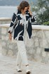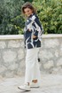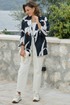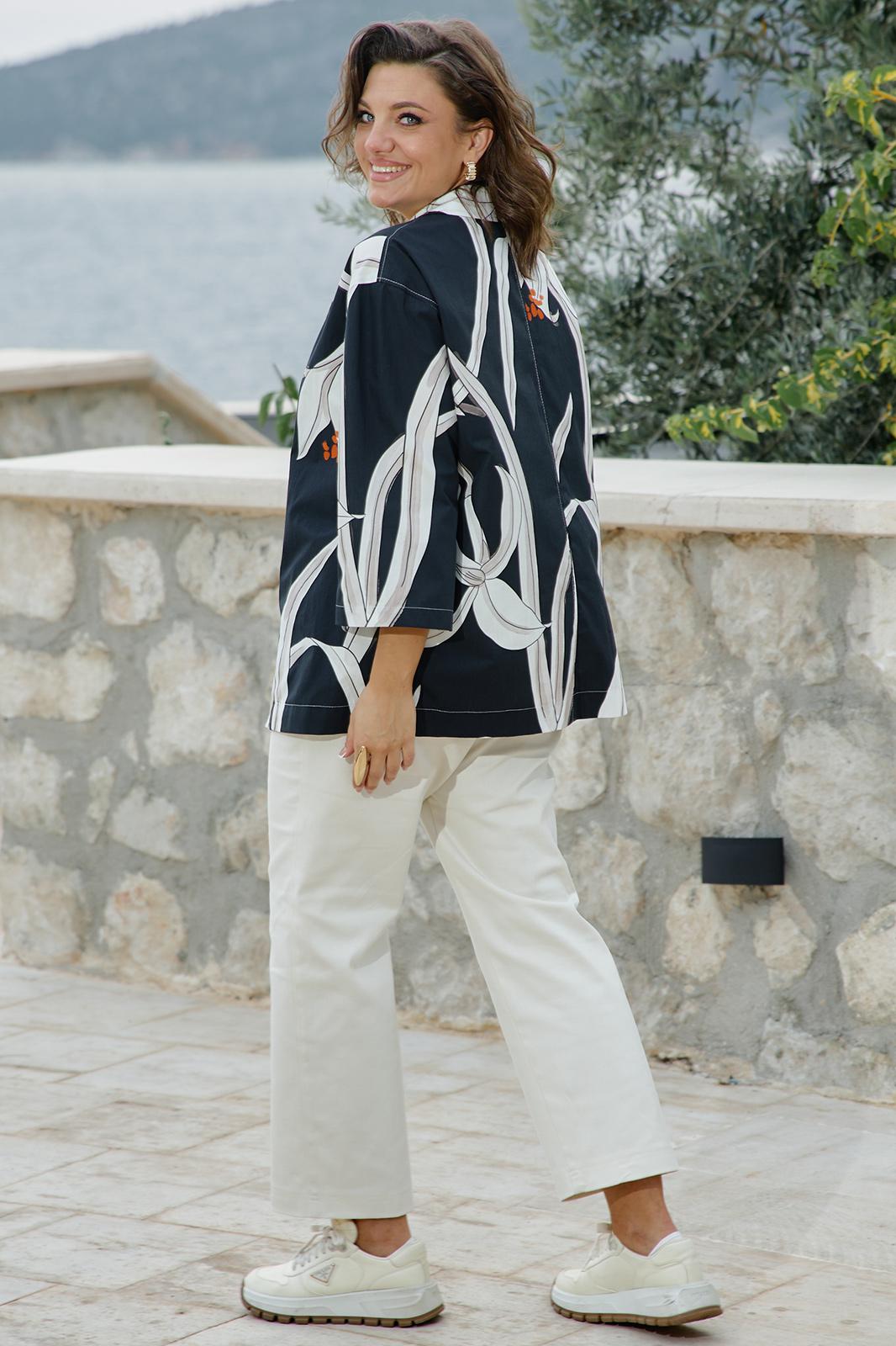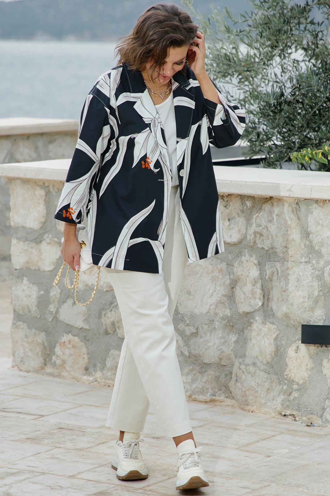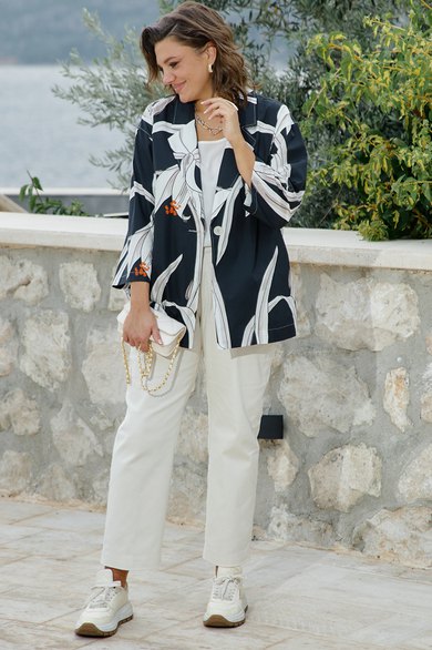 Этот жакет — история о контрастах. Тёмный, глубокий фон и лёгкий, светлый рисунок. Скрывающий силуэт покрой и откровенная, притягивающая взгляд красота принта-идеальный вариант для тех, кто любит привлекать внимание, он сочетает в себе летнюю расслабленность и деловую элегантность. Данный жакет станет отличным вариантом для повседневных образов, а также для работы в офисе. Прямой крой и сдержанный крупный принт помогут скрыть все несовершенства фигуры и создать идеальный силуэт. Жакет прямой, свободного силуэта, с центральной застёжкой на петлю-пуговицу, с отложными лацканами. Карманы - в боковых швах. Спинка жакета со средним швом. Рукав со спущенной линией плеча, длиной 3/4. Жакет без подкладки. Длина спинки жакета 71 см. Длина рукава жакета 45 см.