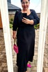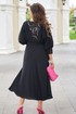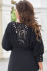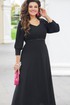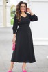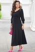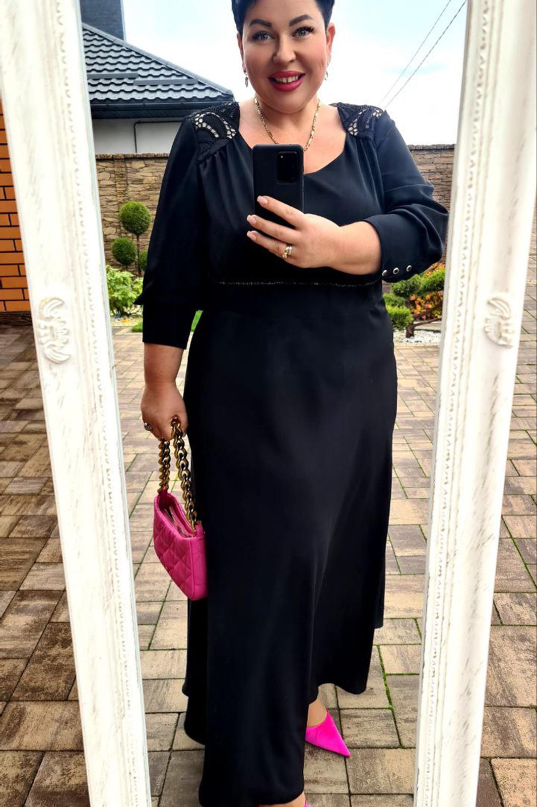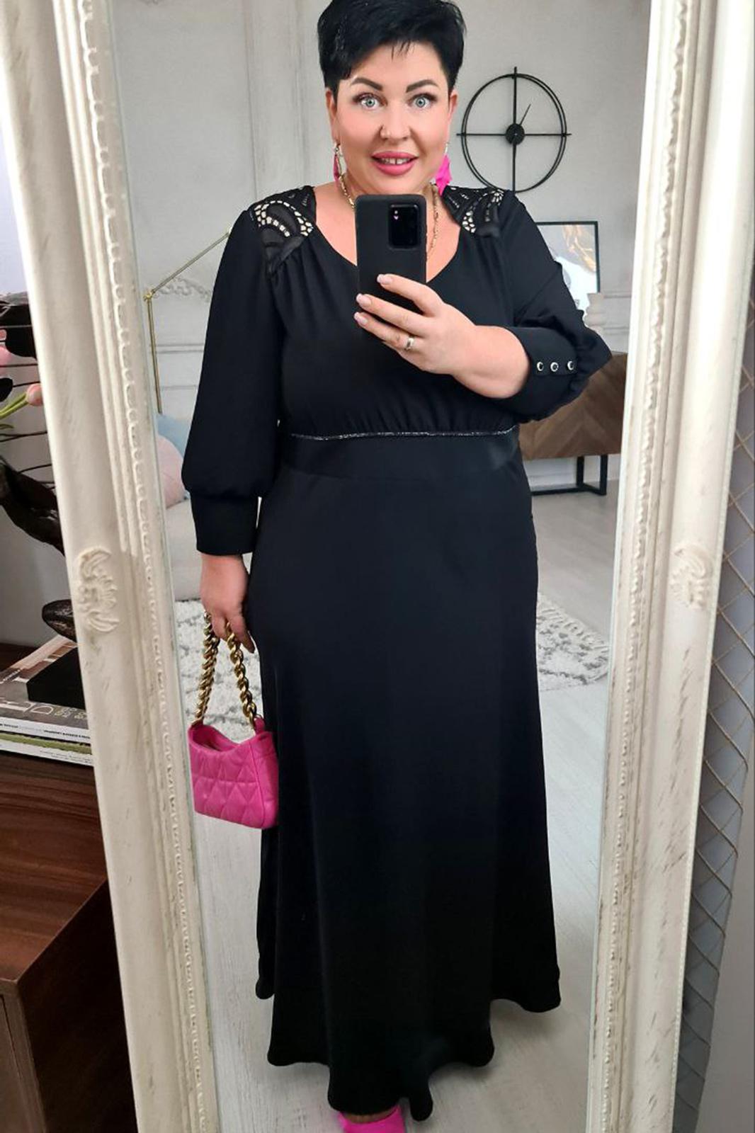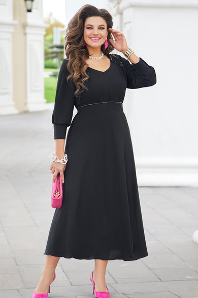 Шикарное женское платье классического черного цвета, а вставки из модного кружева делают Ваш образ нарядным и изысканным. В данном платье Вы будете неотразимы как на праздничной вечеринке, так и в вечернем выходе. Легкое платье с V- образным вырезом и кокетками из кружева на груди создает красивую зону декольте. Слегка завышенная линия талии с втачным поясом и декоративной тесьмой, и сборкой под грудью переходит в пышную струящуюся юбку. Спинка платья с V-образной вставкой из кружева и встречными деталями с заложенными складками, направленными к центру спинки. Рукав втачной снизу собран на высокую манжету с пуговицами. Платье на подкладке с застёжкой на молнию в боковом шве, благодаря универсальной длине миди ниже колена платье подойдет на женщин разного роста. Длина платья от высшей точки плечевого шва до низа 131 см (р.50-54), 134 см (р.56-60). Длина рукава 49 см.