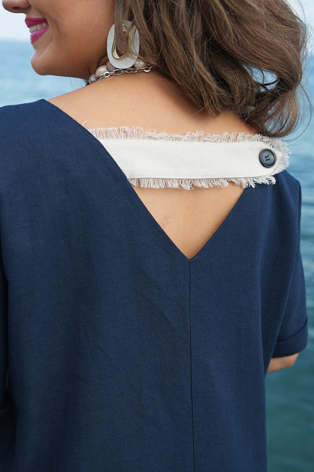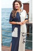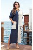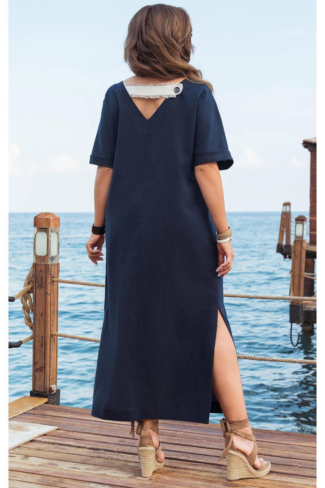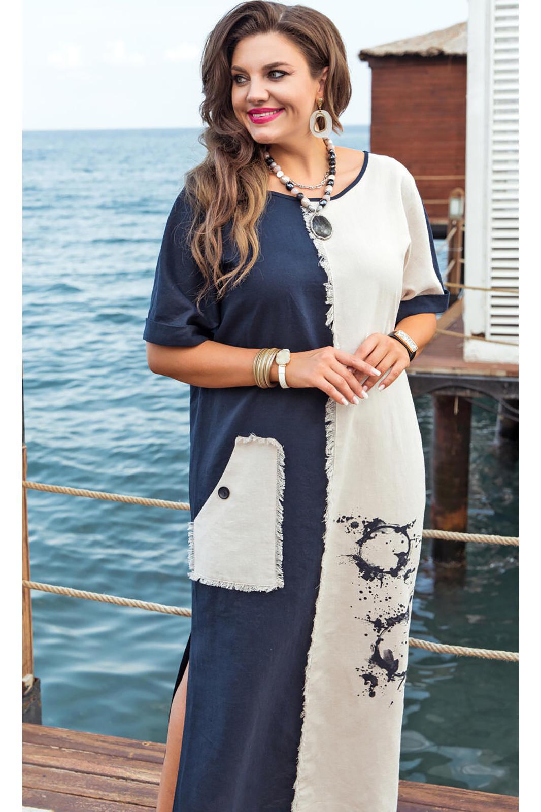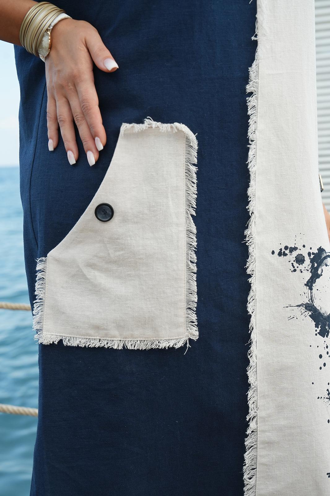 Платье женское идеально для жаркого лета, простой крой, не сковывающий движения. Платье сочетает в себе комбинацию контрастных цветов, а дизайнерская печать по детали переда добавляет яркий акцент. Платье прямого силуэта, длинное с высокими разрезами в боковых швах. Горловина в платье округлой формы, линия плеча, спущенная с притачной манжетой по низу. По переду платья вертикальный подрез со вставкой из бахромы, по правой половинке платья настрочной фигурный карман с декоративной отделкой в виде бахромы и декоративной пуговицы. Спинка с V-образным вырезом по горловине, притачной патой с декоративной отделкой в виде бахромы и декоративной пуговицы. Спинка со средним швом. Длина платья от высшей точки плечевого шва до низа 135 см (р.52-56), 139 см (р.58-62). Длина рукава 20 см.