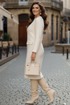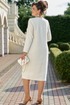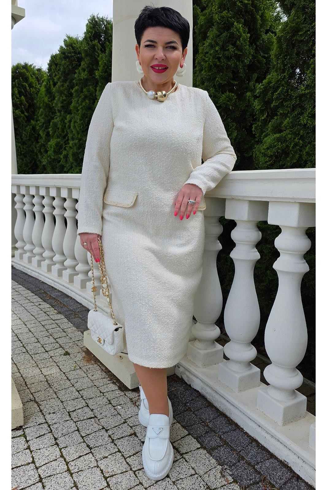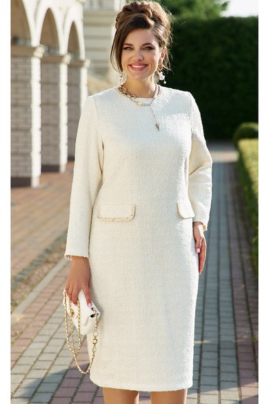 Безумно красивое и элегантное платье в модном оттенке «сливочного масла» мягко обволакивает фигуру, создавая тем самым шикарный образ. Его стиль, утончённость делает женщину поистине роскошной. Платье идеально подойдёт как для повседневной носки, так и для торжественных выходов, подчеркивает достоинства фигуры и успешно скрывает все недостатки. Платье прилегающего силуэта с округлой горловиной с отделкой в виде декоративной отделочной тесьмы. По переду платья нагрудные вытачки, отделочные клапана карманов с декоративной отделкой в виде тесьмы. По спинке застёжка на декоративную тесьму-молнию. Рукав в платье втачной, длинный. Платье на подкладке. Длина платья 111 см (р 48-52), 111,5 см (р 54-58), длина рукава 61 см.