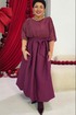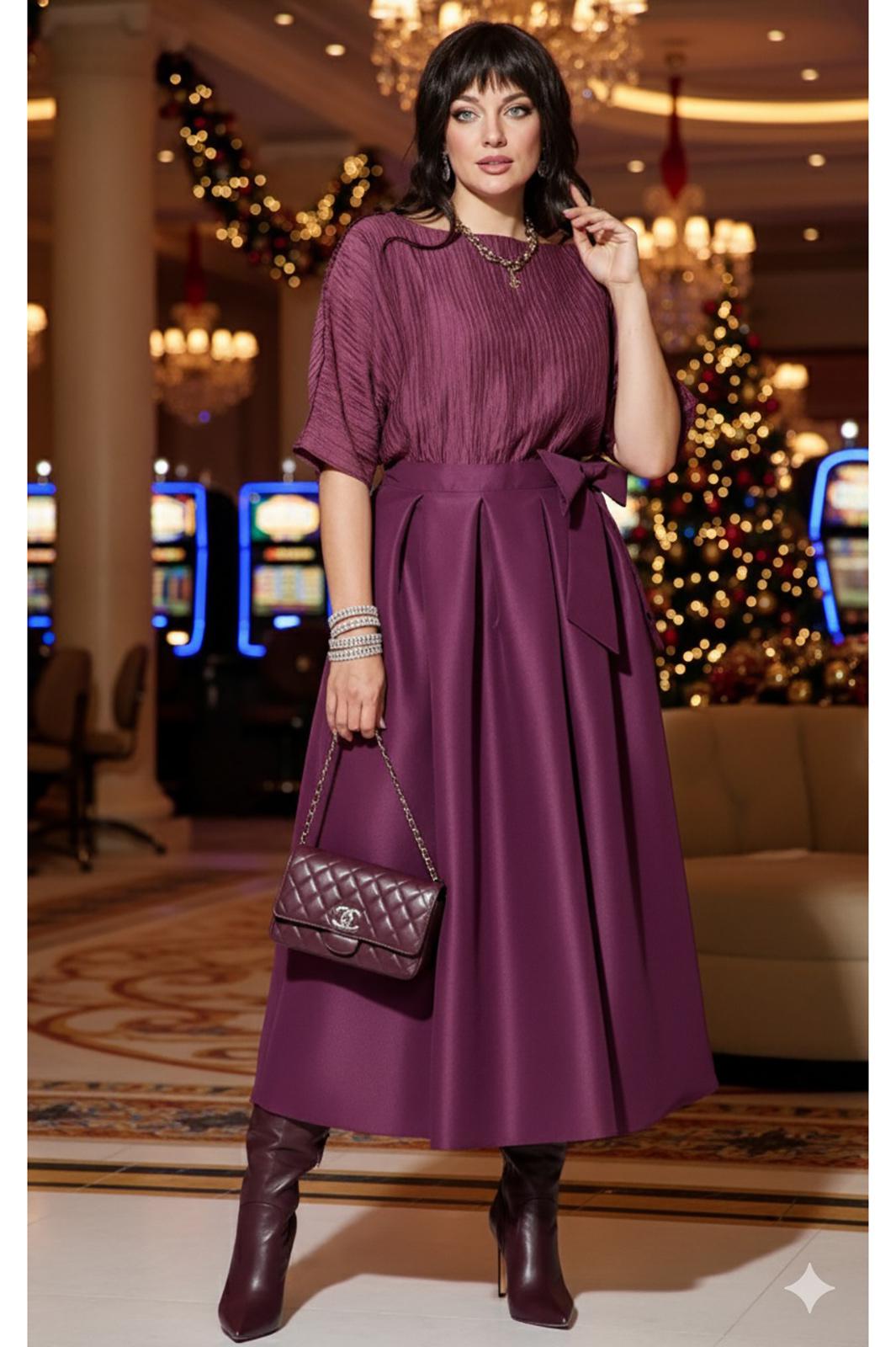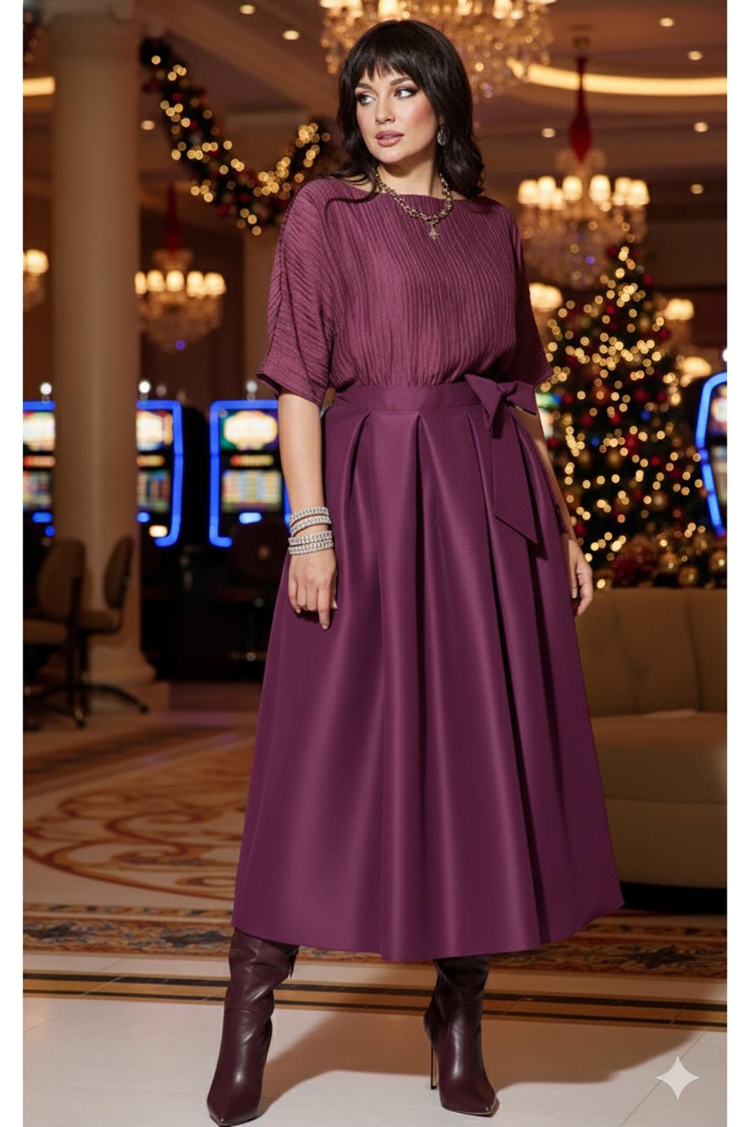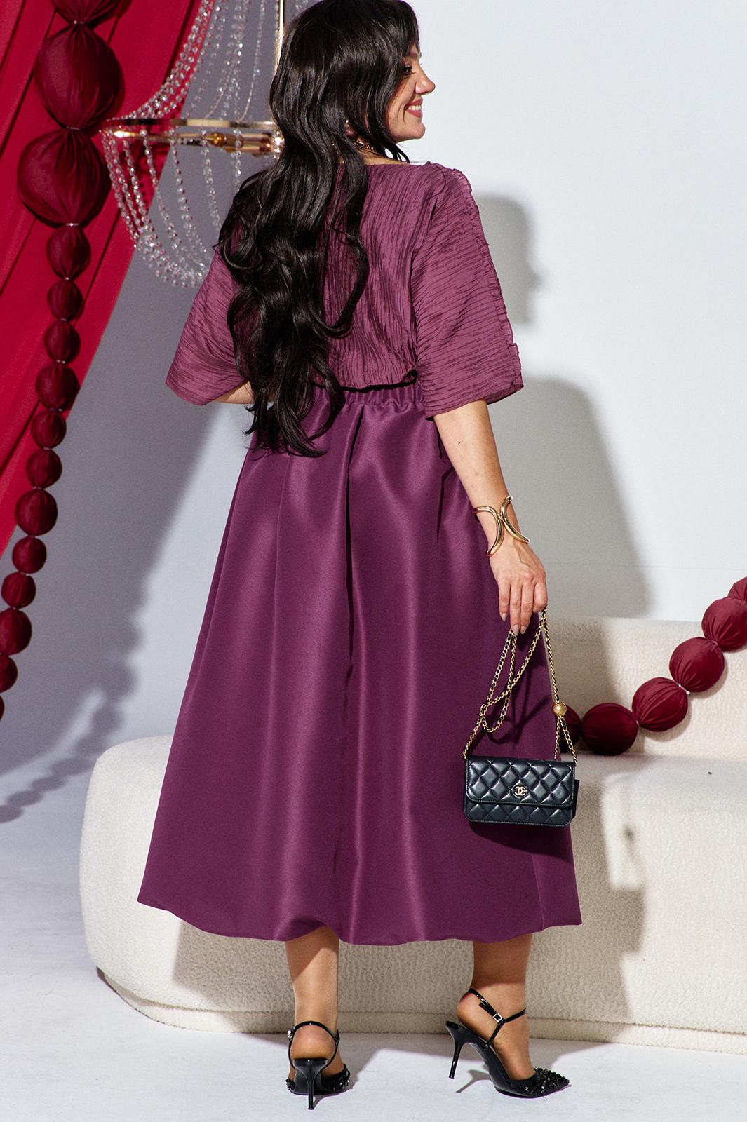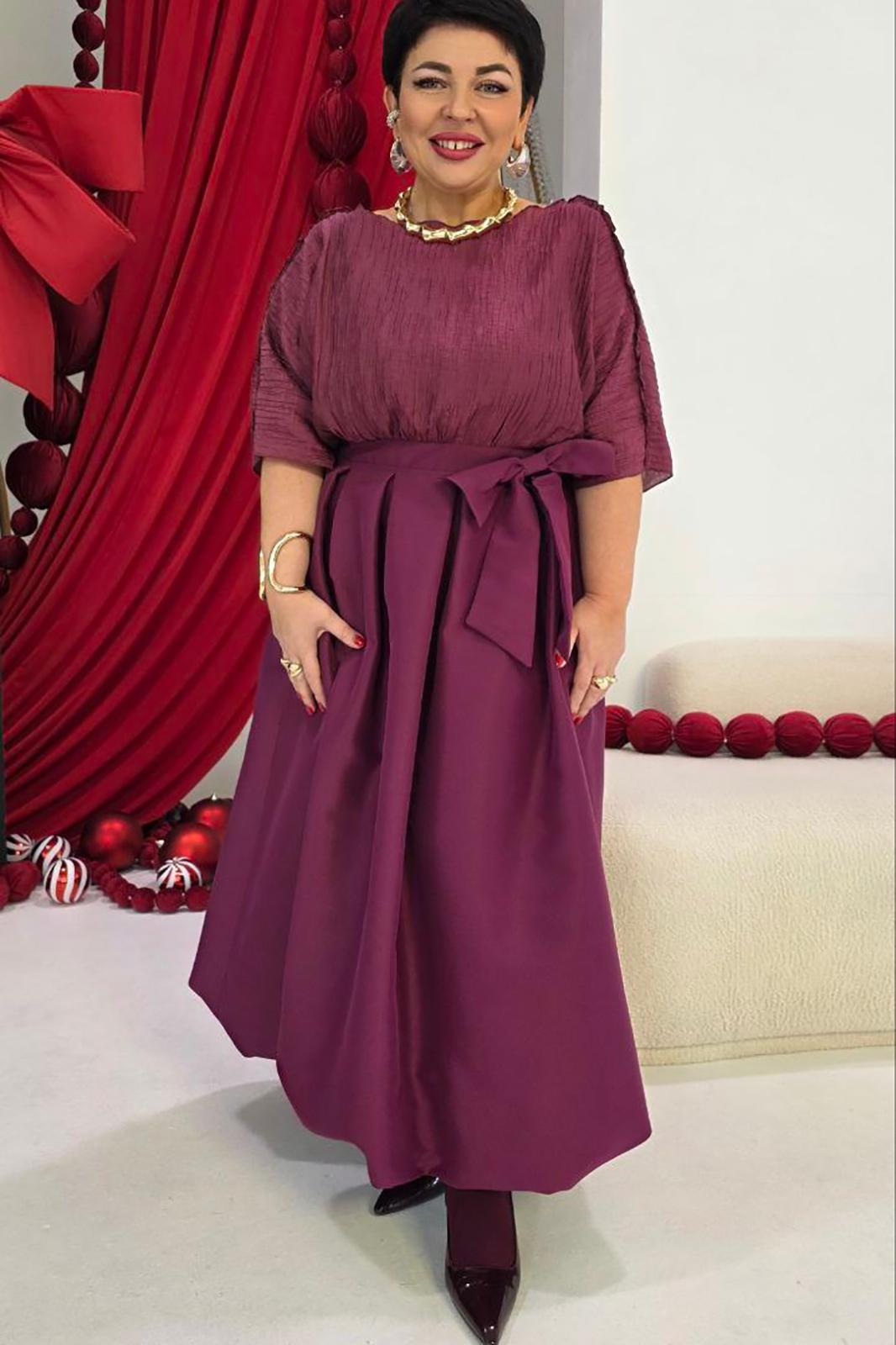 Невероятно красивое и элегантное платье отвечает всем требованиям вечернего наряда! Сочетание тканей разных фактур и дизайнов в одной модели - тренд сезона. Это элегантное платье миди состоит из двух частей, создающих впечатление комплекта. Верхняя часть платья выполнена из плиссированной ткани, что придаёт ему текстурный и динамичный вид, а юбка с атласным блеском придаёт изделию нарядность, гармонично дополняющего верх. Высокая талия юбки визуально удлиняет фигуру. Общий ансамбль выглядит изысканно и подходит как для повседневных, так и для более официальных мероприятий. Сочетание различных фактур и оттенков винного создаёт глубокий и сложный образ. Дополнительные детали, такие как золотые украшения и туфли с шипами, придают платью особый шарм. Платье приталенного силуэта, с округлой формой горловины, рукав цельнокроенный, длинной ¾. В плечевом шве платья декоративная вставка рюши. Лиф платья на подкладке. Пояс в платье притачной со вставкой резинки по спинке, с застроченными складками от пояса по юбке платья. Юбка в платье «балон», на подкладке. Пояс в платье декорирован бантом в виде съемной броши. Длина платья 134 см (р 50-54), 135 см (р 56-60). Длин рукава 40 см.