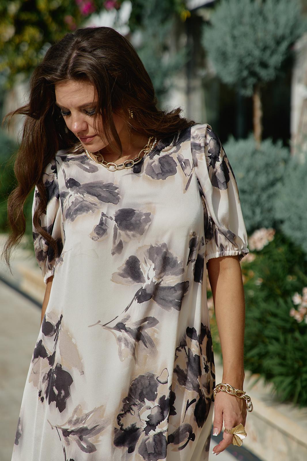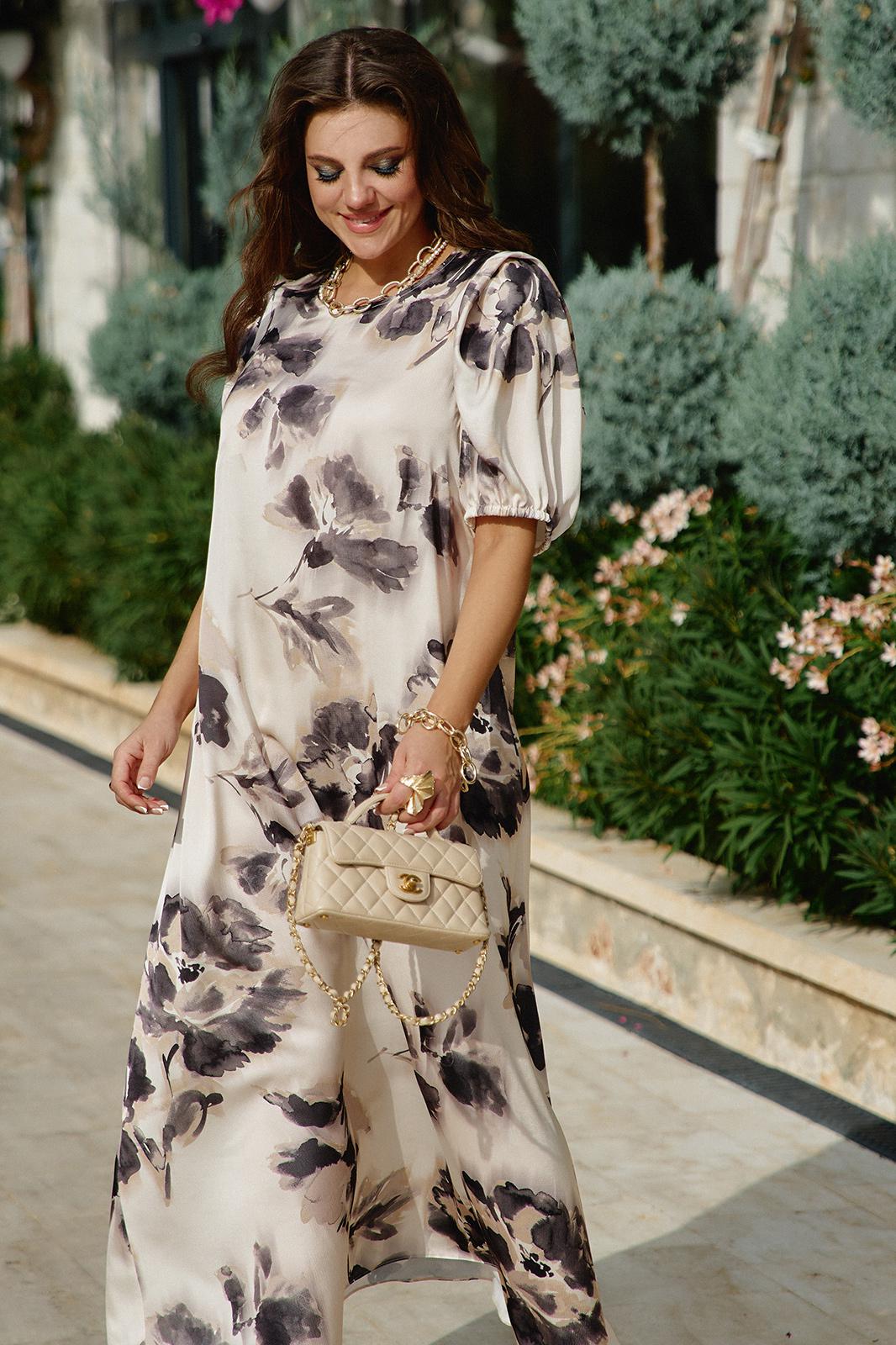 Платье женское летнее для повседневной носки и торжественных случаев небольшого объема полуприлегающего силуэта без подкладки. По геометрическому подобию напоминает трапецию, пластическая форма мягкая, плавная. Прилегание достигнуто за счет боковых рельефов и нагрудных горизонтальных вытачек. Плечевой пояс наклонный, немного заужен. Платье цельнокроенное, рукав втачной, низ которого обработан на токую резинку для удобства носки и приданию формы рукаву, в верхней части сложен элегантной складкой входящей в плечевой шов. Горловина немного расширена по плечам, кокетливо приоткрывая ключицы. На спинке в среднем шве вертикальная застежка на одну пуговицу. Это летящее платье прекрасно подойдет на каждый день, так же оно прекрасно сочетается с жакетом любой длины. Струящийся покрой платья визуально вытягивает образ, а благодаря идеальной посадке выгодно смотрится на различных типах фигур. Платье универсально для любого повода. Оно выгодно будет смотреться как на торжестве, так и в повседневном гардеробе, преображая женщину, делая ее хрупкой и женственной.Длина платья 137 см (р 52-56), 138 см (р 58-62). Длина рукава 35 см.