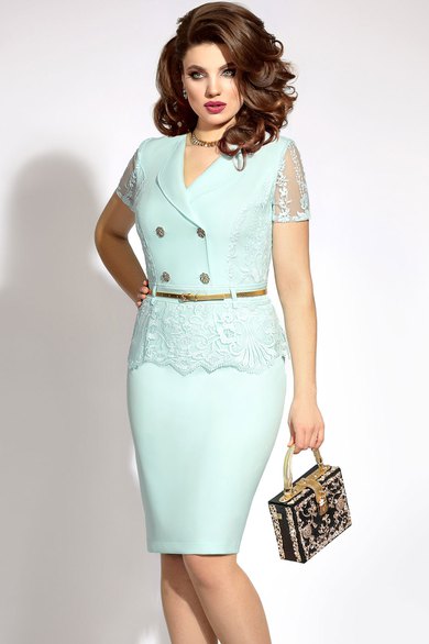 Платье женское прилегающего силуэта, отрезное по линии талии с баской, выполненной из кружева. По переду имеется втачной пояс со шлевками, рельефы и двубортная застёжка с отложными лацканами и фигурными пуговицами под золото. В боковом шве имеется застёжка на потайную молнию. По спинке расположены рельефы, втачной пояс со шлёвками и средний шов со шлицей. На бочки переда и спинки наложено кружево. Рукав втачной одношовный. Выполнен из кружева. Длина около 19 см. К платью прилагается пояс под золото.Длина изделия 100 - 108 см в зависимости от размера.