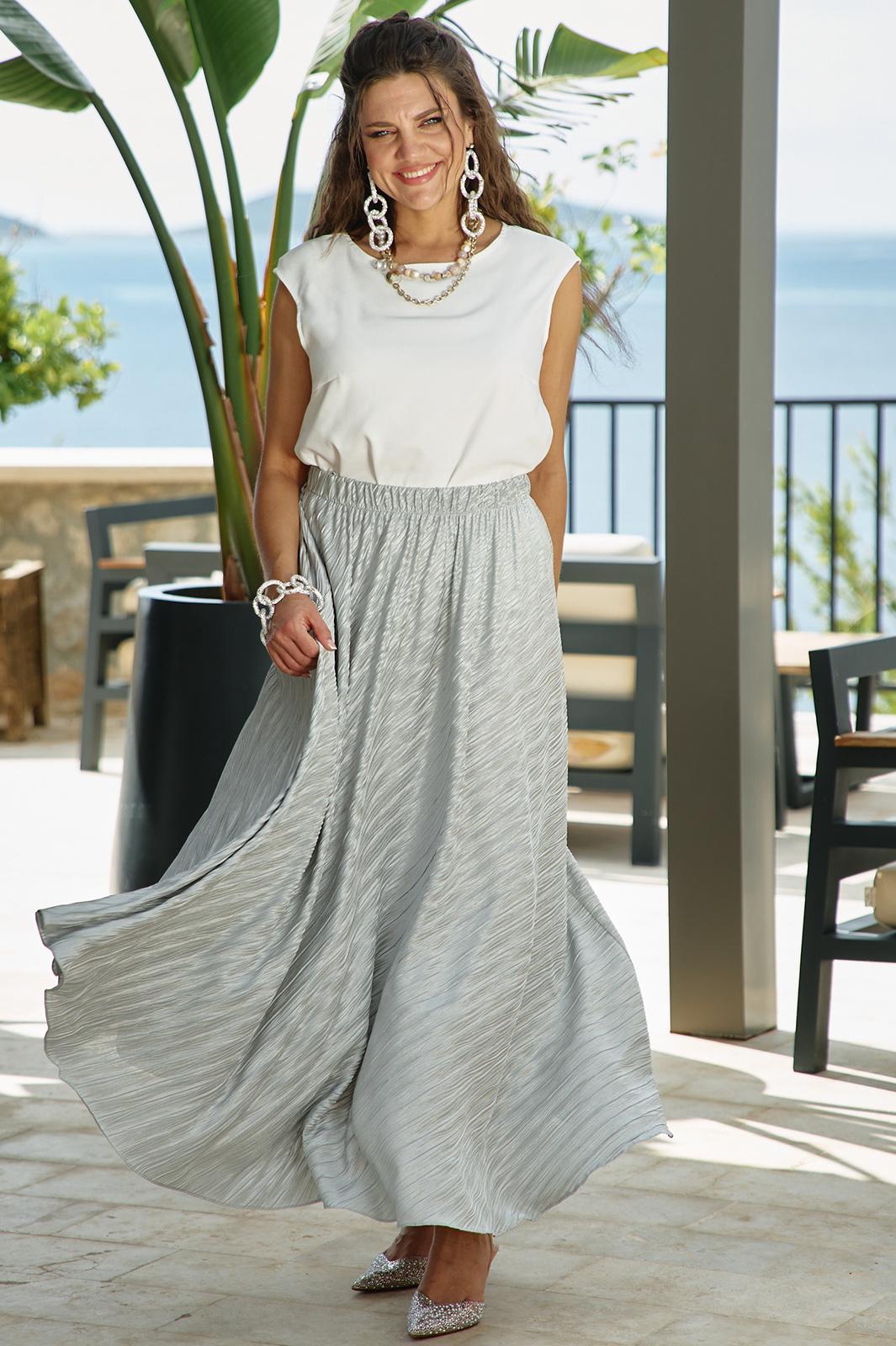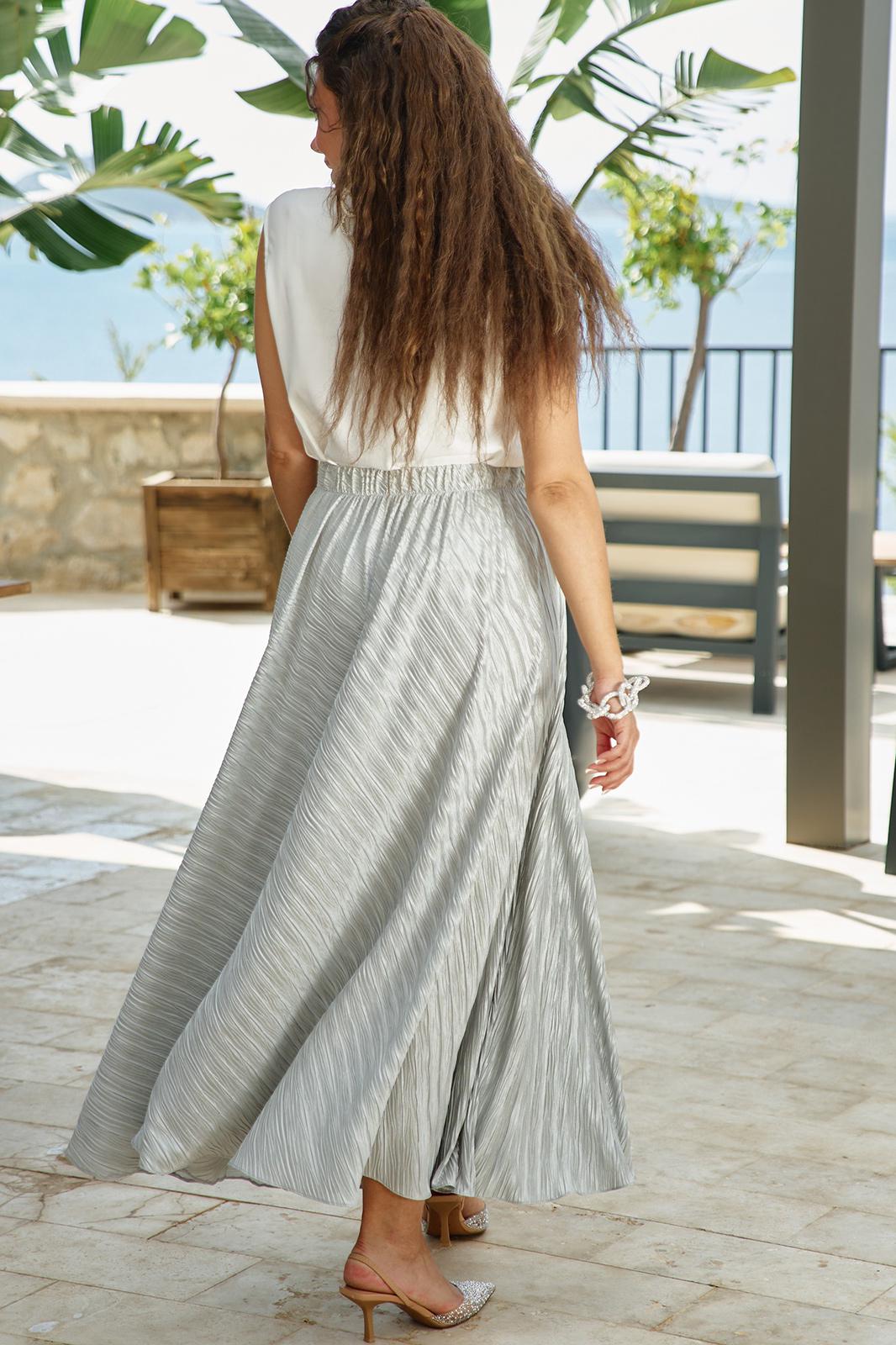 Юбка «полусолнце» в длине миди с жатой фактурой — это сочетание лёгкой драматичности и непринуждённой элегантности. Её силуэт создаёт мягкую визуальную волну, а жатая поверхность превращает каждый изгиб в игру света и тени: она одновременно утончённая и характерная, романтичная и по-городски современная. Из-за сжатой фактуры ткани юбка выглядит живой и объёмной.