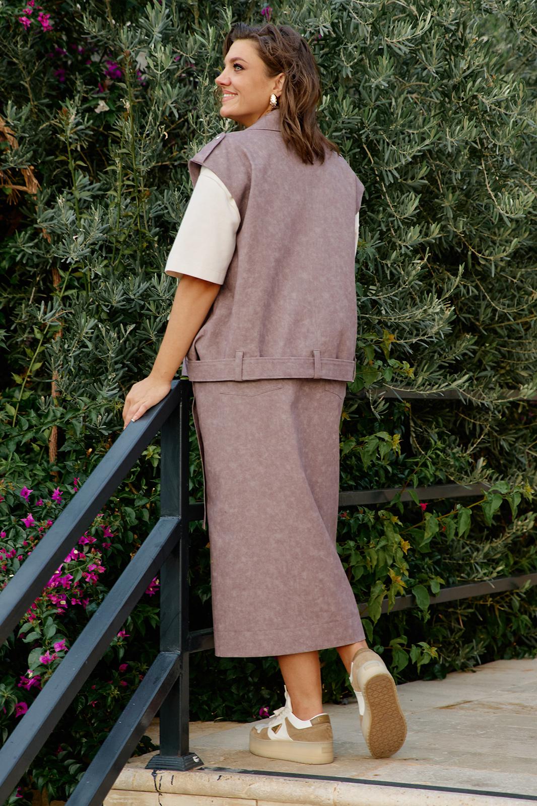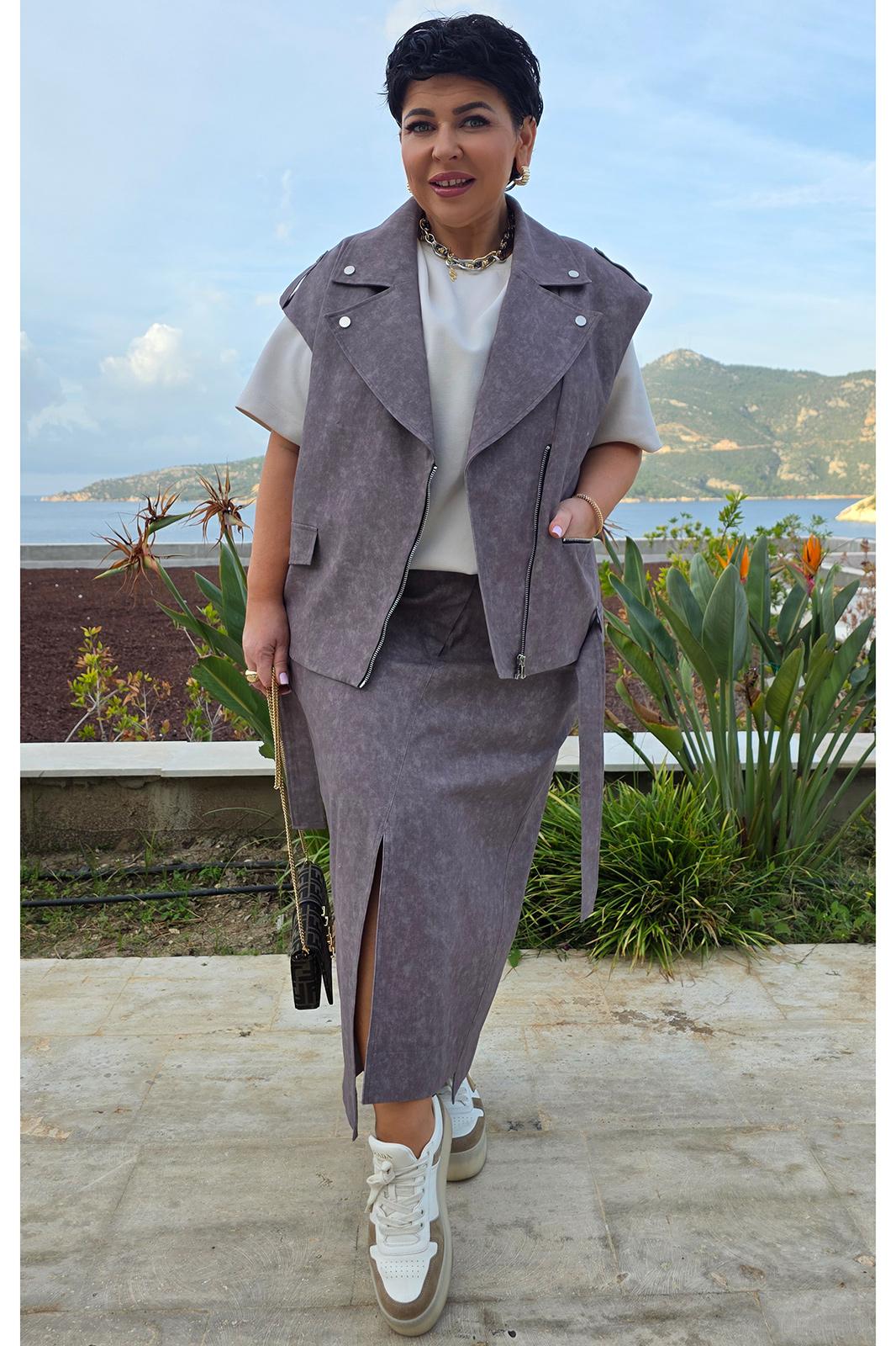 Женская юбка из денима с легкой потертостью придает винтажный шарм и характер. Она является своеобразной базой, которая легко комбинируется с различным верхом, позволяя быть разной, делая любой образ интересным. Юбка прямого силуэта, длины «миди» с ассиметричным подрезом по переду переходящим в разрез, с застёжкой на тесьму-молнию в гульфике и пуговицу в поясе юбки. По переду юбки прорезные карманы. По заднему полотнищу юбки накладные карманы. Пояс в юбке притачной со вставкой эластичной тесьмы-резинки в бочках, что обеспечивает комфортное прилегание по фигуре. Длина юбки 85см.