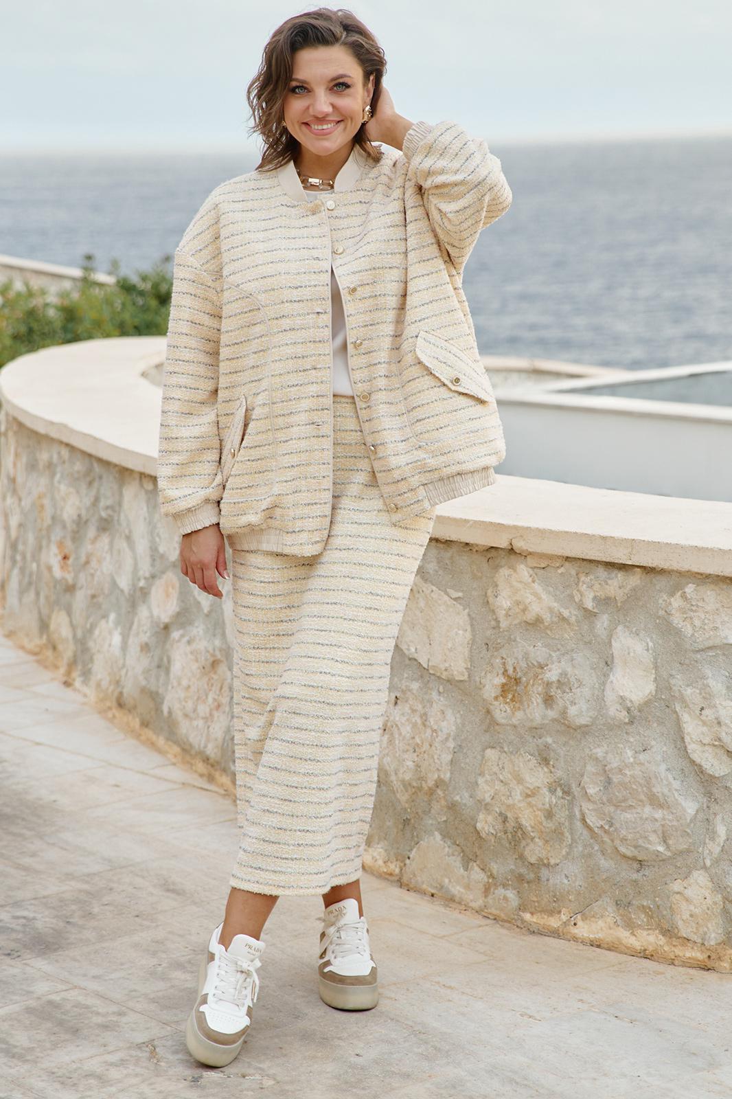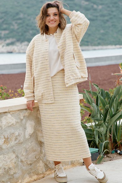 Юбка длины «миди» является своеобразной базой, которая легко комбинируется с различным верхом, позволяя быть разной, делая любой образ интересным. Юбка прямого силуэта с притачным поясом со вставкой эластичной тесьмы-резинки в бочках. В среднем шве заднего полотнища юбки застёжка на молнию и пуговицу в поясе, и с разрезом от низа. Юбка на подкладке. Юбка длины «миди» является своеобразной базой, вокруг можно построить множество различных образов в зависимости от необходимости и сезона. Длина бомбера 71 см, длина рукава 72,5 см (р 50-54), 73,5 см (р 56-60). Длина юбки от пояса 92 см, ширина пояса 4 см.