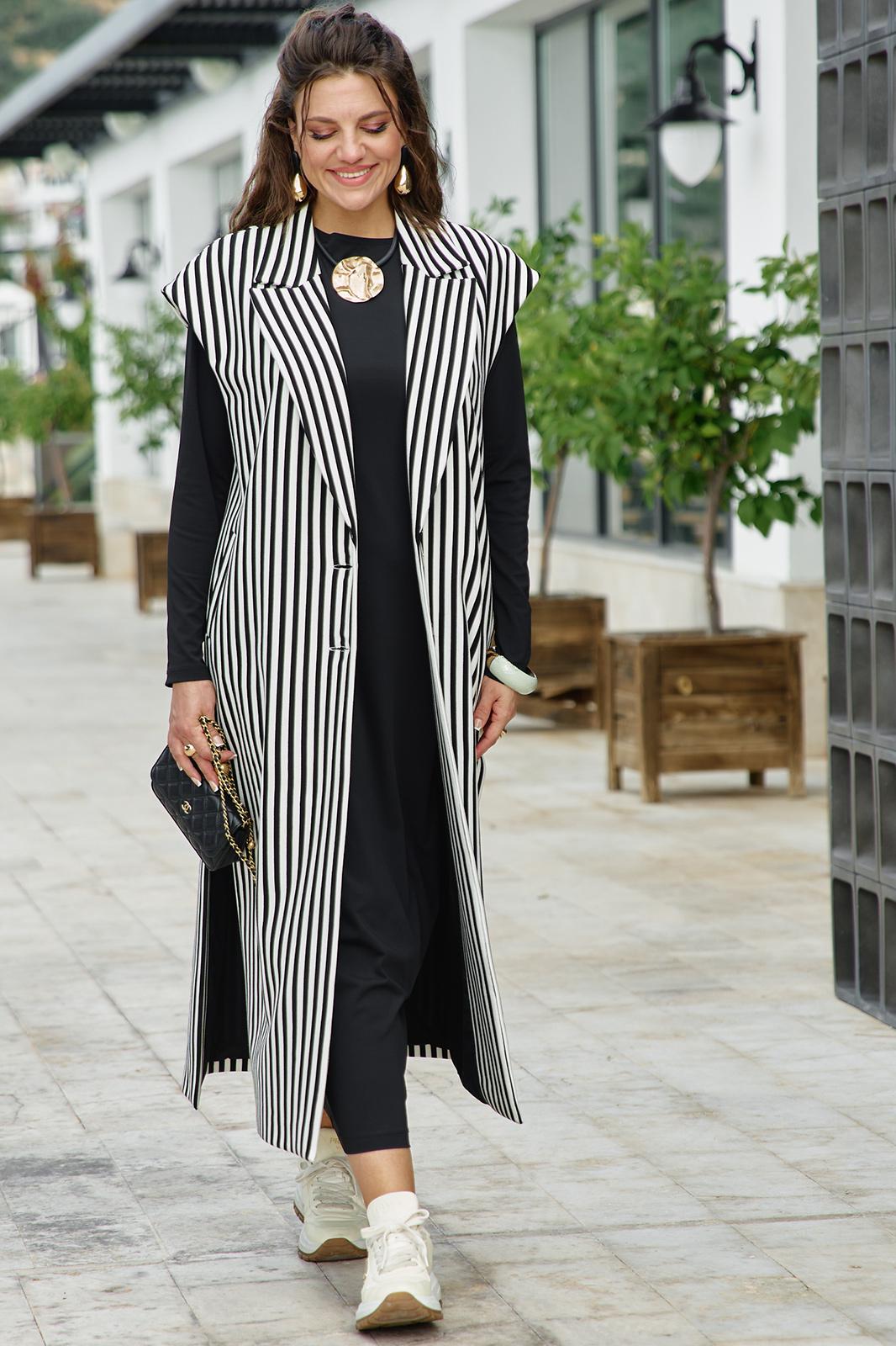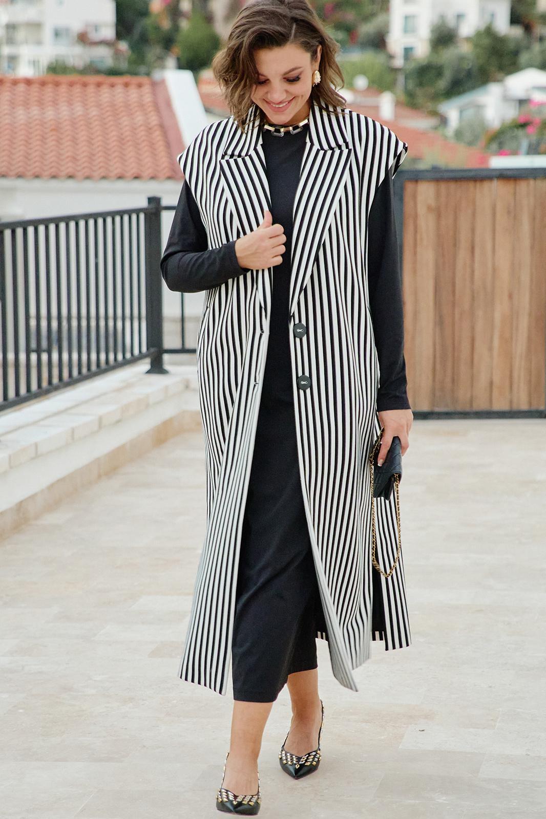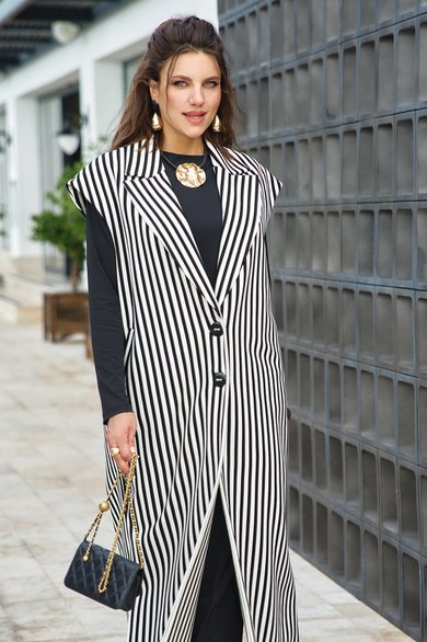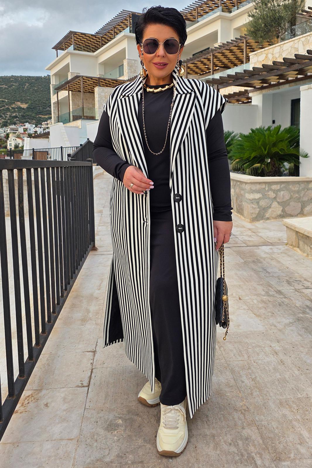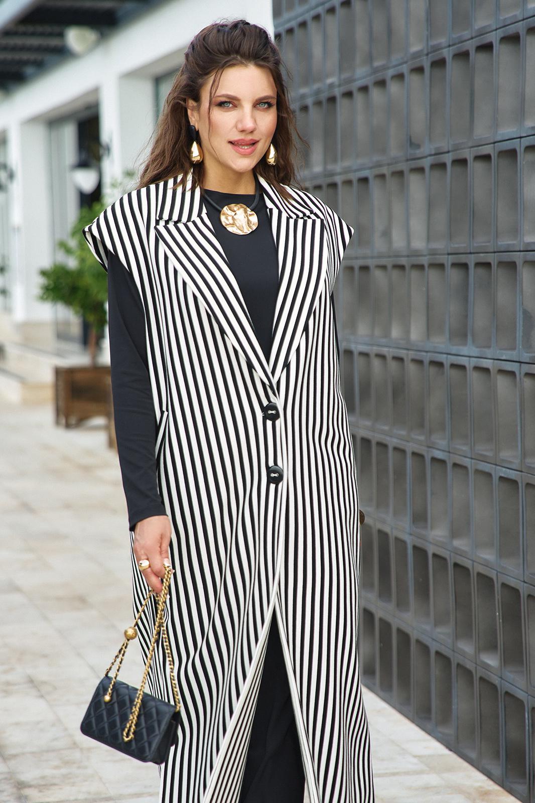 Как отдельная единица гардероба жилет миди в чёрно‑белую полоску — это минимализм с характером: он диктует ритм, задаёт форму и оставляет место для вашей интерпретации. Чёрно‑белая полоска — не просто орнамент, а ритм. Вертикальные полосы удлиняют фигуру, горизонтальные — играют с пропорциями. Наденьте его — и мир уже реагирует на новый аккорд вашего стиля. Жилет прямого силуэта, длины «миди», свободный с отложным воротником пиджачного типа и застёжкой на декоративные пуговицы по борту. Линия плеча спущенная, в боковых швах высокие разрезы. По переду жилета прорезные карманы с листочкой. Спинка со средним швом. Жилет на подкладке. За счёт вертикальной полоски силуэт визуально вытягивается, делая образ более стройным. Длина жилета 124 см (р 50-54), 125 см (р 56-60), ширина плеча 21 см (р 50-54), 22 см (р 56-60).