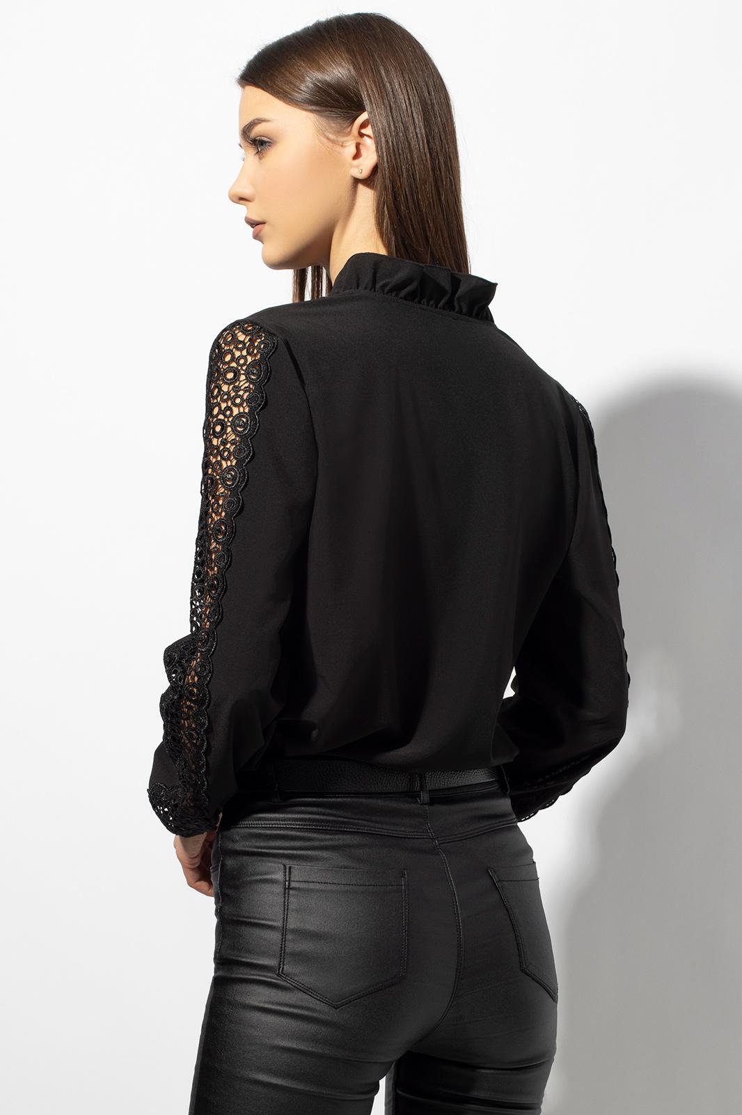 Блуза женская делового стиля прямого силуэта. Перед из двух частей с нагрудными выточками. Спинка цельная. По центру переда и горловине вставлена рюша. Рукав втачной из двух частей по центру с настроченным кружевам. Низ рукава на эластичной тесьме. Длина изделия: (р.44, 46, 48) - 59см. Длина рукава: (р.44, 46, 48) - 62см. Длина изделия: (р.50, 52, 54) - 61см. Длина рукава: (р.50, 52, 54) - 63см.