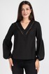 Блузка женская, полуприлегающего силуэта. Перед цельный, с нагрудными выточками. Горловина V-образной формы с отделкой из кружева. Спинка цельная. Рукав втачной из двух частей, нижняя часть присборена сверху и снизу. Низ рукава на эластичной тесьме. Длина изделия (р.44, 46, 48): 58 см. Длина изделия: (р.50, 52, 54): 60 см. Длина изделия: (р.56, 58, 60): 62 см. Длина рукава: 61 см.
