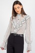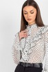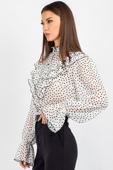 Шифоновая блузка с принтом — это воплощение лёгкости и женственности. Передняя часть изделия оформлена центральной бортовой застёжкой на 8 петель и пуговиц: это не только обеспечивает удобство ношения, но и придаёт модели классический шарм. Нагрудные выточки и кокетка создают безупречную посадку по фигуре, а вставленные в шов кокетки рюши добавляют романтичности и утончённости.