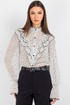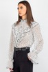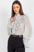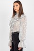 Спинка блузки выполнена цельной. Втачной рукав со сборкой по окату подчёркивает линию плеча и придаёт силуэту мягкость, а присборенная на эластичную тесьму нижняя часть рукава создаёт изящный акцент и обеспечивает комфортную посадку на запястье. Завершает дизайн горловина со стойкой и рюшей — этот элемент делает образ более нарядным.