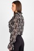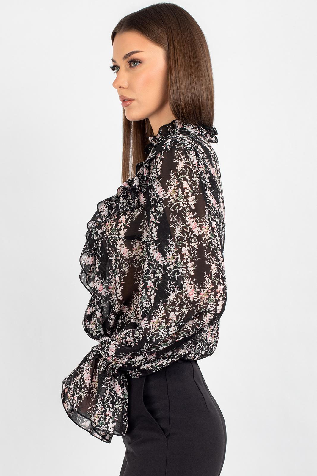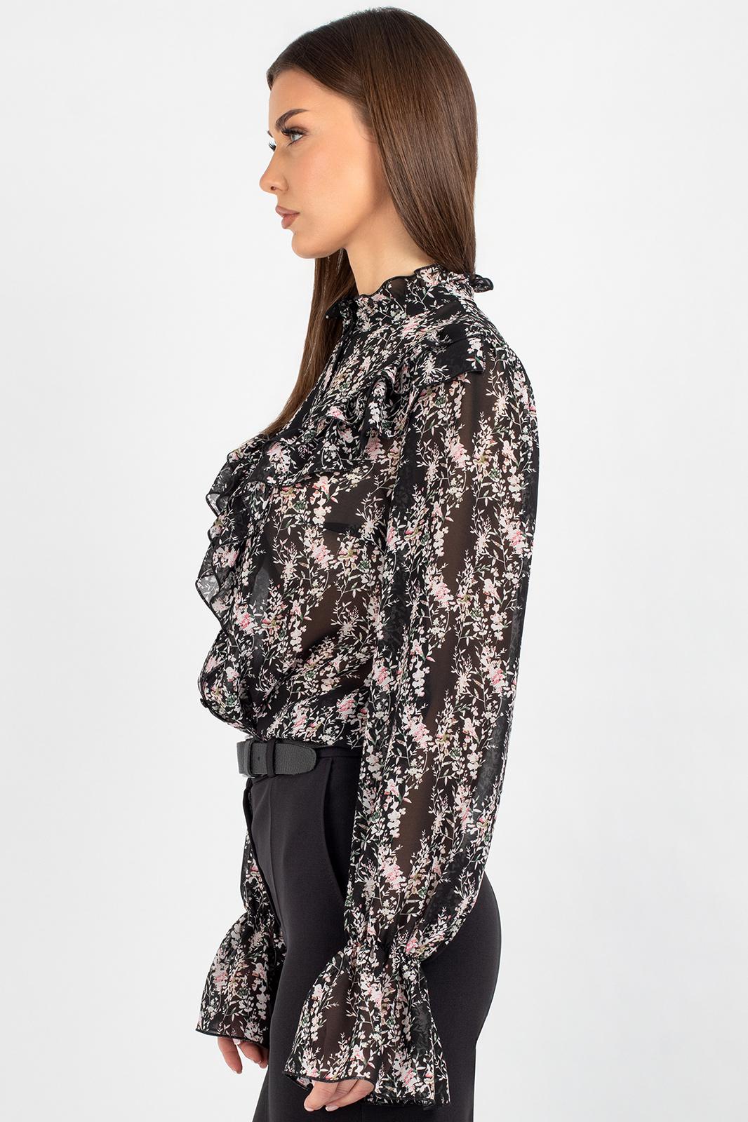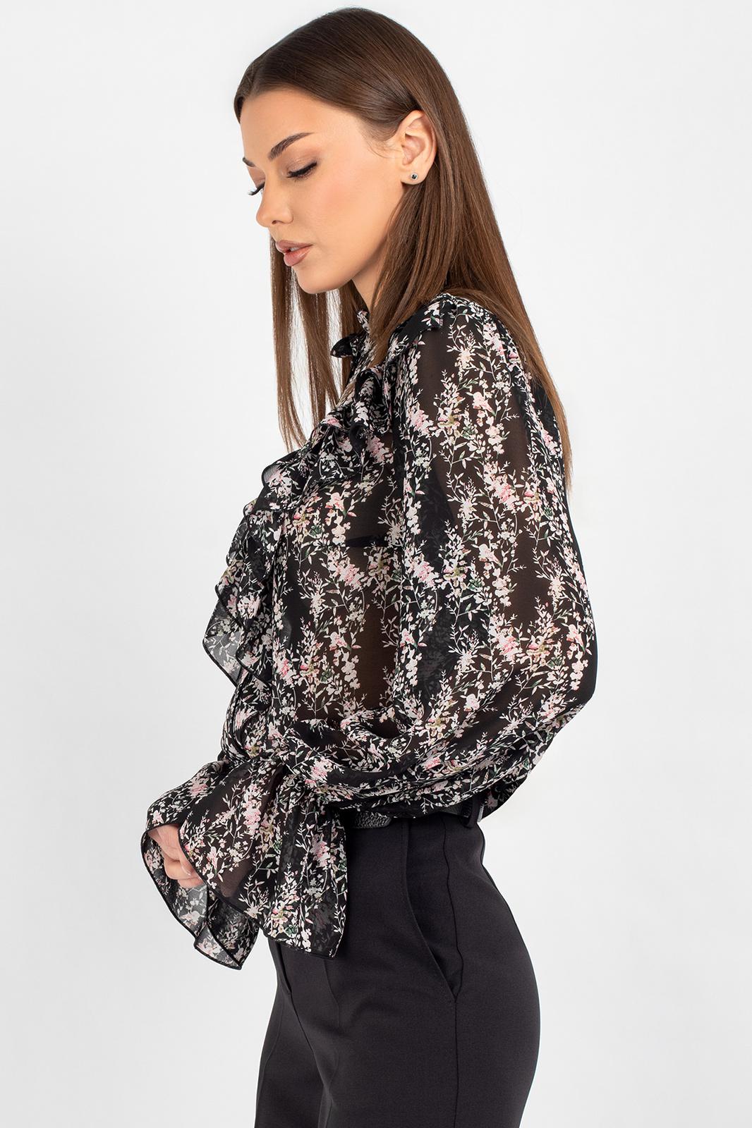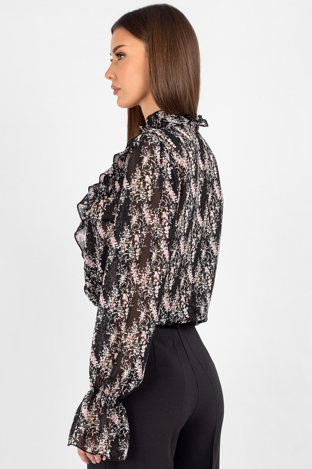 Шифоновая блузка с принтом — это воплощение лёгкости и женственности. Передняя часть изделия оформлена центральной бортовой застёжкой на 8 петель и пуговиц: это не только обеспечивает удобство ношения, но и придаёт модели классический шарм. Нагрудные выточки и кокетка создают безупречную посадку по фигуре, а вставленные в шов кокетки рюши добавляют романтичности и утончённости.