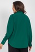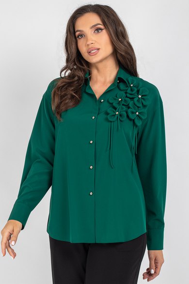 Блузка женская, прямого силуэта со спущенным плечом. Перед из двух частей с центральной бортовой застежкой на 6 петель и пуговицу. Отделочным элементом блузки является 5 цветков, настроченные пуговицами. Спинка цельная. Рукав с притачной манжетой, застегивающейся на 1 петлю и пуговицу. Воротник рубашечного типа с отложной стойкой.