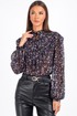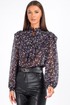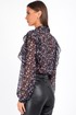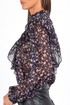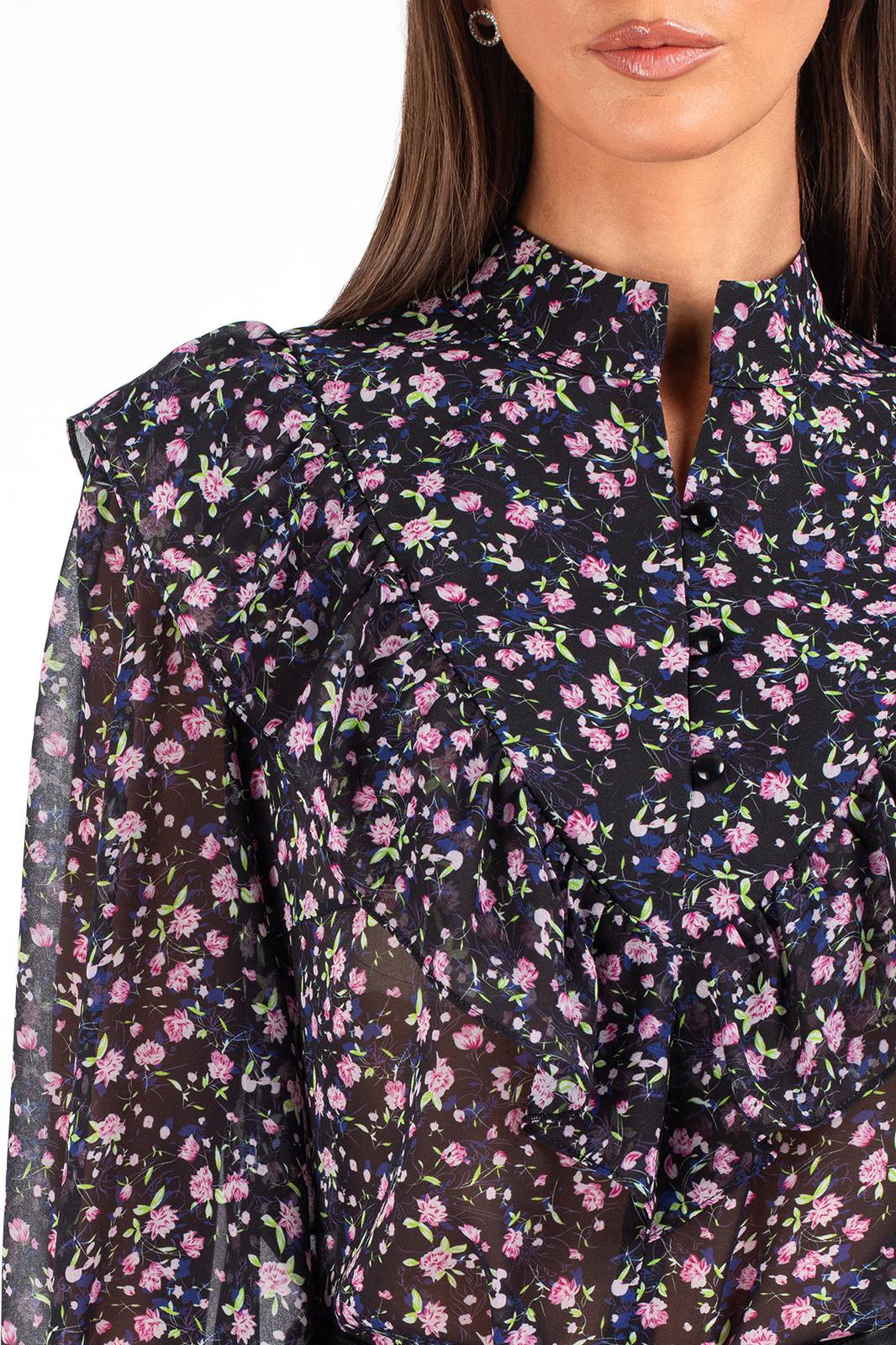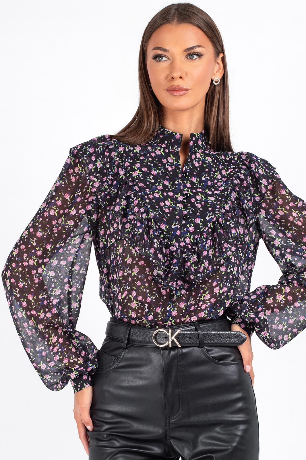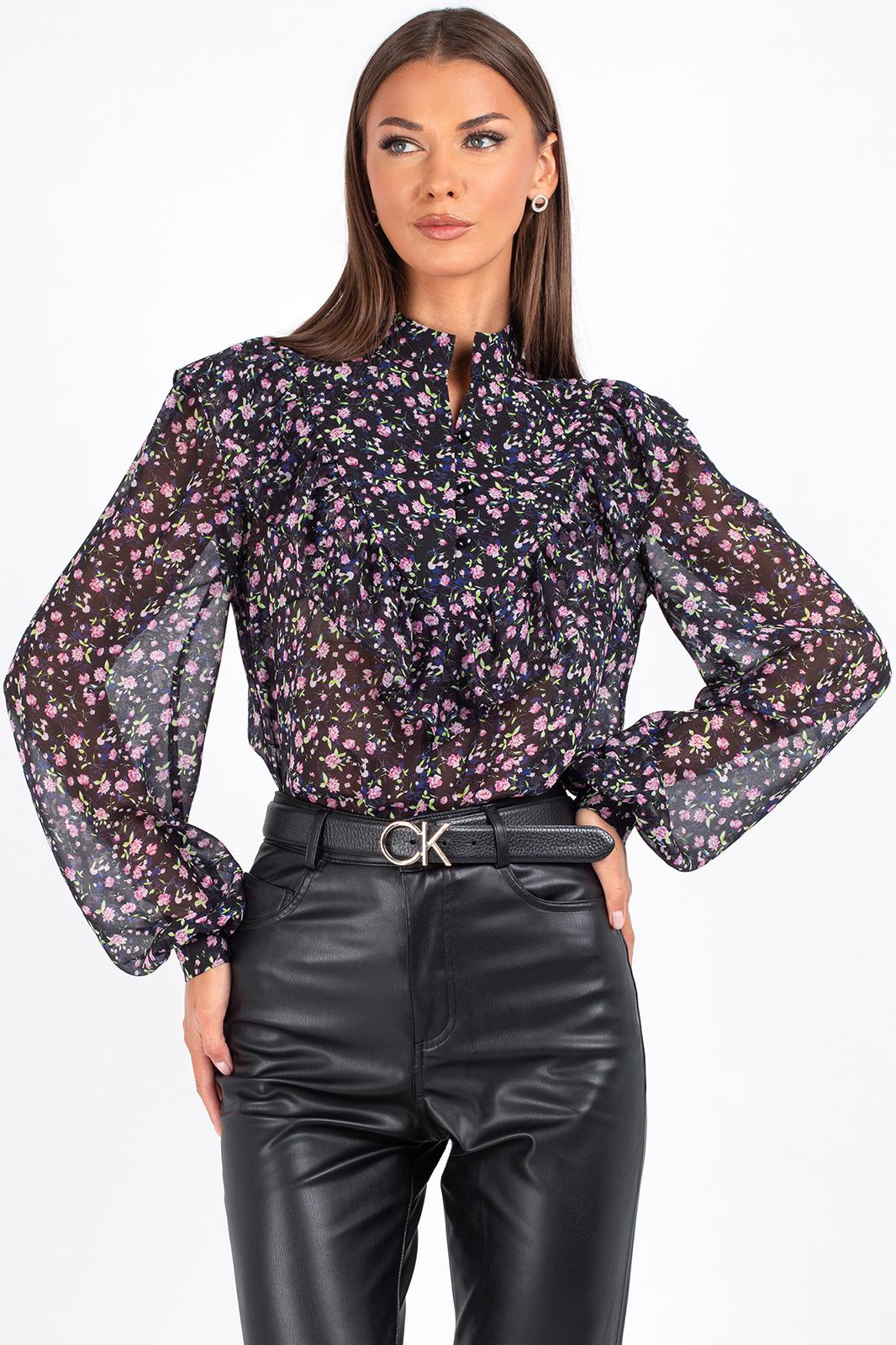 Блузка с длинным рукавом выполнена из ткани с цветочным принтом — мелкие розовые, сиреневые и зелёные цветы на чёрном фоне создают эффект глубины и утончённости. Идеально сочетается с кожаными брюками, юбками и классическими джинсами.