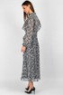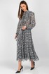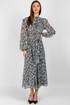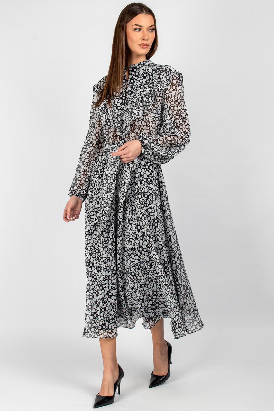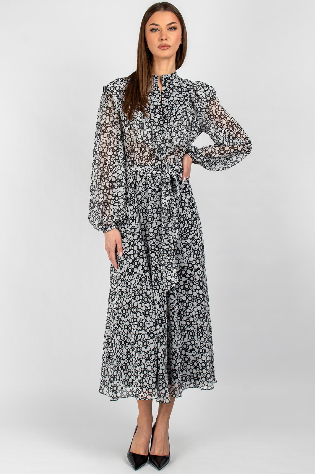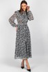 Втачные одношовные рукава с изящной сборкой у оката и эластичными манжетами идеально сидят по фигуре, не стесняя движений. Воротник-стойка придаёт платью строгий, но женственный вид, а завязывающийся пояс позволяет регулировать объём талии, создавая желаемые пропорции.