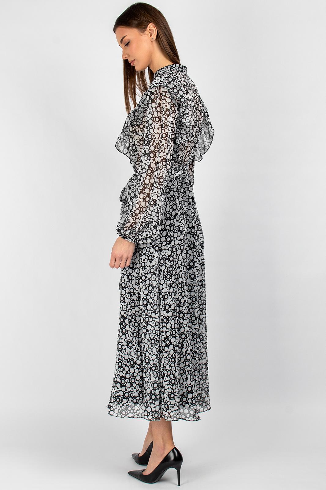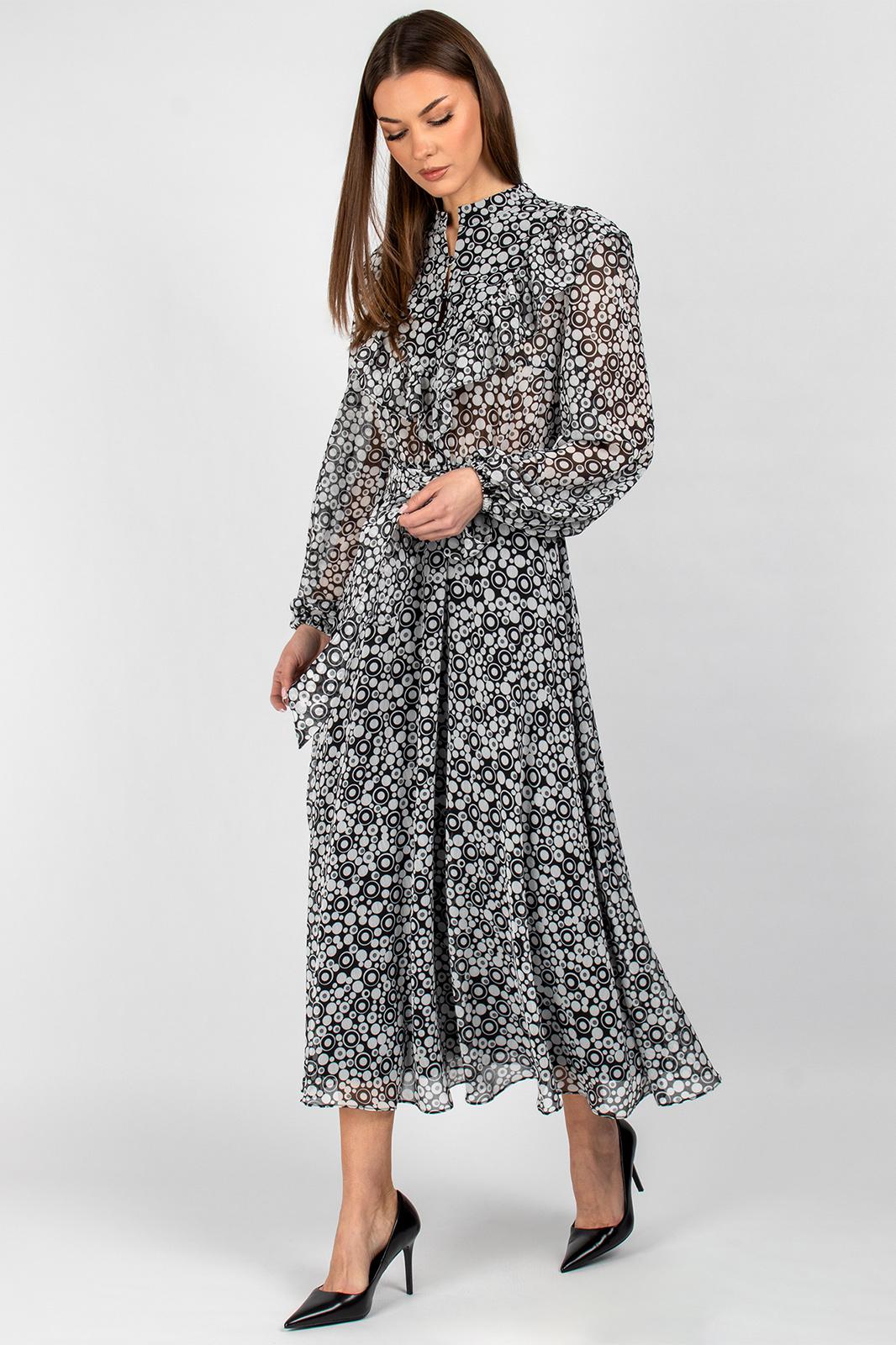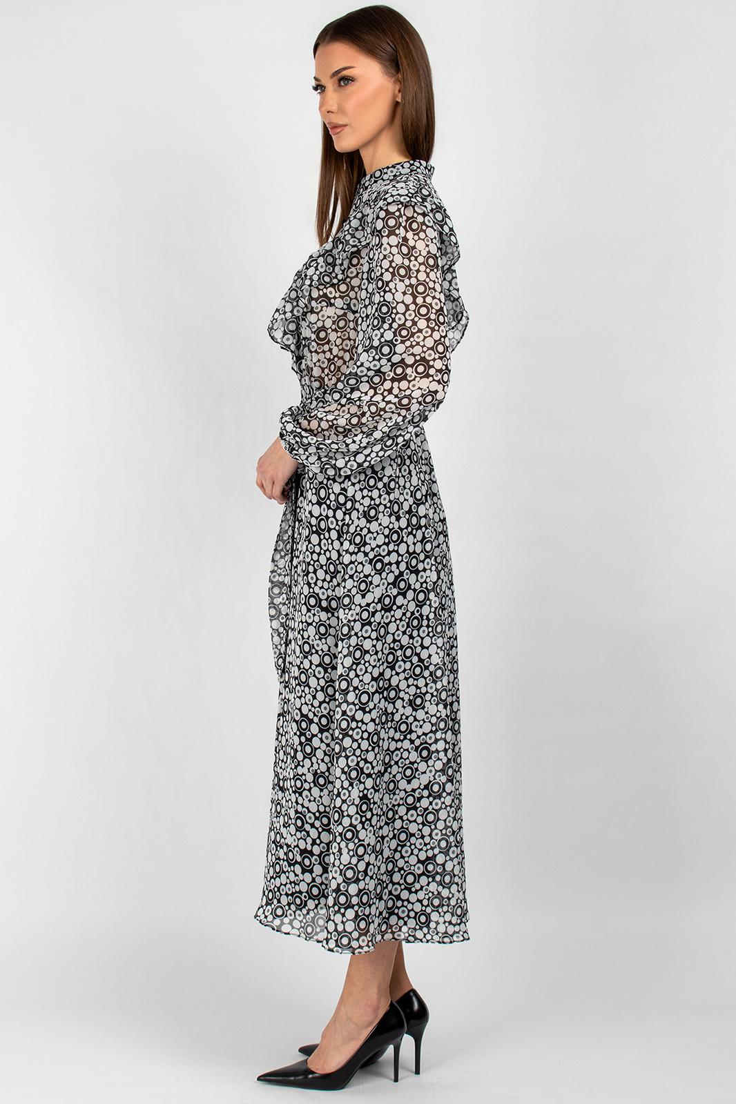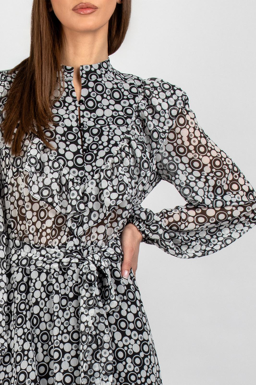 Универсальная модель прекрасно подходит для создания как романтичных, так и деловых образов. Воздушная шифоновая ткань обеспечивает комфорт, а продуманный крой делает платье подходящим для разных типов фигуры. Декоративные элементы в виде рюш и рельефов создают неповторимый образ, при этом практичная конструкция позволяет чувствовать себя уверенно в любой ситуации.