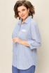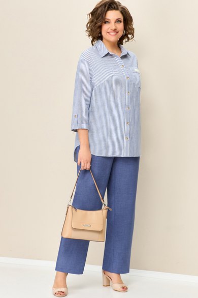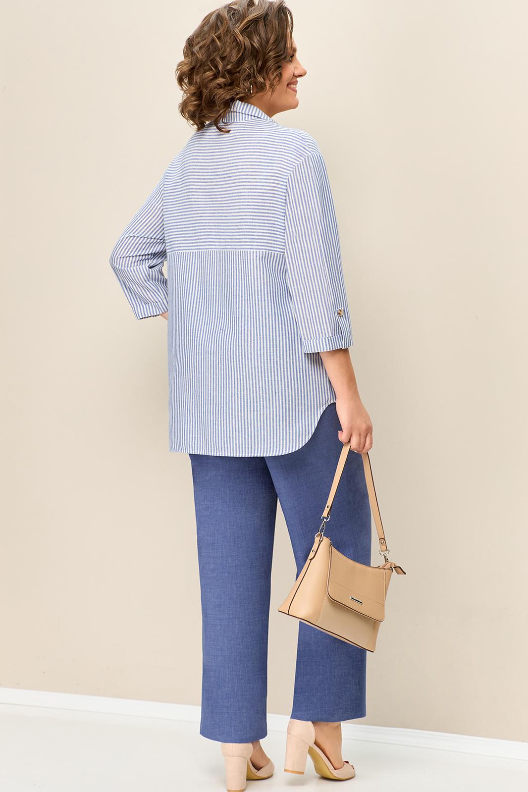 Красивая удлиненная блуза с рисунком полоска из ткани на основе льна с полукруглыми вырезами.. Длина блузы по центру спинки- 67см. Рукав втачной, слегка спущенный 3/4. Длина рукава 51 см.Брюки прямые с высокой посадкой, с притачным поясом на резинке. Длина брюк по боковому шву- 102см.