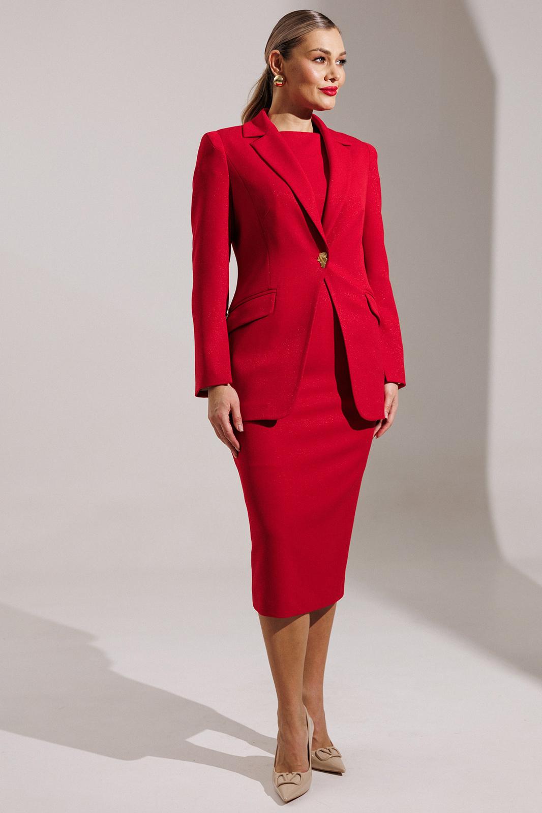 - Классические деловые. Это брючные и юбочные комплекты со строгим кроем и четкими линиями. Костюмы выполнены из плотных, держащих форму тканей, глубоких оттенков. В коллекциях представлены также комплекты с платьем или сарафаном.