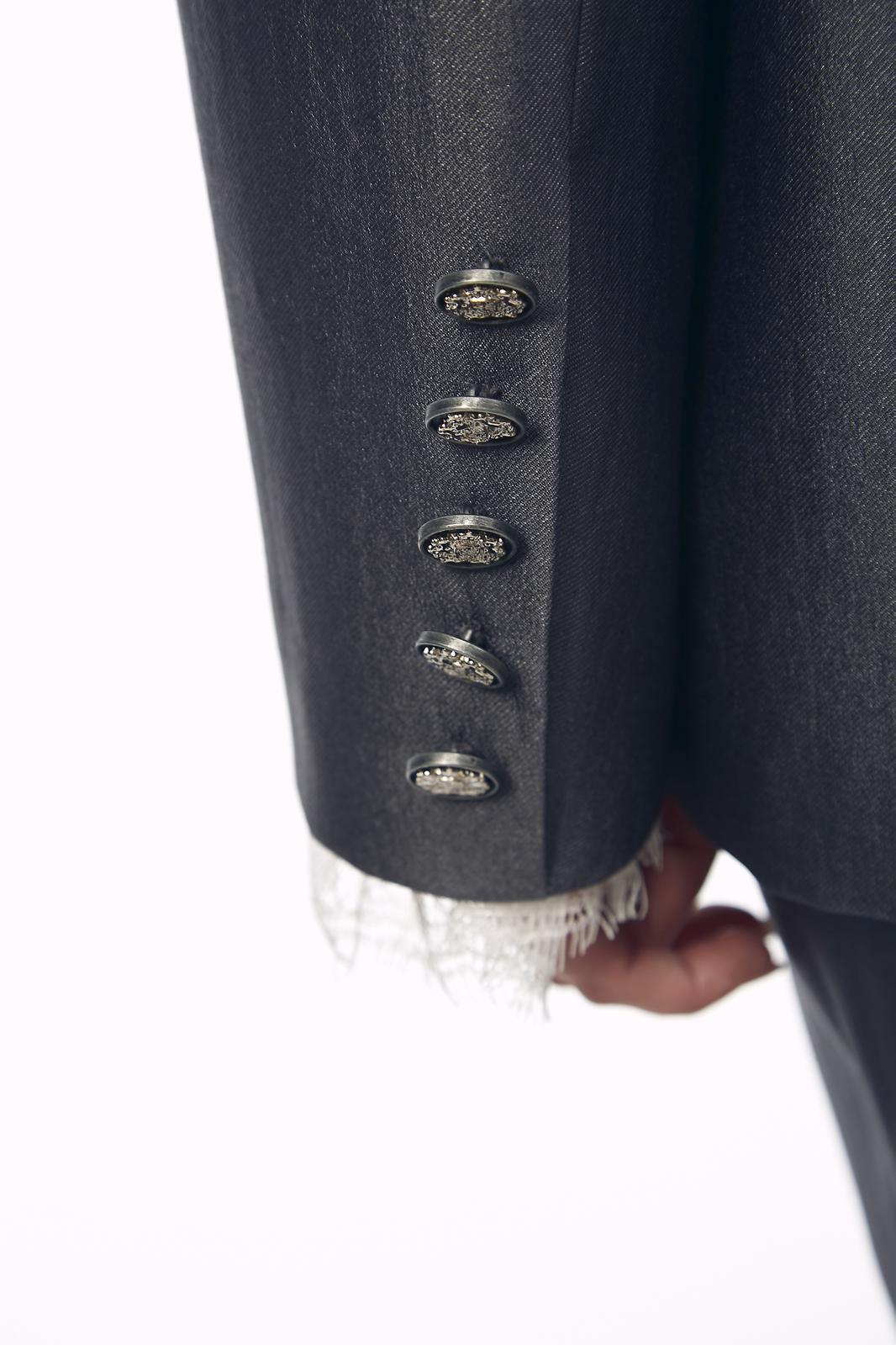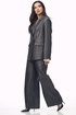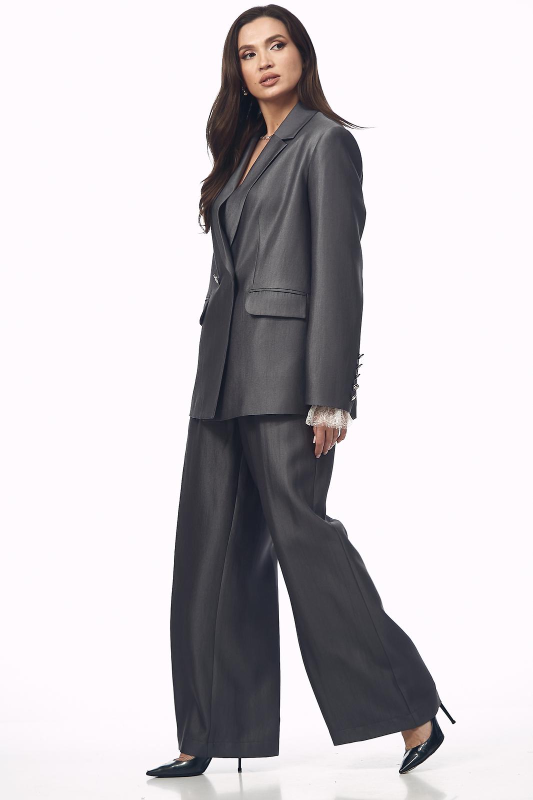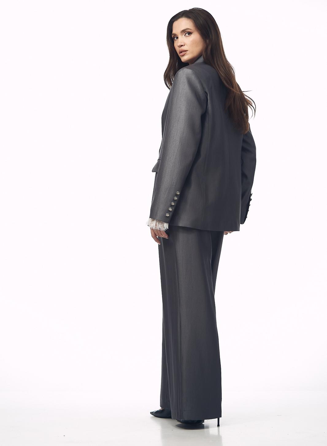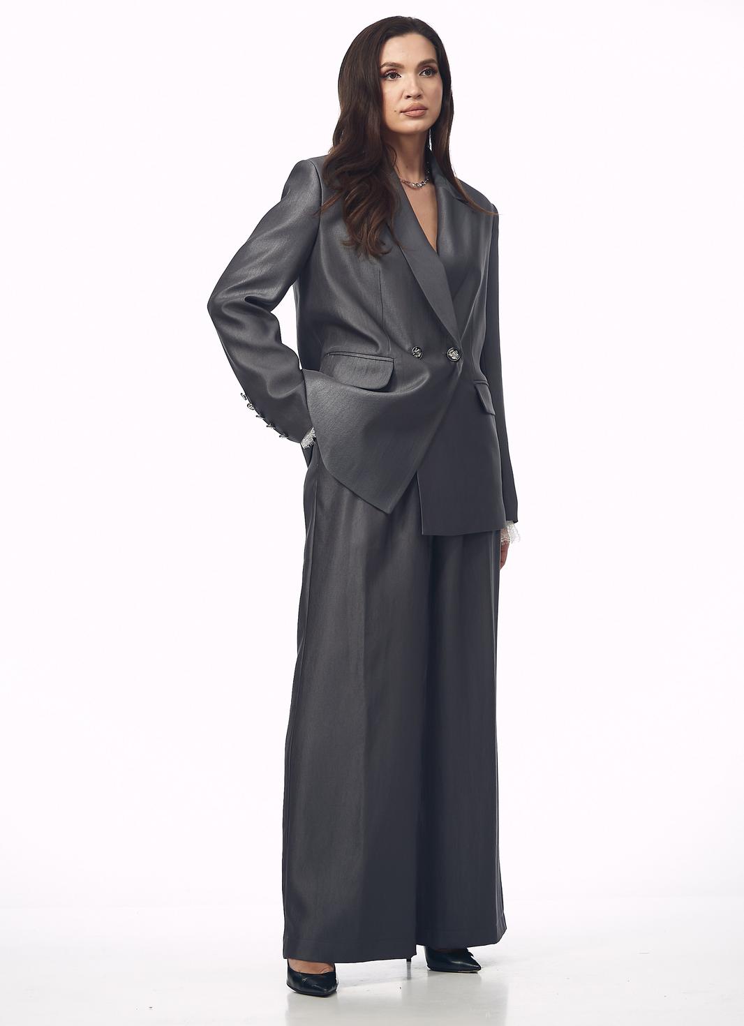 Элегантный женский брючный костюм из высококачественной ткани с деликатным блеском. Жакет объемный (оверсайз), двубортный прямого силуэта. Застегивается на две декоративные пуговицы. По бокам расположены функциональные прорезные карманы с клапанами. Рукав втачной со шлицей и декоративными пуговицами. Длина рукава от плеча для роста 164 см 61 см, для роста 170 см 63 см. Длина жакета от плеча по спинке для роста 164 см 70 см, для роста 170 см 72 см. Брюки широкие на притачном поясе со шлевками, по задней части с резинкой. В боковых швах расположены карманы. Застегиваются на «гульфик» и крючок. Длина брюк от талии для роста 164 см 107 см, для роста 170 см 110 см. В комплекте манжеты с нежным кружевом, которое кокетливо выглядывает из-под рукавов, добавляя образу женственности.