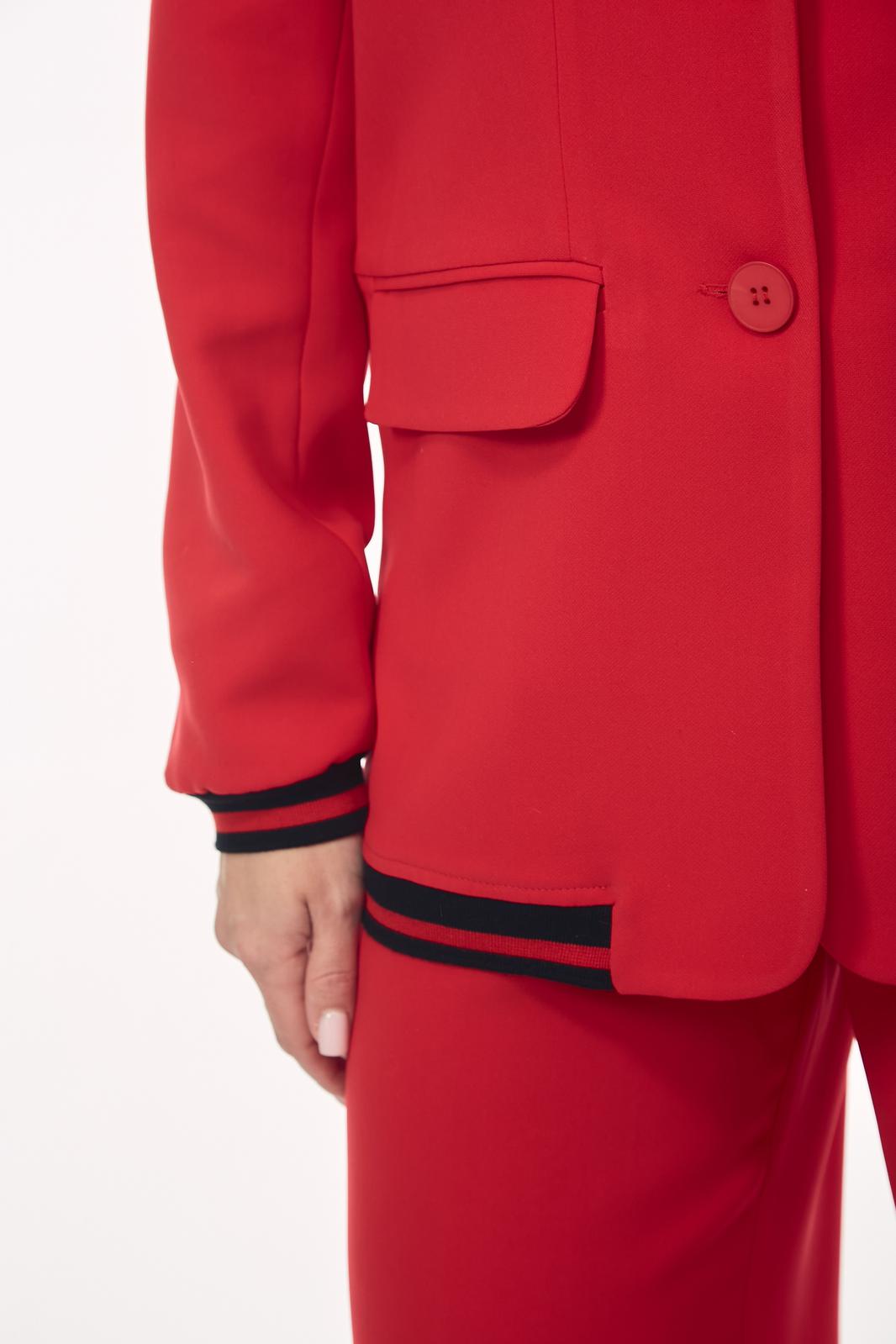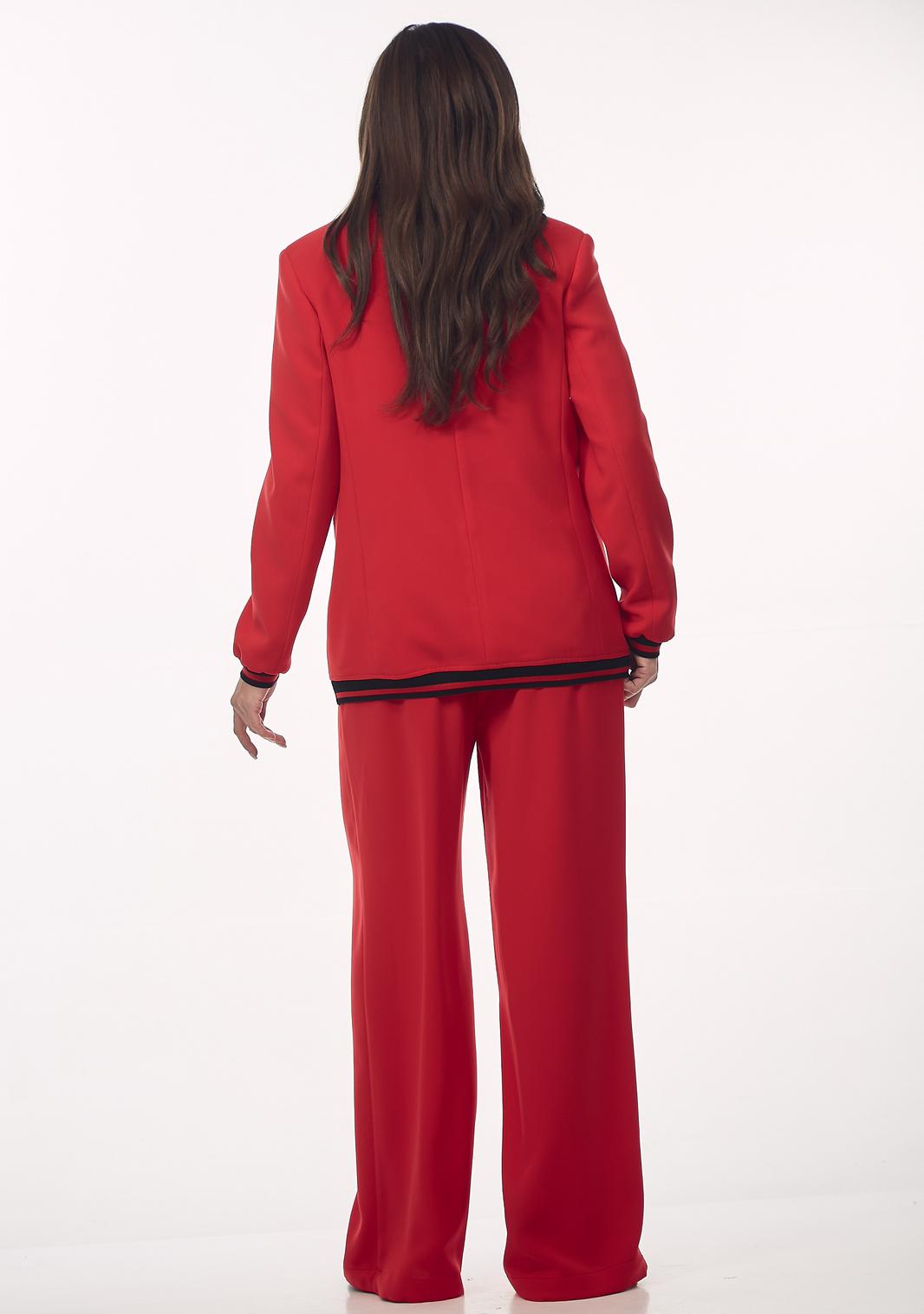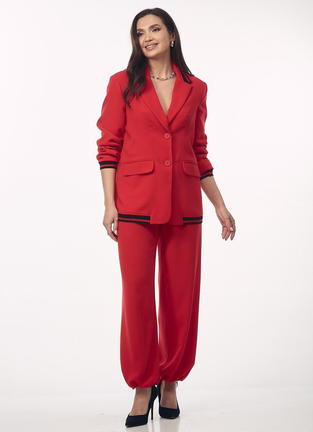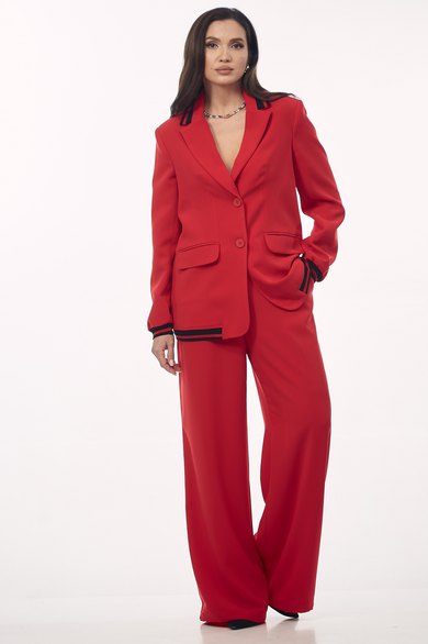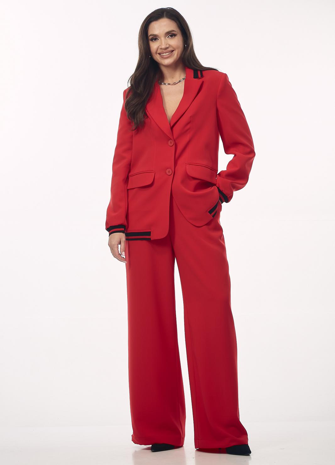 Женский брючный костюм станет стильным и эффектным решением для вашего гардероба. Модель сочетает в себе классический крой с современными спортивными элементами, что делает её универсальной как для офиса, так и для неформальных встреч. Жакет однобортный, прямого силуэта с воротником пиджачного типа и центральной застежкой на пуговицы. Уникальность модели подчеркивают контрастные черно-красные полосатые довязы на воротнике, по низу рукава, и по нижнему краю жакета. Имеются функциональные карманы с клапанами. Рукав втачной. Длина рукава от плеча для роста 164 см 61 см, для роста 170 см 63 см. Длина жакета от плеча по спинке для роста 164 см 70 см, для роста 170 см72 см. Брюки прямые, с карманами в боковых швах. Пояс - довяз. По низу брюк вставлена тесьма-резинка круглая с фиксатором (для изменения формы брюк). Длина брюк от талии для роста 164 см 107 см, для роста 170 см 110 см.