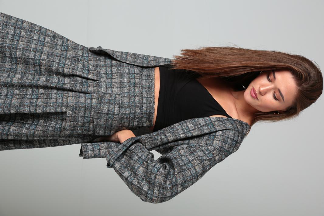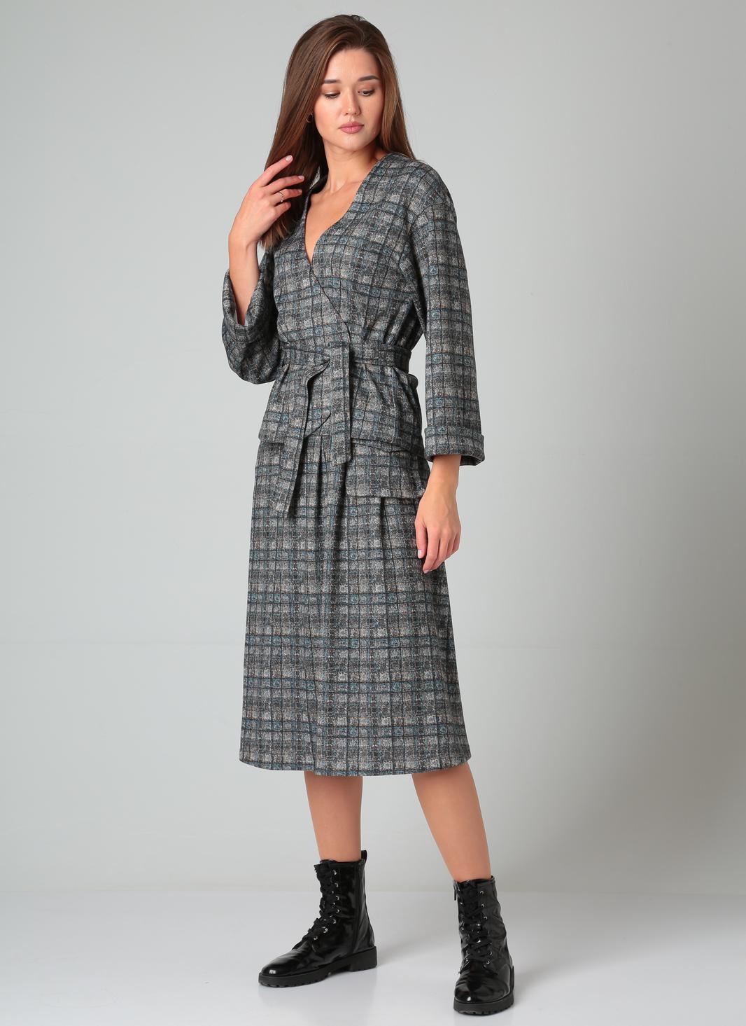 Костюм женский выполнен из трикотажного полотна, состоящий из жакета и юбки. Жакет свободного силуэта без застежки. Рукав втачной со спущенным плечом, заканчивающийся мягкой манжетой. Длина рукава от горловины для роста 164 см 70 см, для роста 170 см 72 см. Длина жакета от плеча для роста 164 см 60 см, для роста 170 см 62 см. Юбка расклешенная к низу, на подкладке. На передней половинке расположены три мягкие складки и навесной карман с клапаном. Застежка «молния» в боковом шве. Длина юбки от пояса для роста 164 см 75 см, для роста 170 см 77 см. Пояс завязывающийся из основной ткани в комплекте.