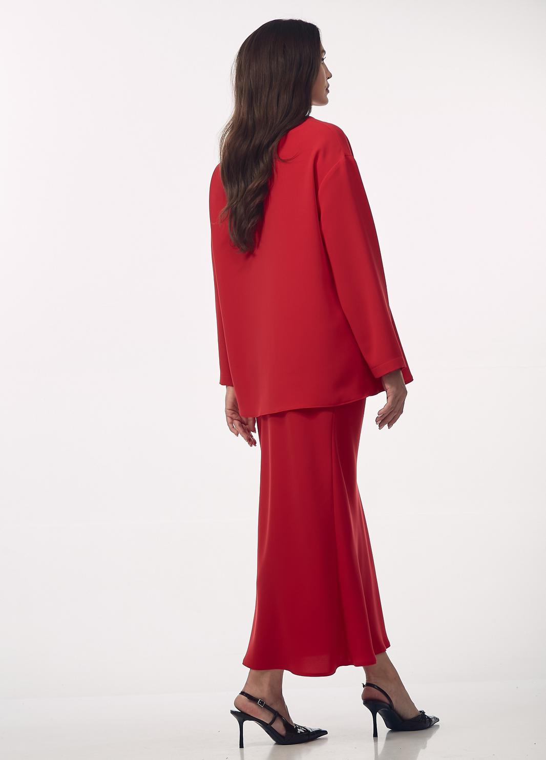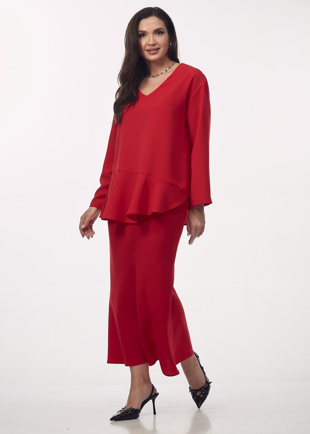 Этот элегантный юбочный костюм-двойка станет ярким акцентом вашего гардероба. Блуза свободного силуэта, с классическим V-образным вырезом горловины, который визуально удлиняет шею. По переду бузы оригинальная асимметричная баска, переходящая в мягкий вертикальный волан. Рукав втачной со спущенным плечом. Длина рукава с плечом для роста 164 см 68 см , для роста 170 см 70 см. Юбка облегающая бедра с расклешение к низу. Пояс на круговой резинке. Длина юбки от талии для роста 164 см 97 см, для роста 170 см100 см.